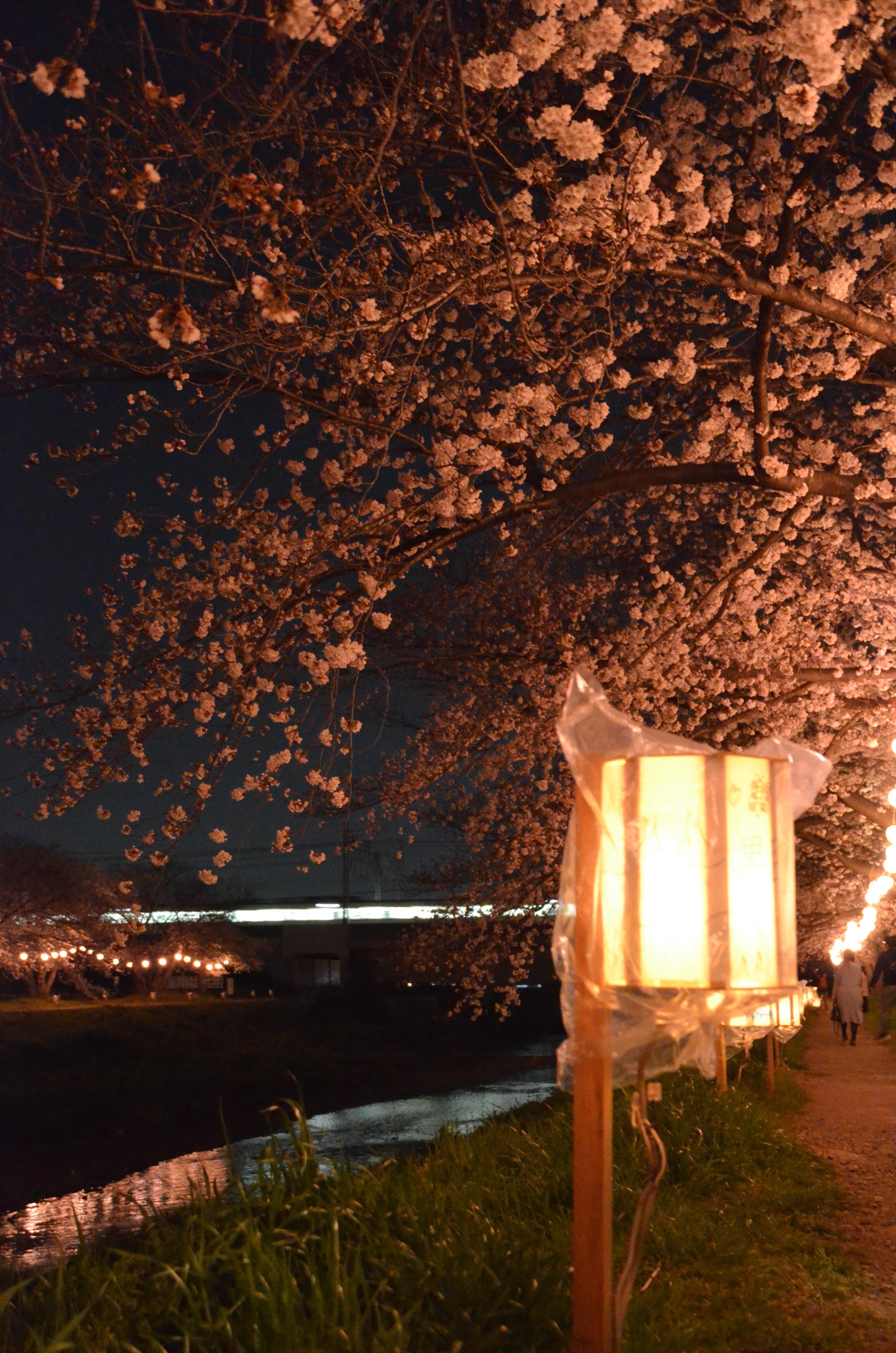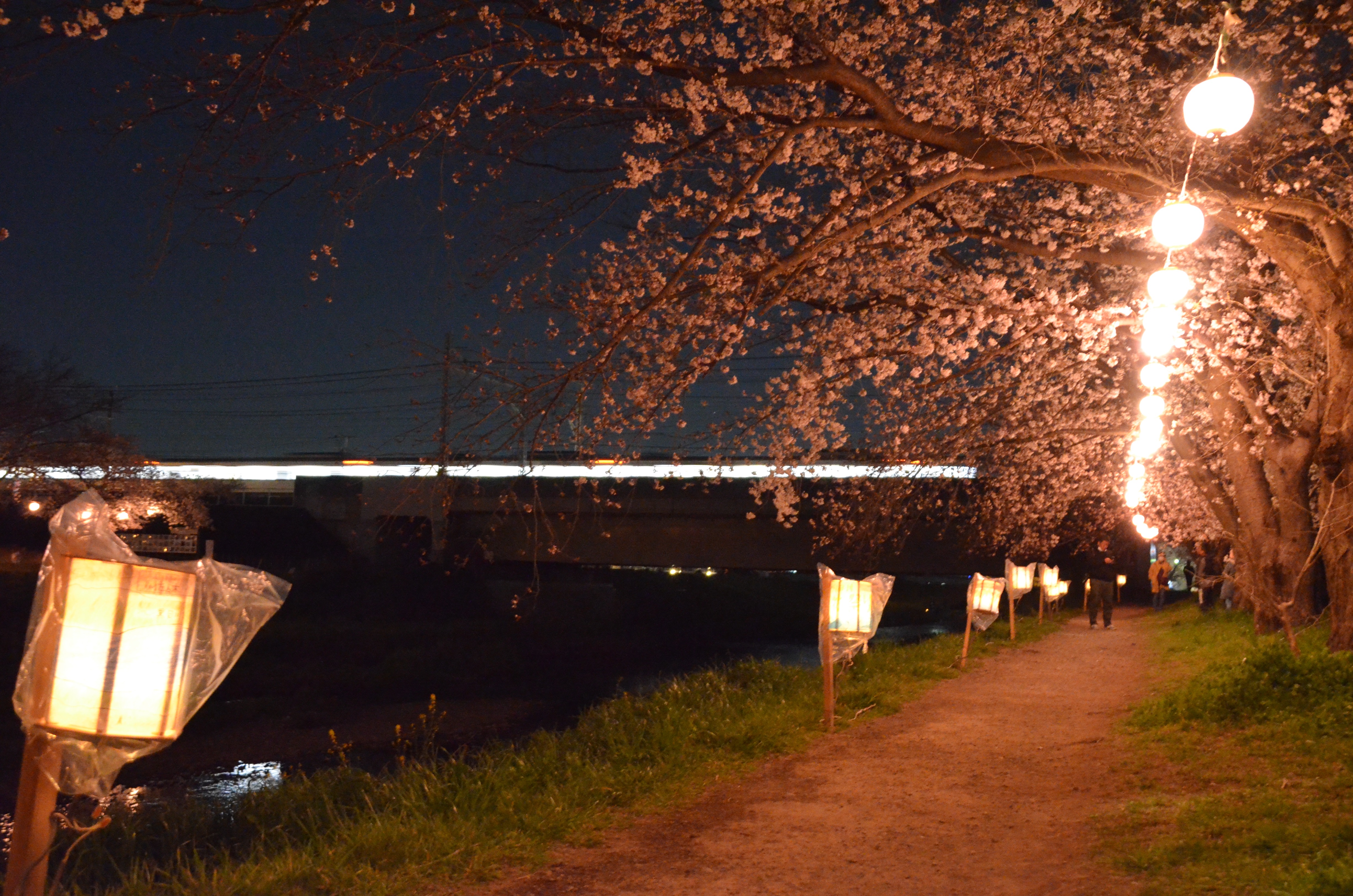 鉄道光が桜並木と共に行く