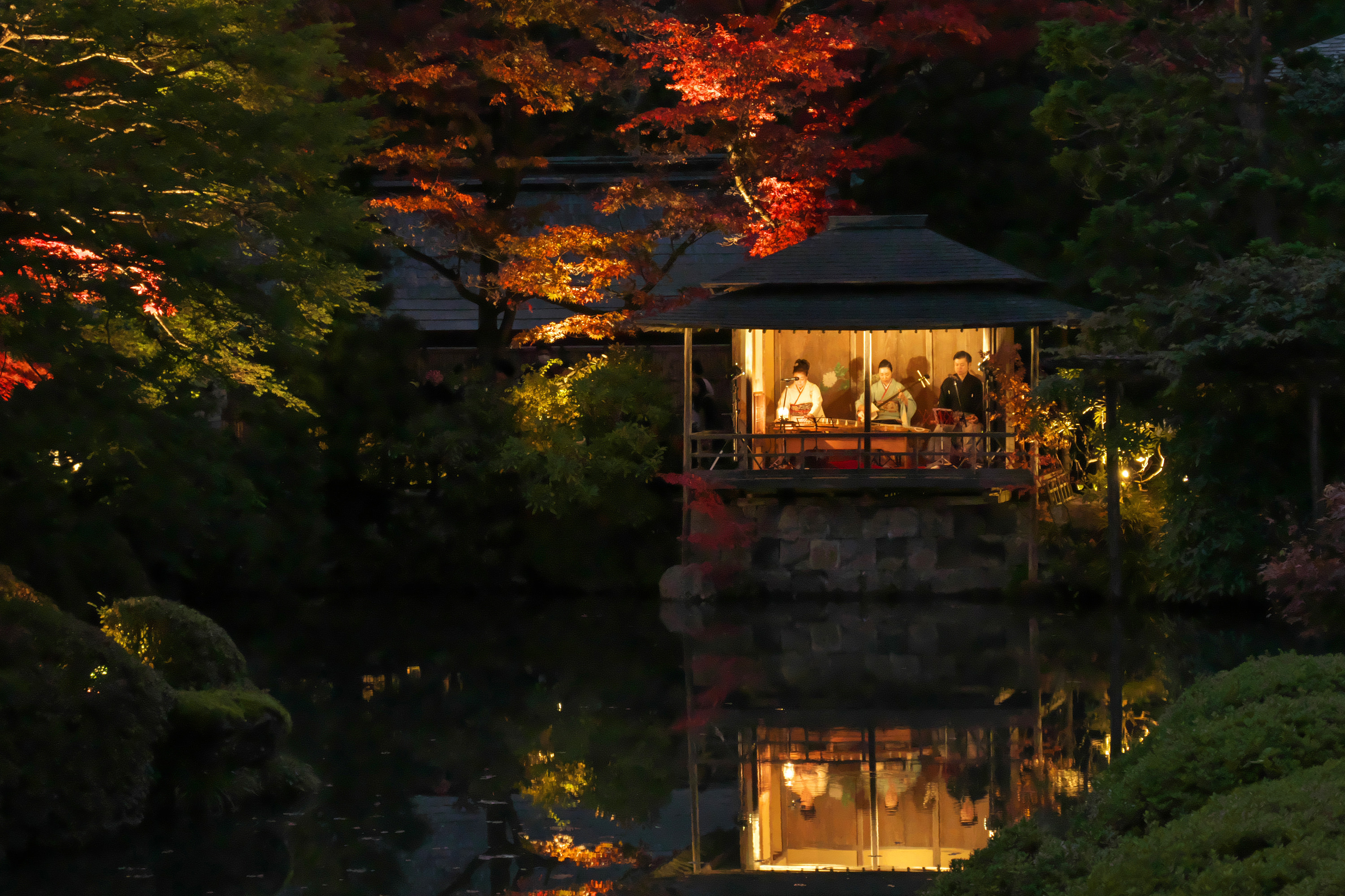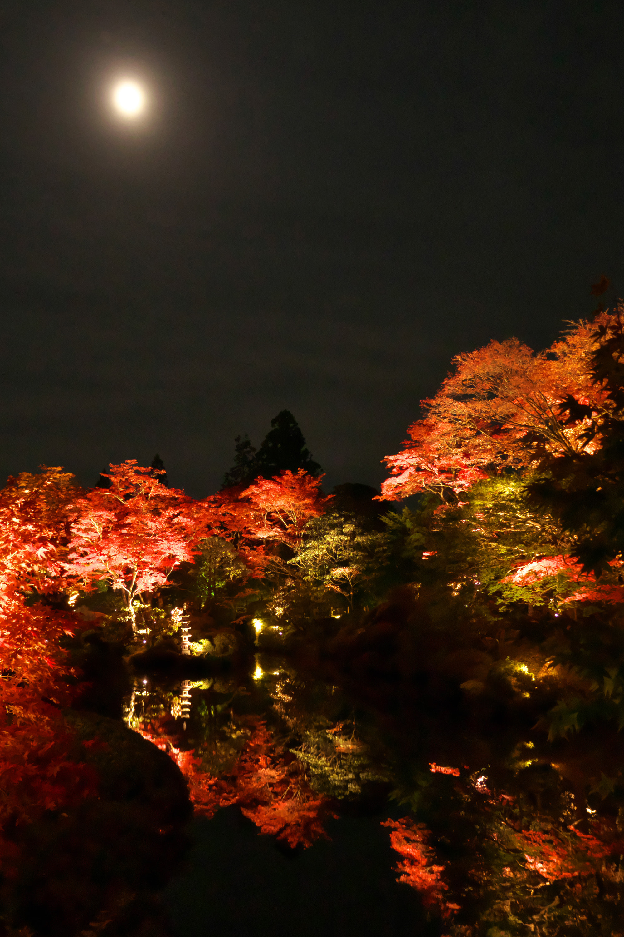 今日はとても良い天気で、明るい日差しが池の周辺の黄葉を照らし、水面に映り込んでいました。