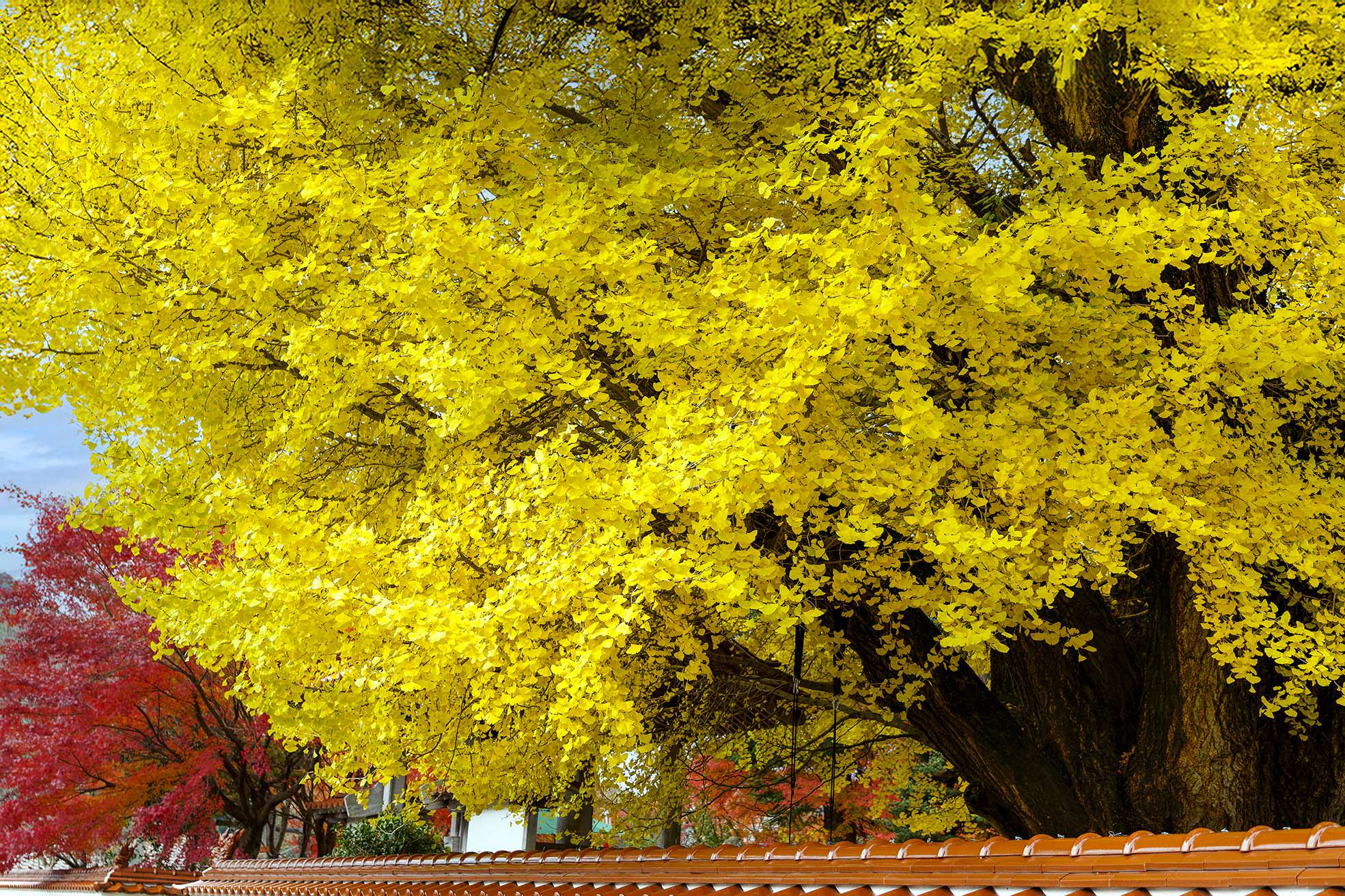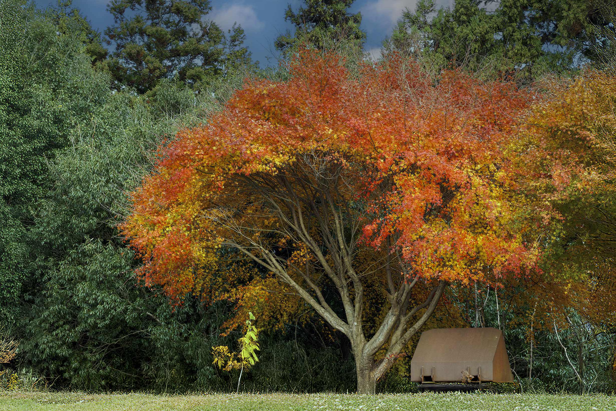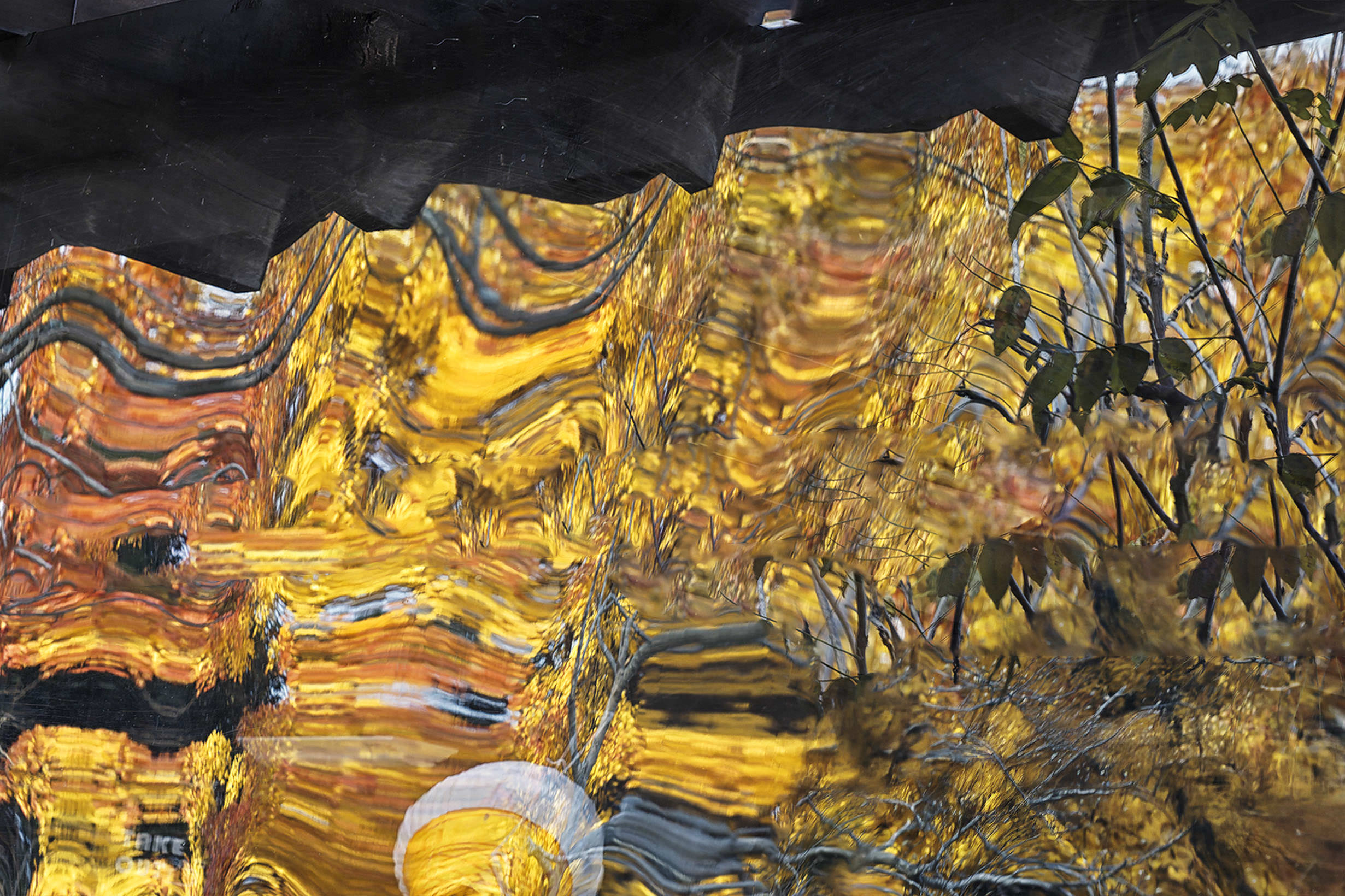 半透明ビニールカバーに映り込んだ紅葉です。