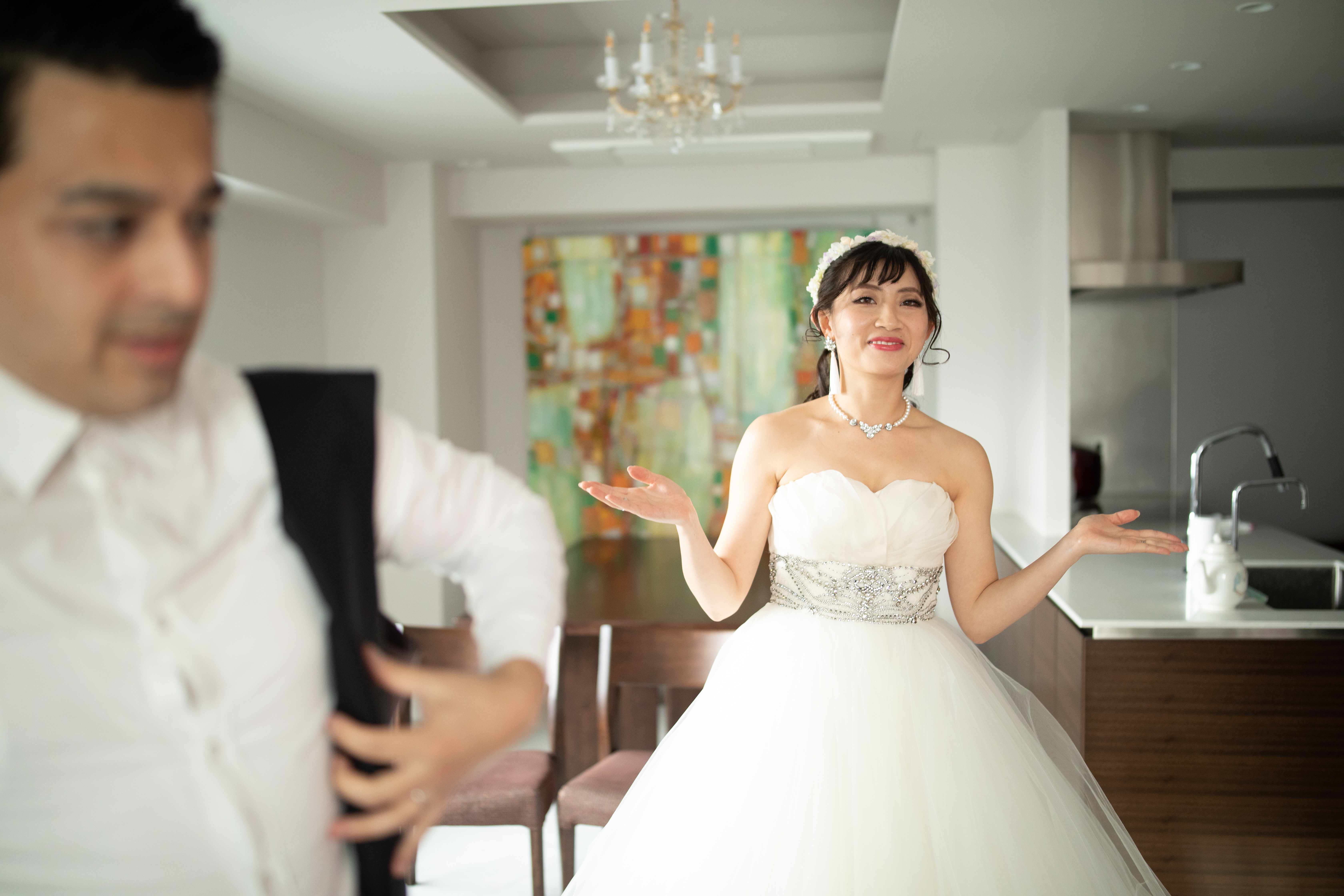 人通りの中でをゆく花嫁と新郎。