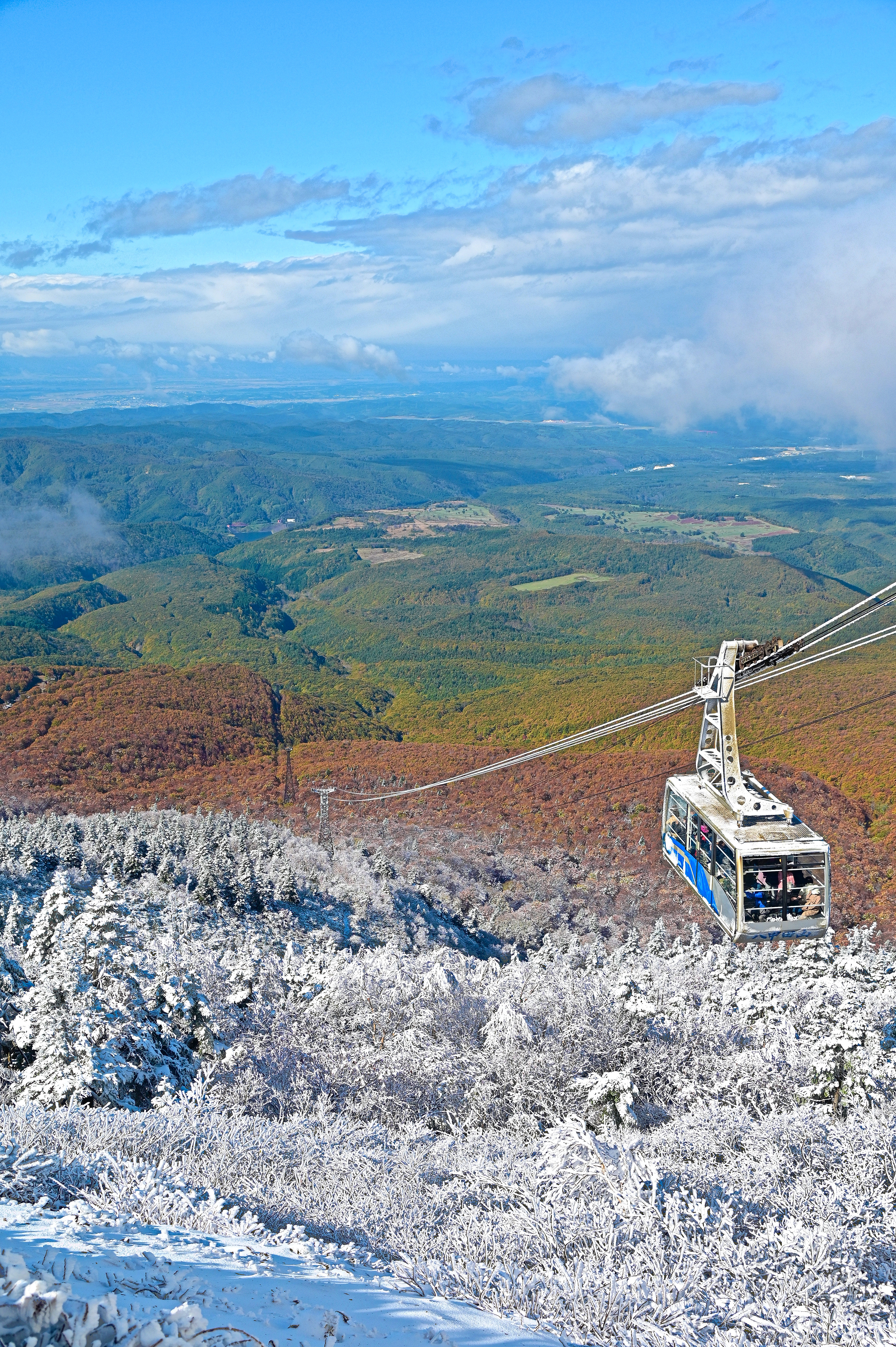樹氷の山頂、紅葉最高潮の中腹、黄色い色付き、緑葉の山麓、青森湾と青空
