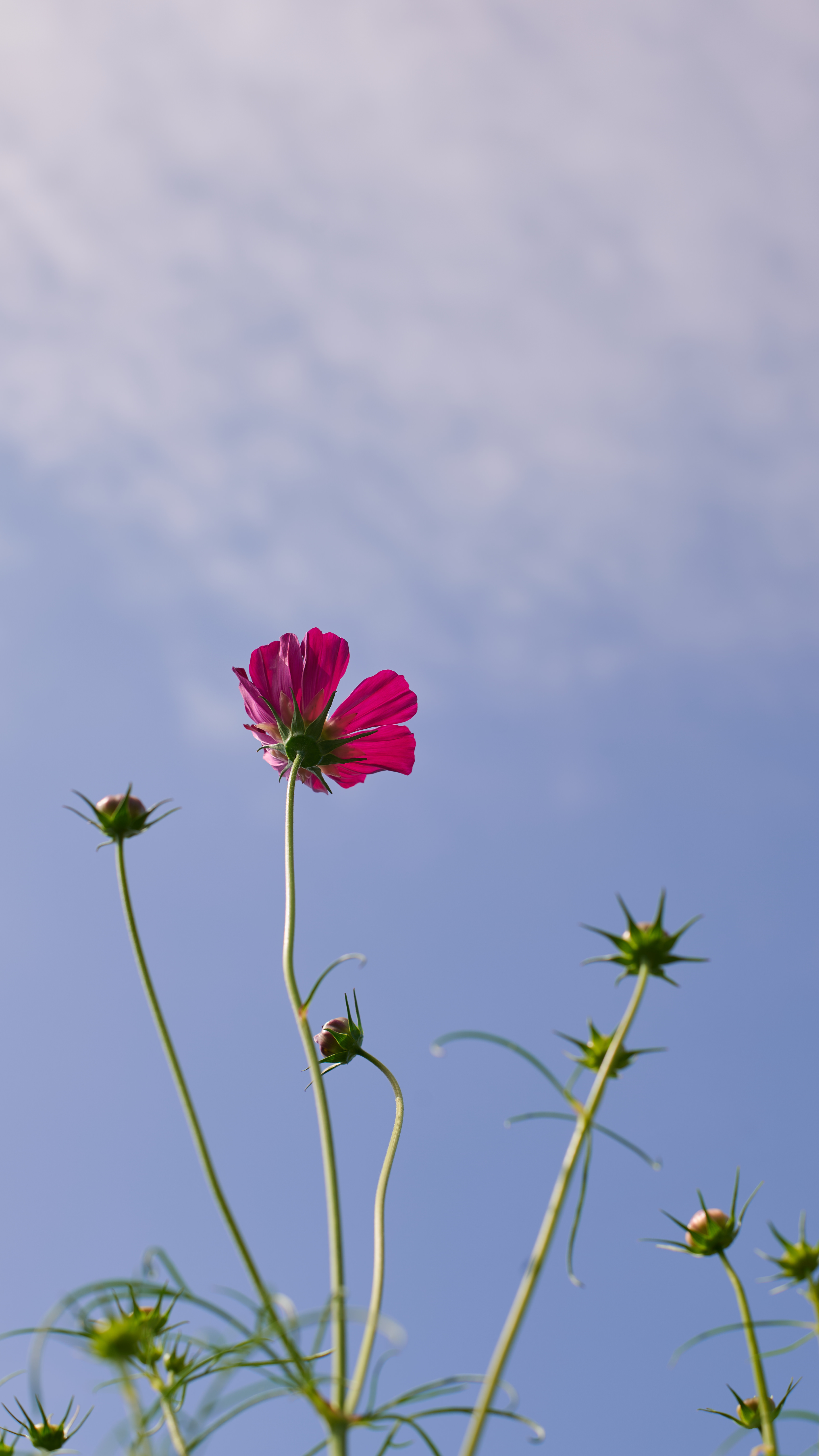コスモス畑に咲き始めた更に伸びる一輪のコスモスと青い空で清々しさを表現しました。
