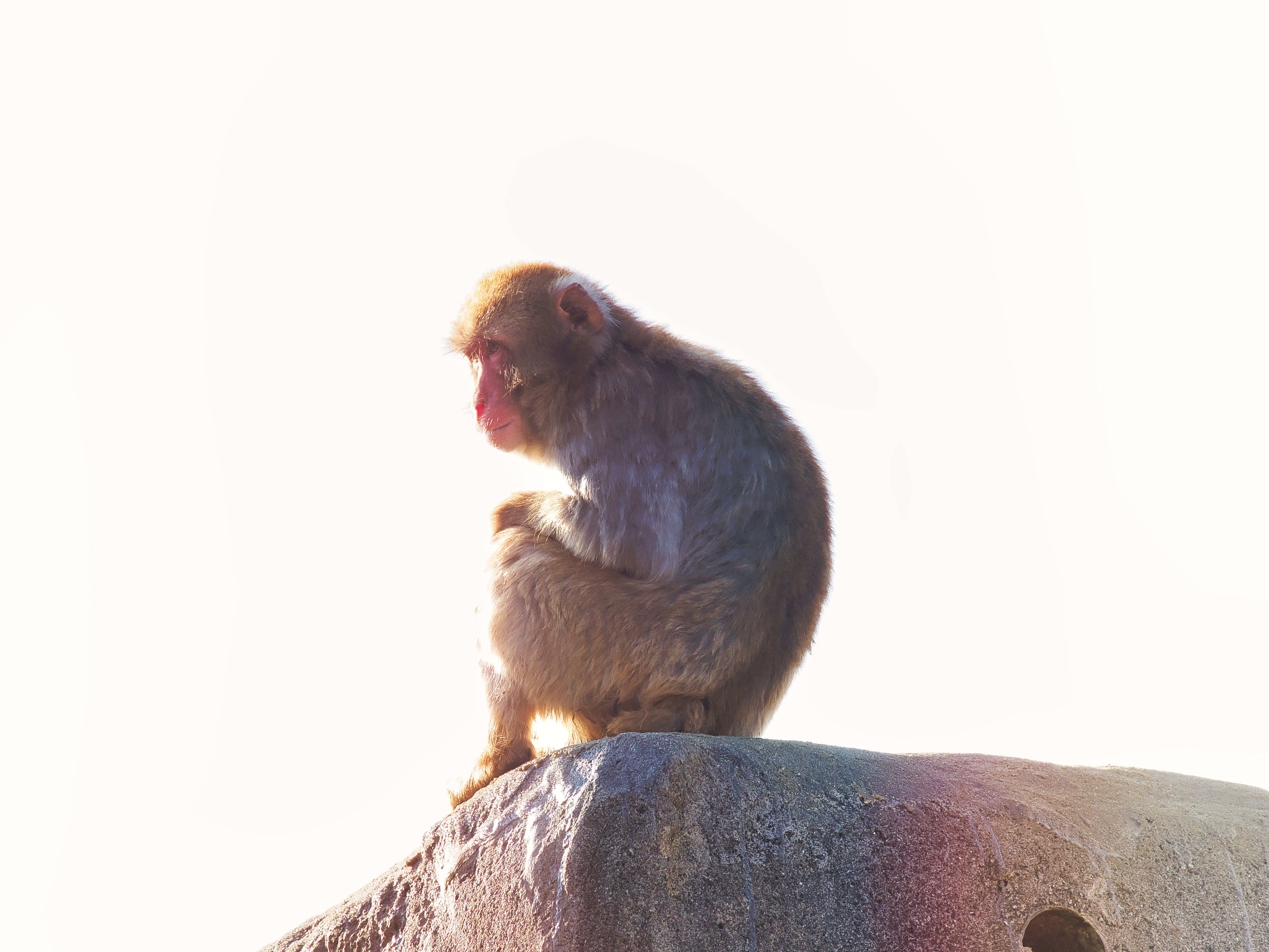 猿山のてっぺんで太陽を浴びている様子だが寒くて縮こまっている様子がなんだか淋しそう