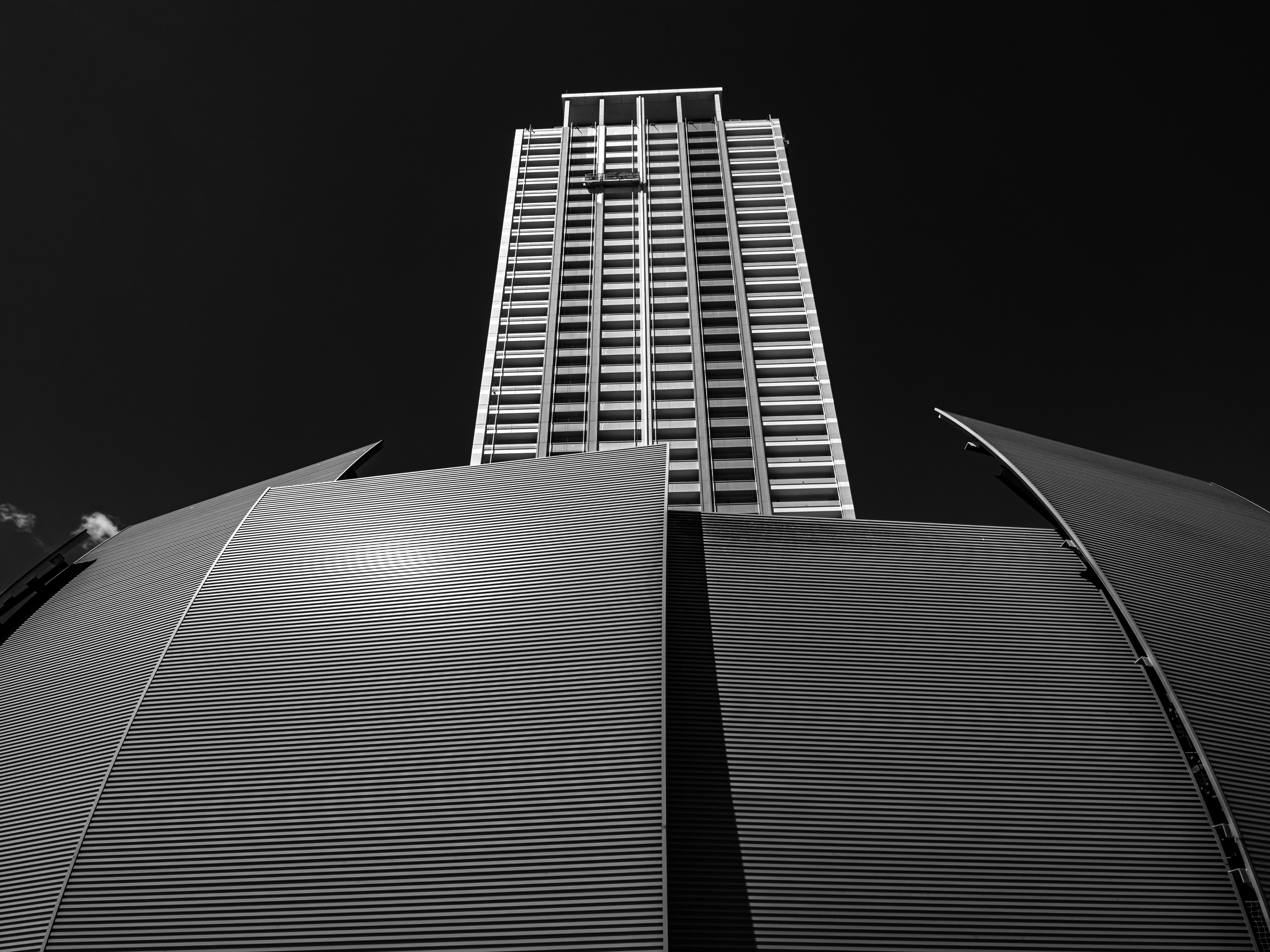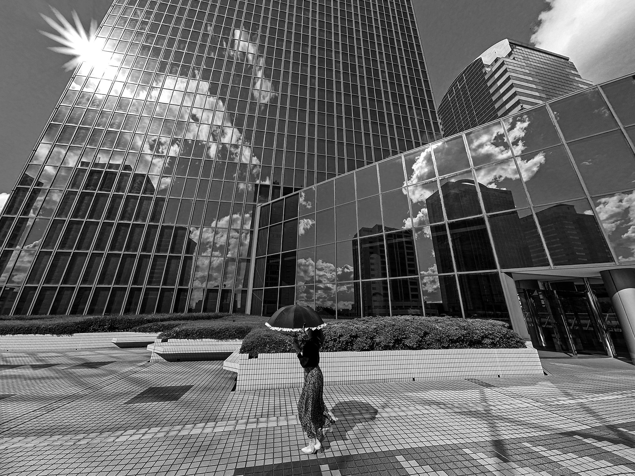 無機質な都市空間に夏の光が注ぐ、階段を登り行く人は一人。