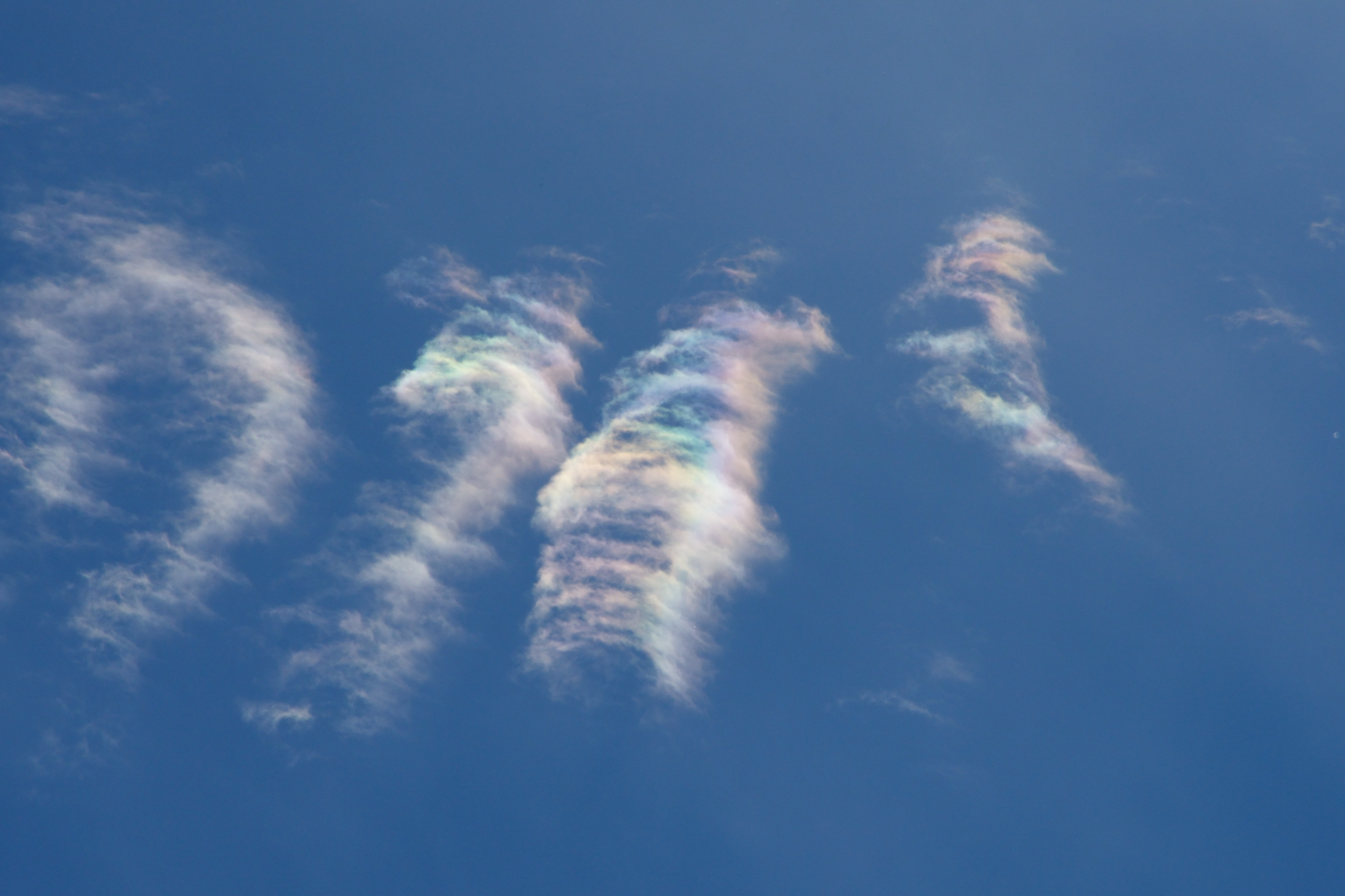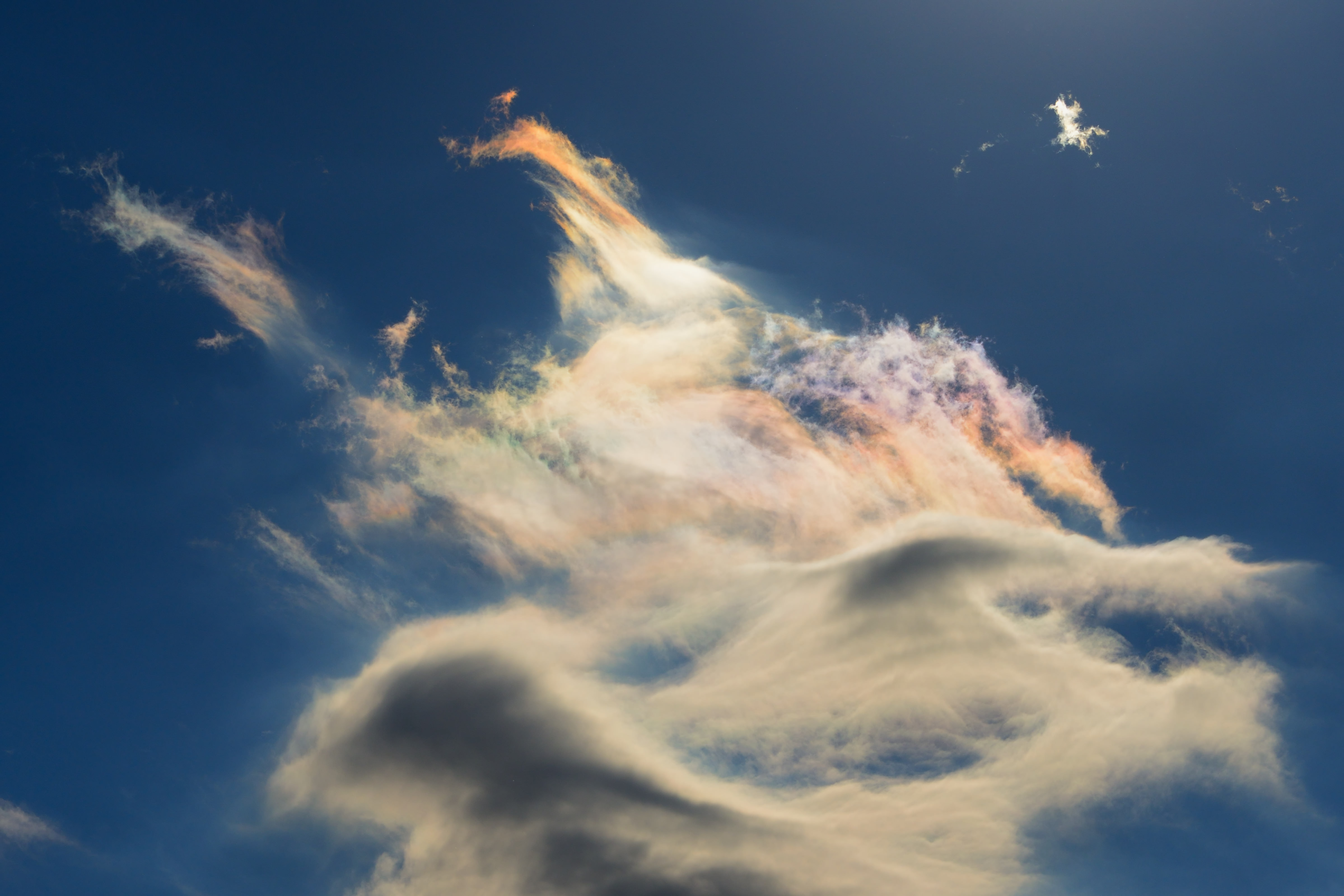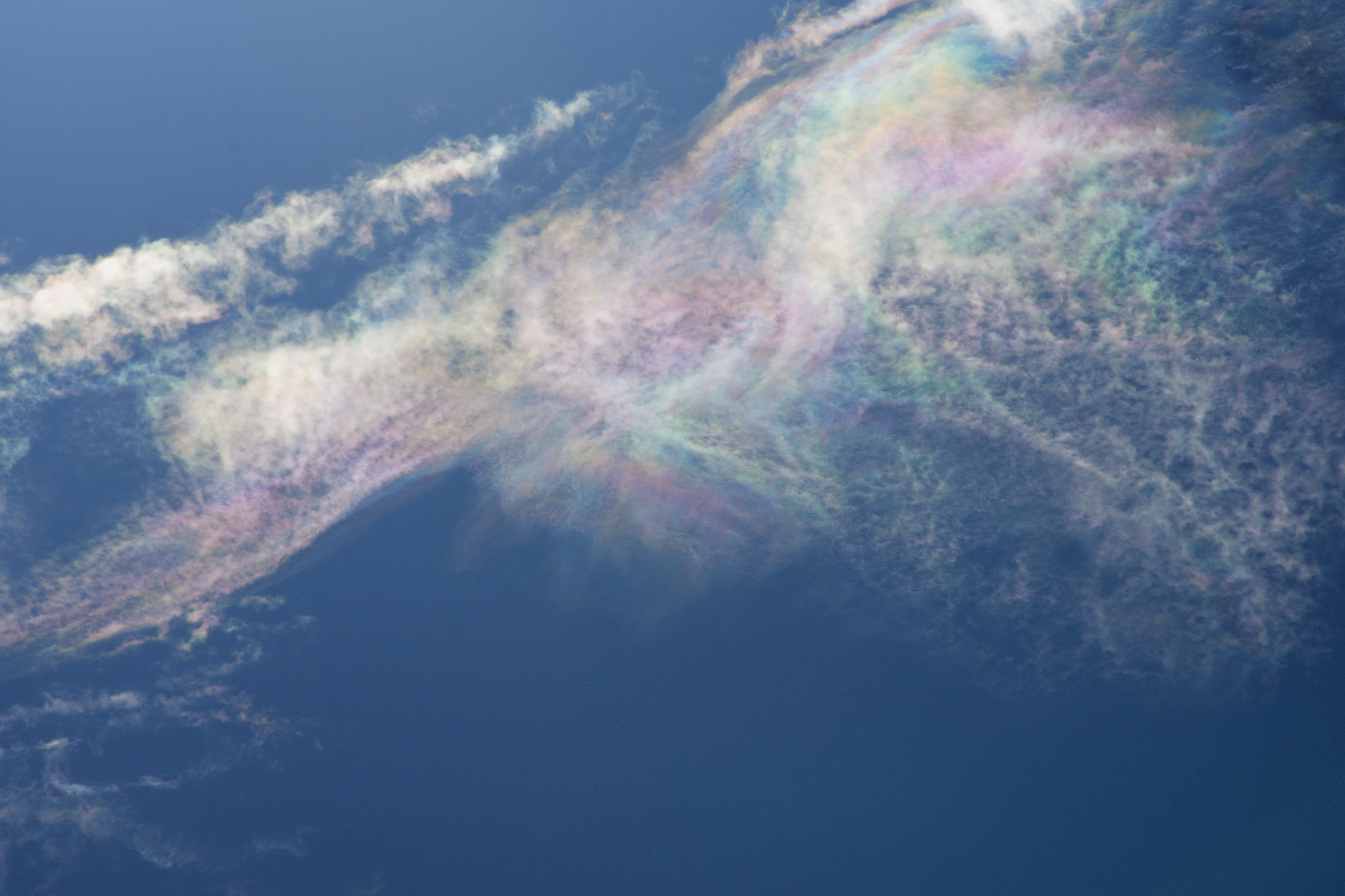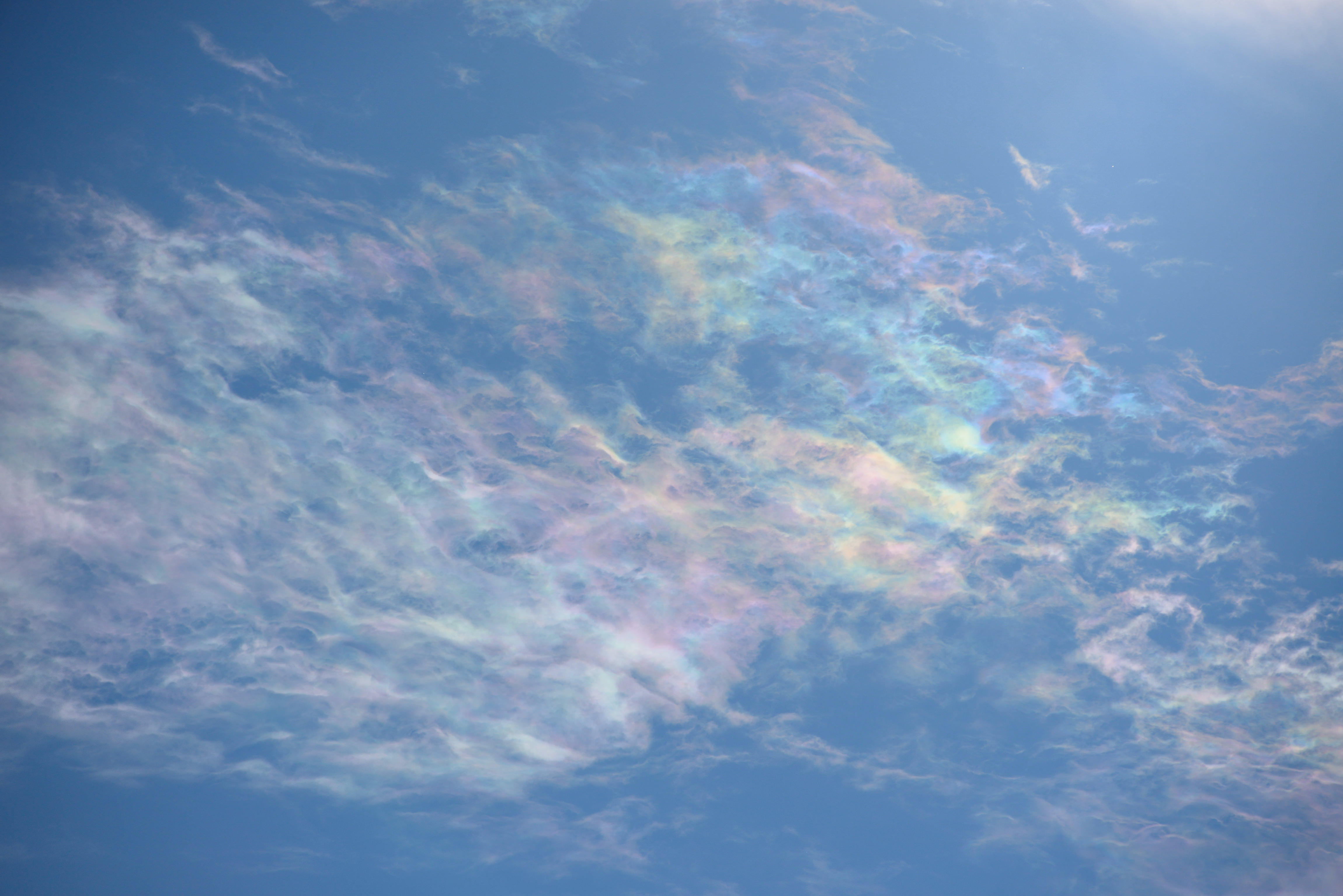 雲に発生する自然現象 幻の太陽 幻日です。現実は太陽の周りに雲があり 一定の条件が重なると太陽の両サイド22度の位置に幻日が発生します。通常は雲の配置により両サイドに出ることは少なく 左側か右側に出るのか多い様です。彩雲の色とは異なり部分的に色が発生するようです。