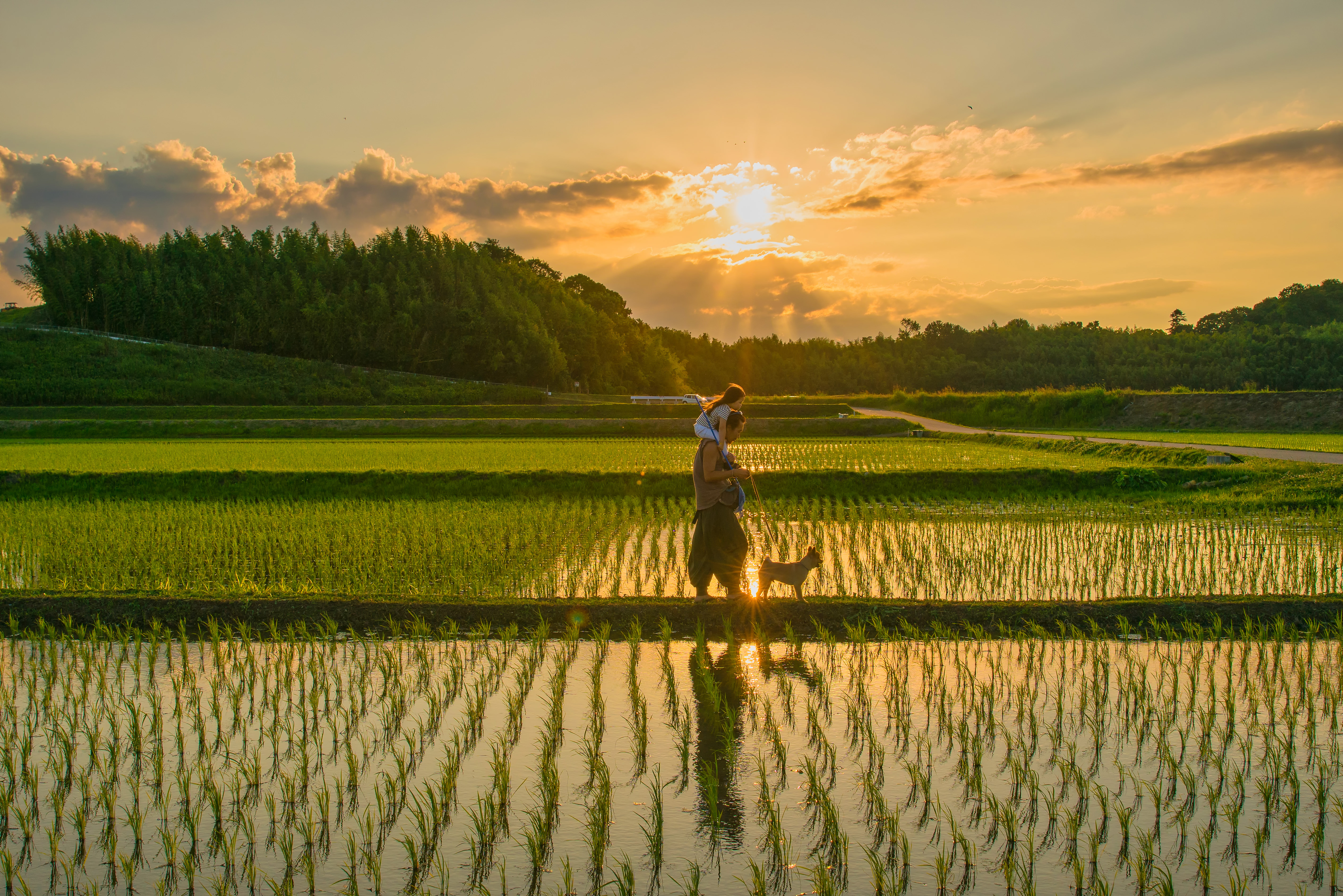 パパの肩車が大好きな娘自宅近所の散歩コースで虫を捕まえたりして、あぜ道を散歩するパパと娘と愛犬の幸せの一時