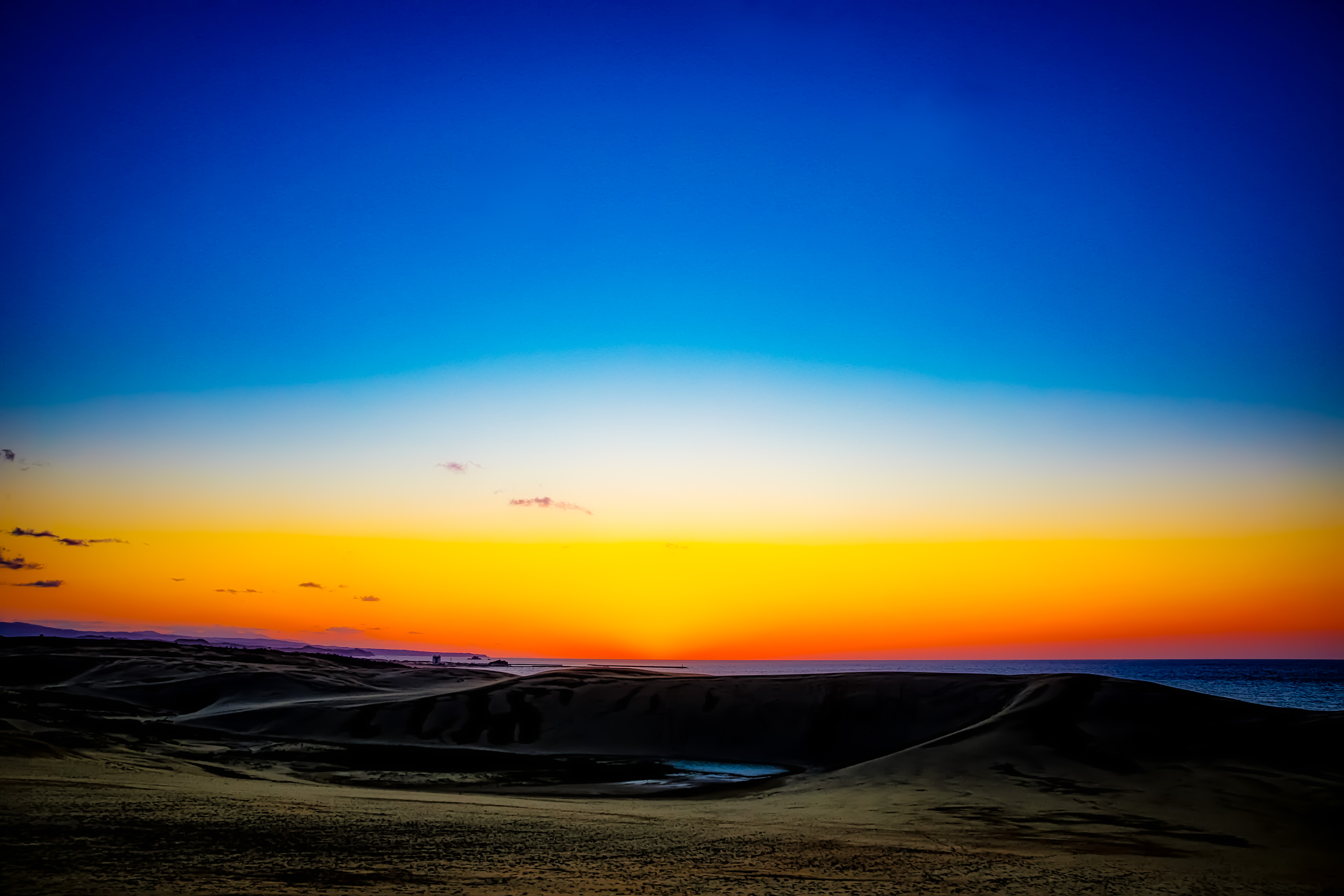 日没直後の鳥取砂丘。天気は良かったのですがとても風が寒かったです。