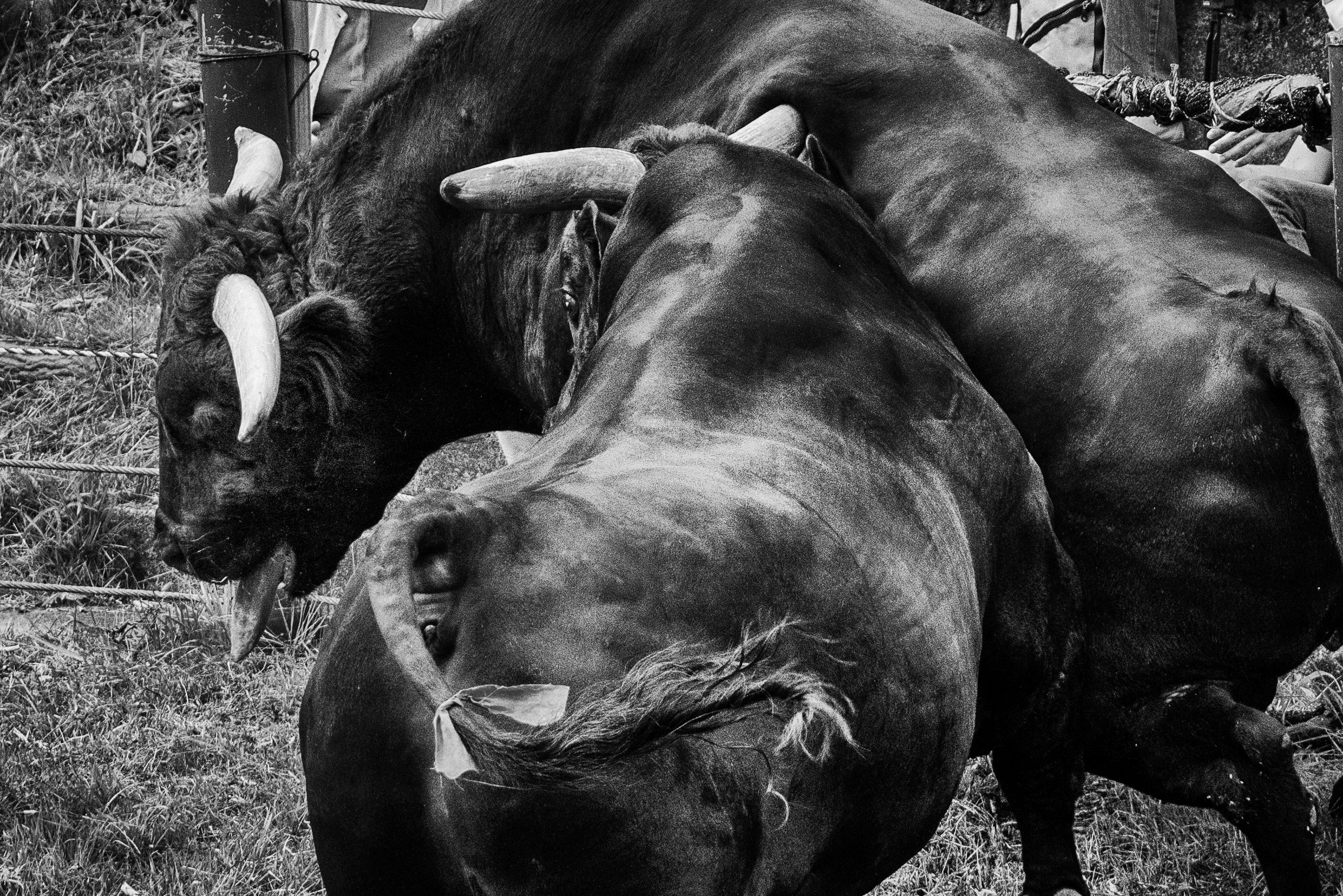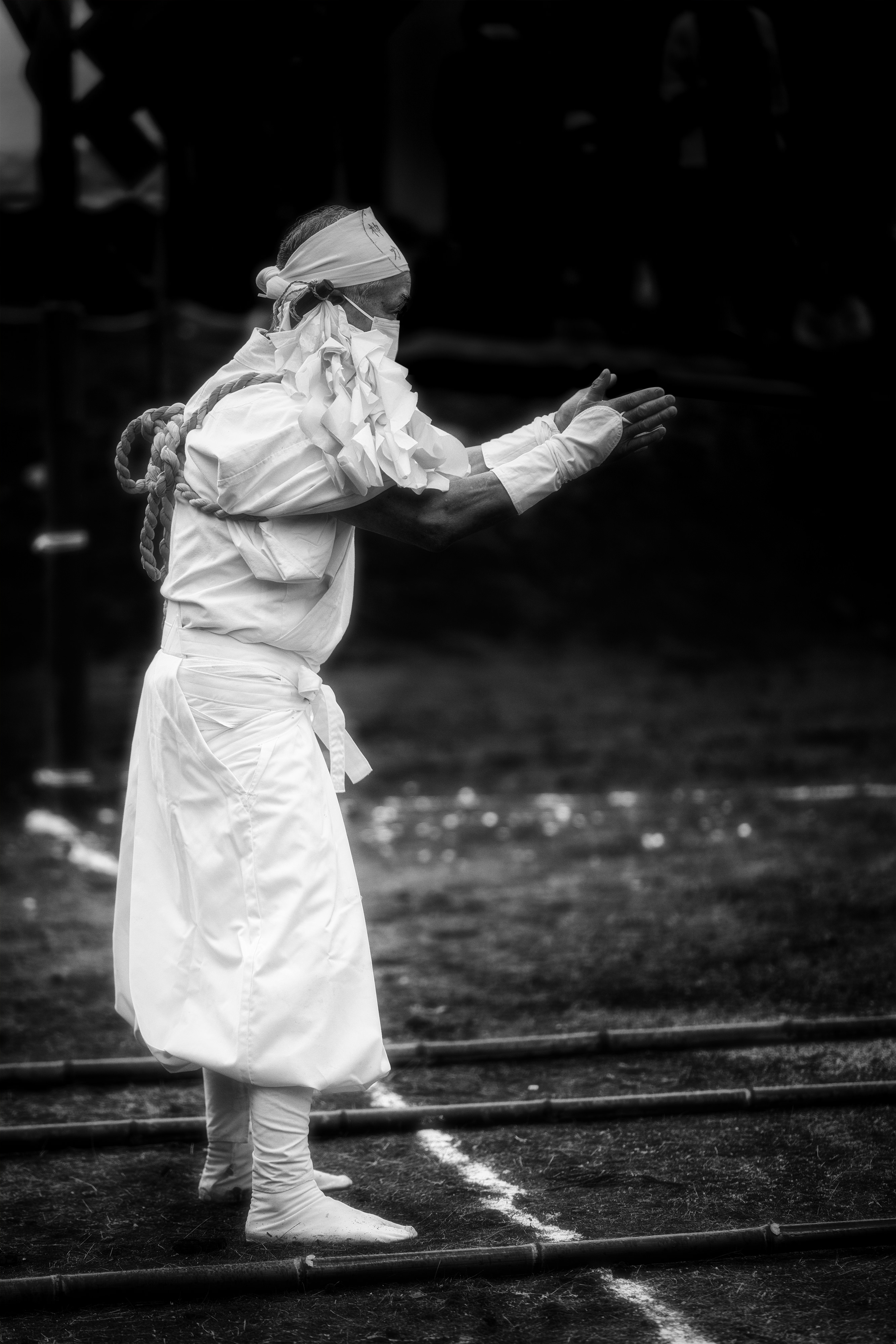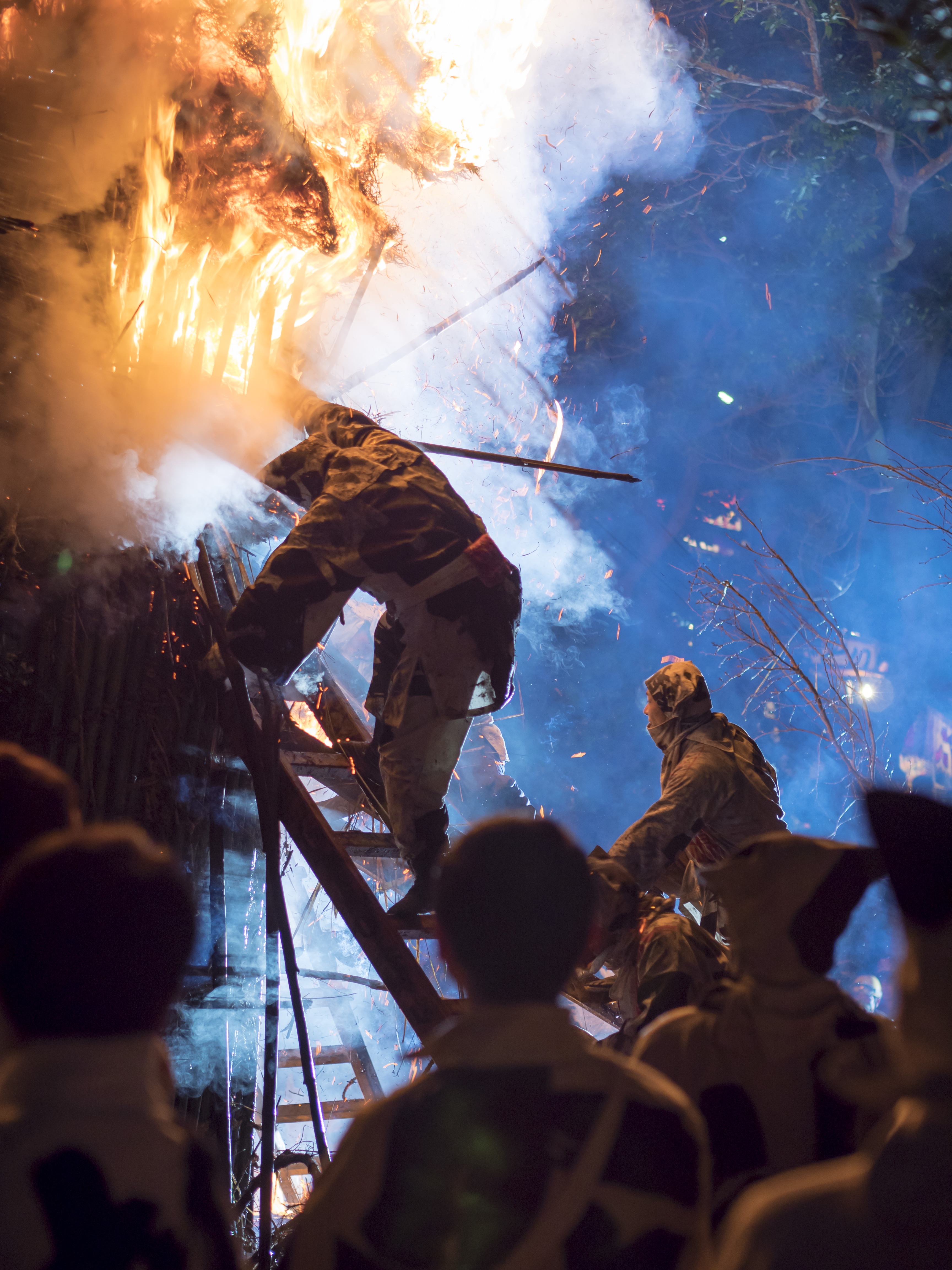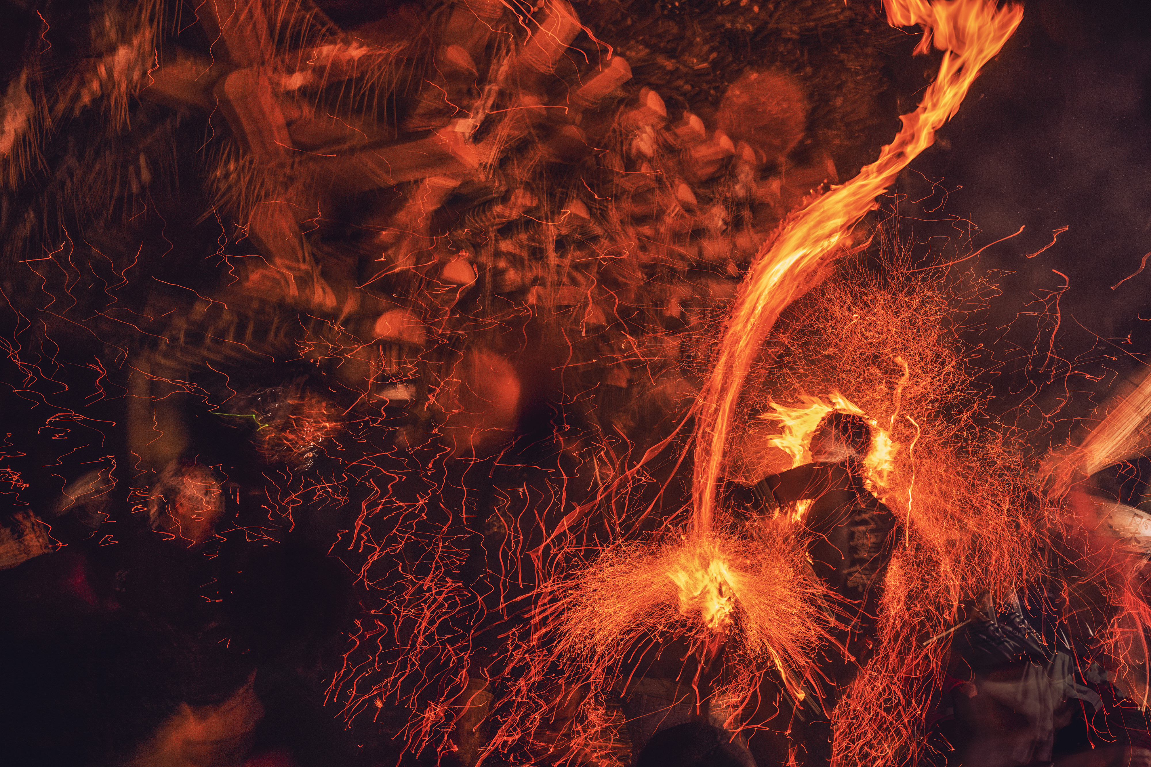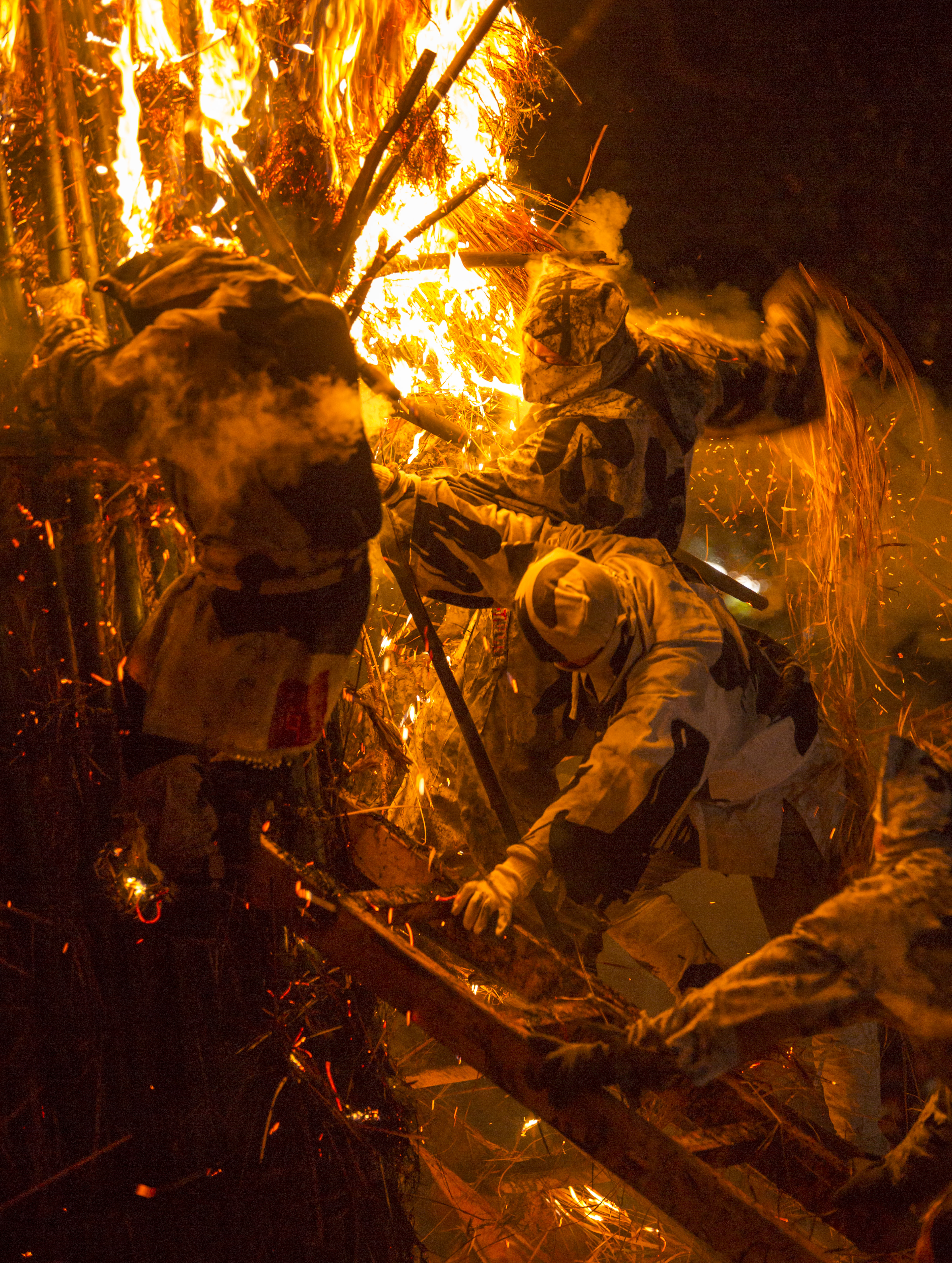 画面右から村人が松明を振り回して左の社殿に居る厄年の25歳の青年たちに向かっていくのですがどう言うわけかこれは炎が上から降ってきたように撮れてました。