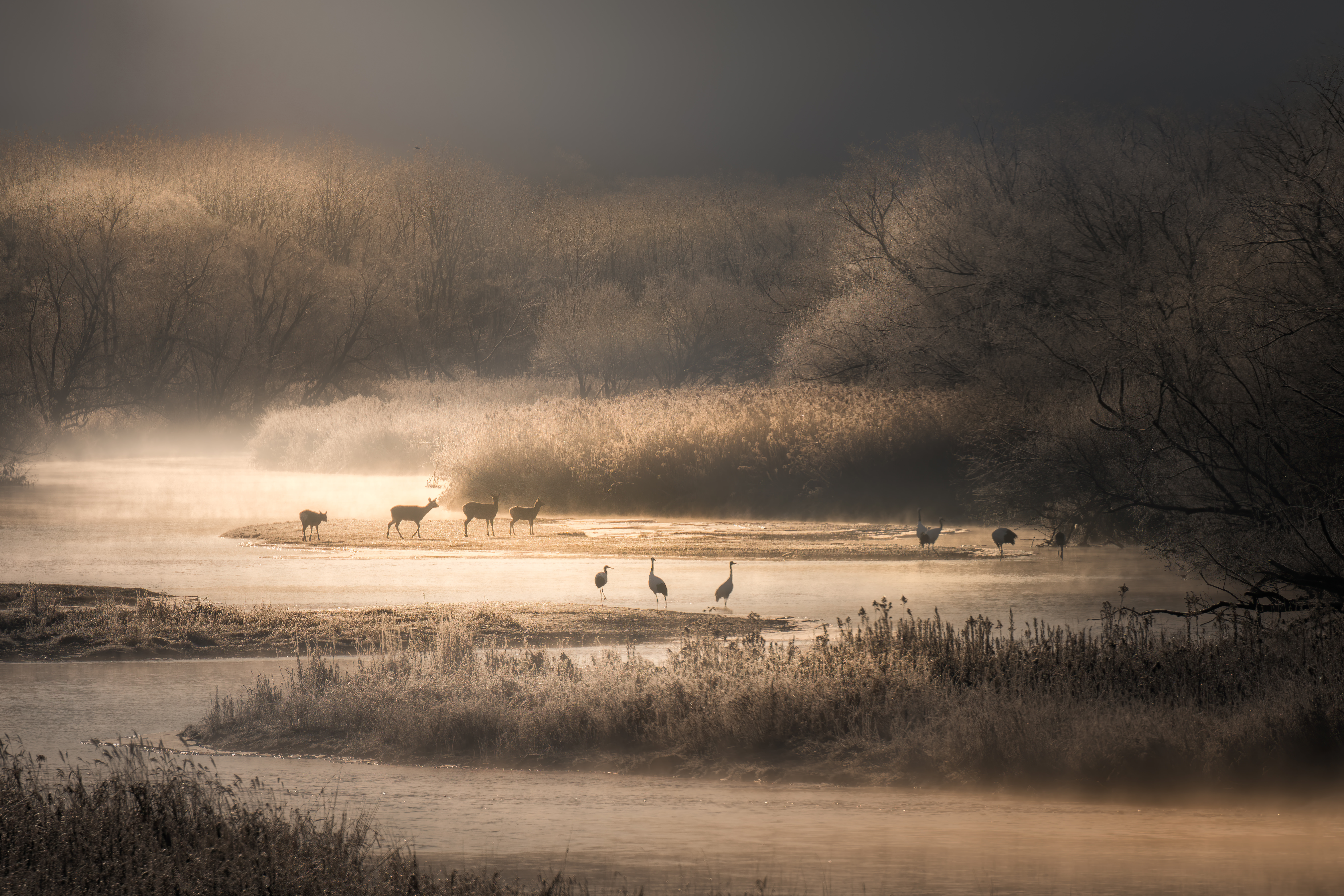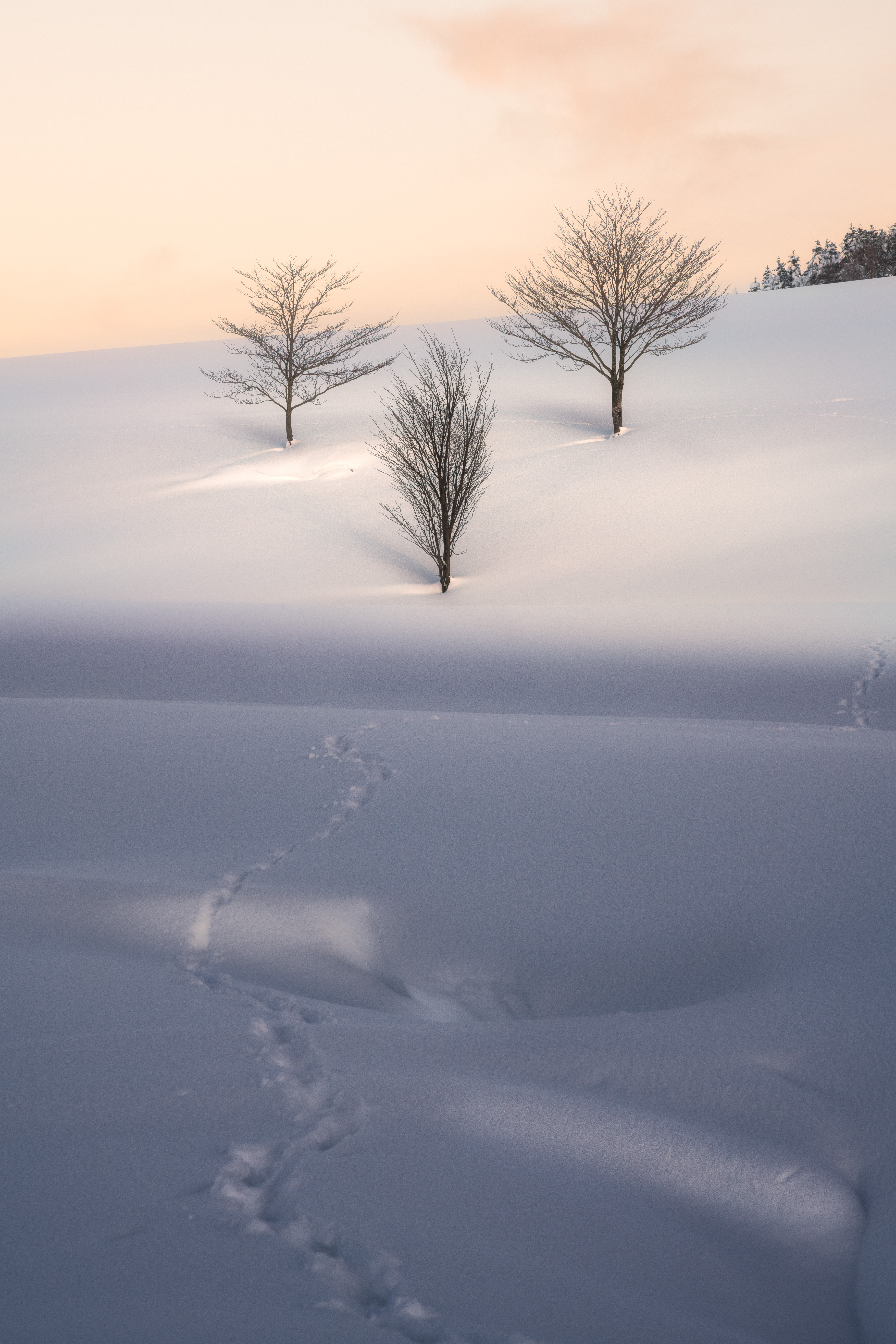 ピンクにそまる夕方の空と一匹の孤独な狐が不思議な光景でした。