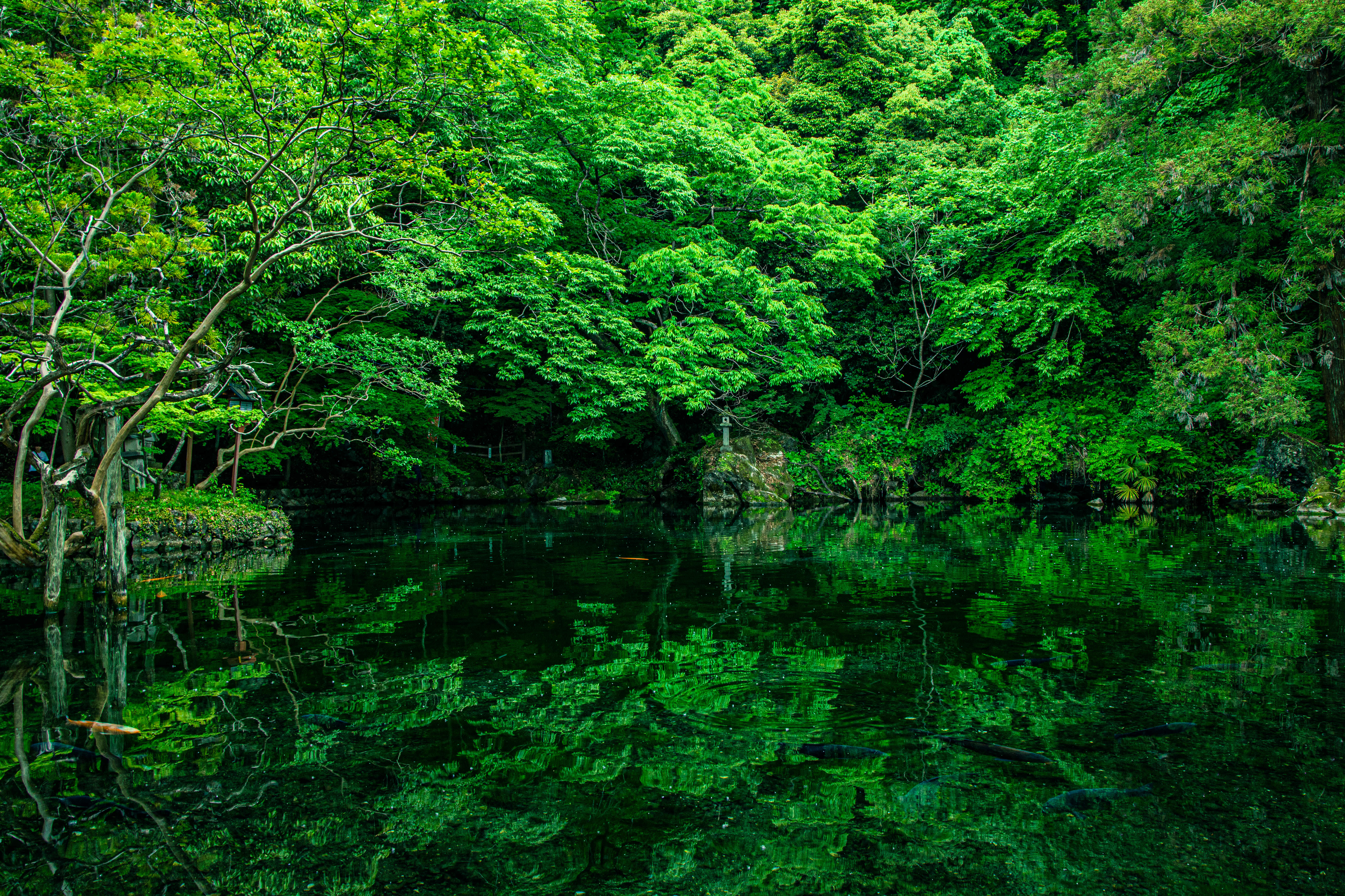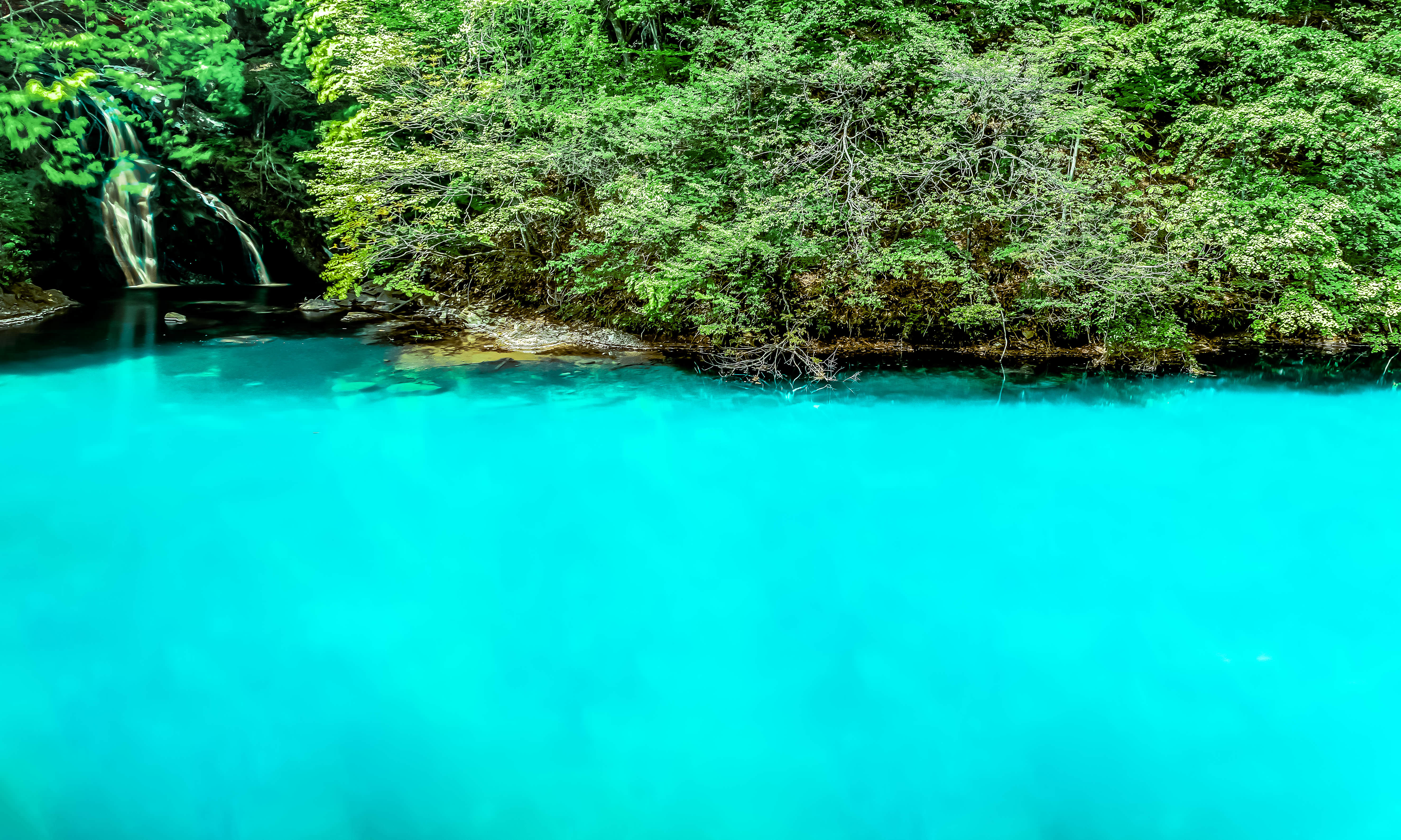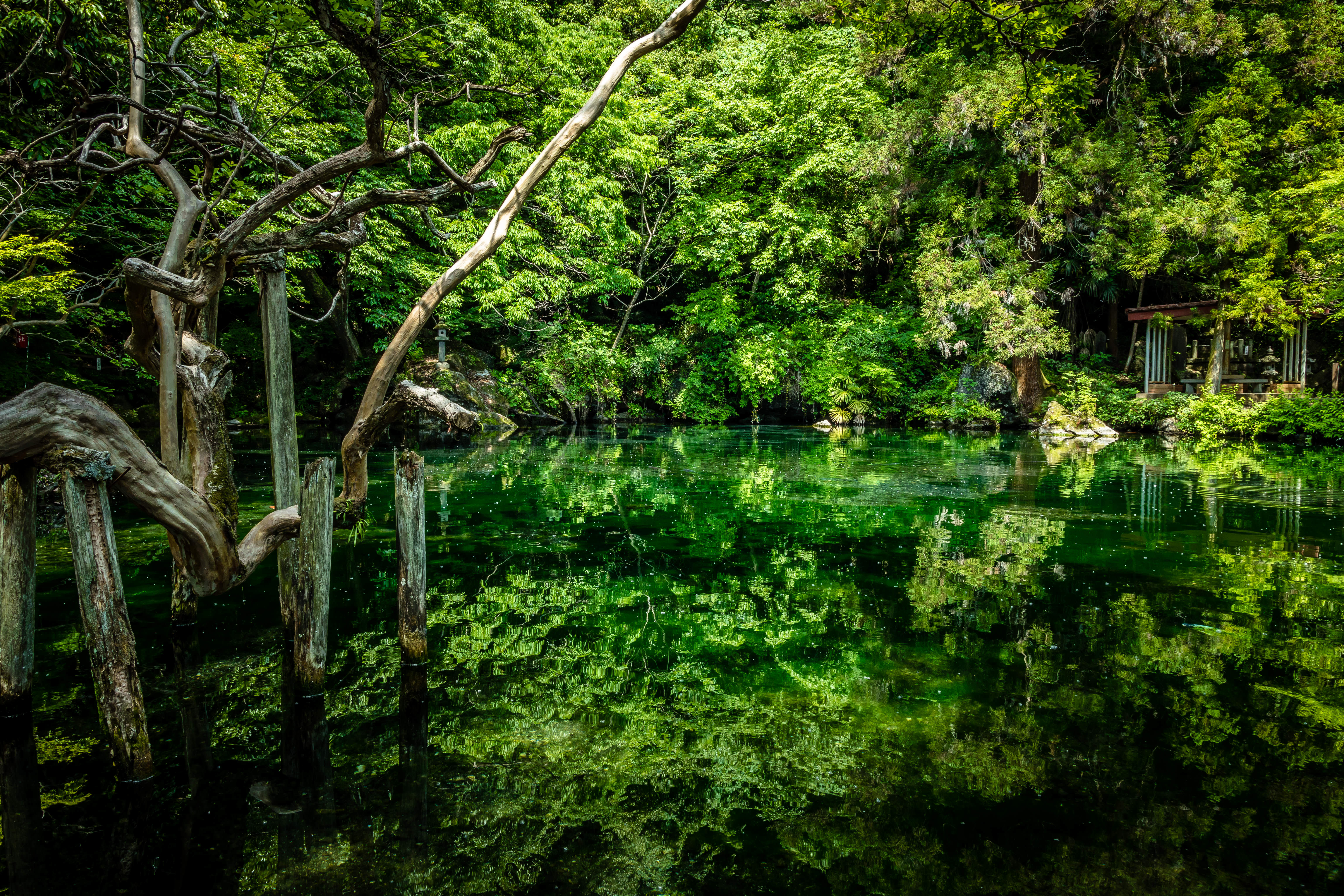 樹木に覆われた池に湧き出す水は、日本名水百選です。