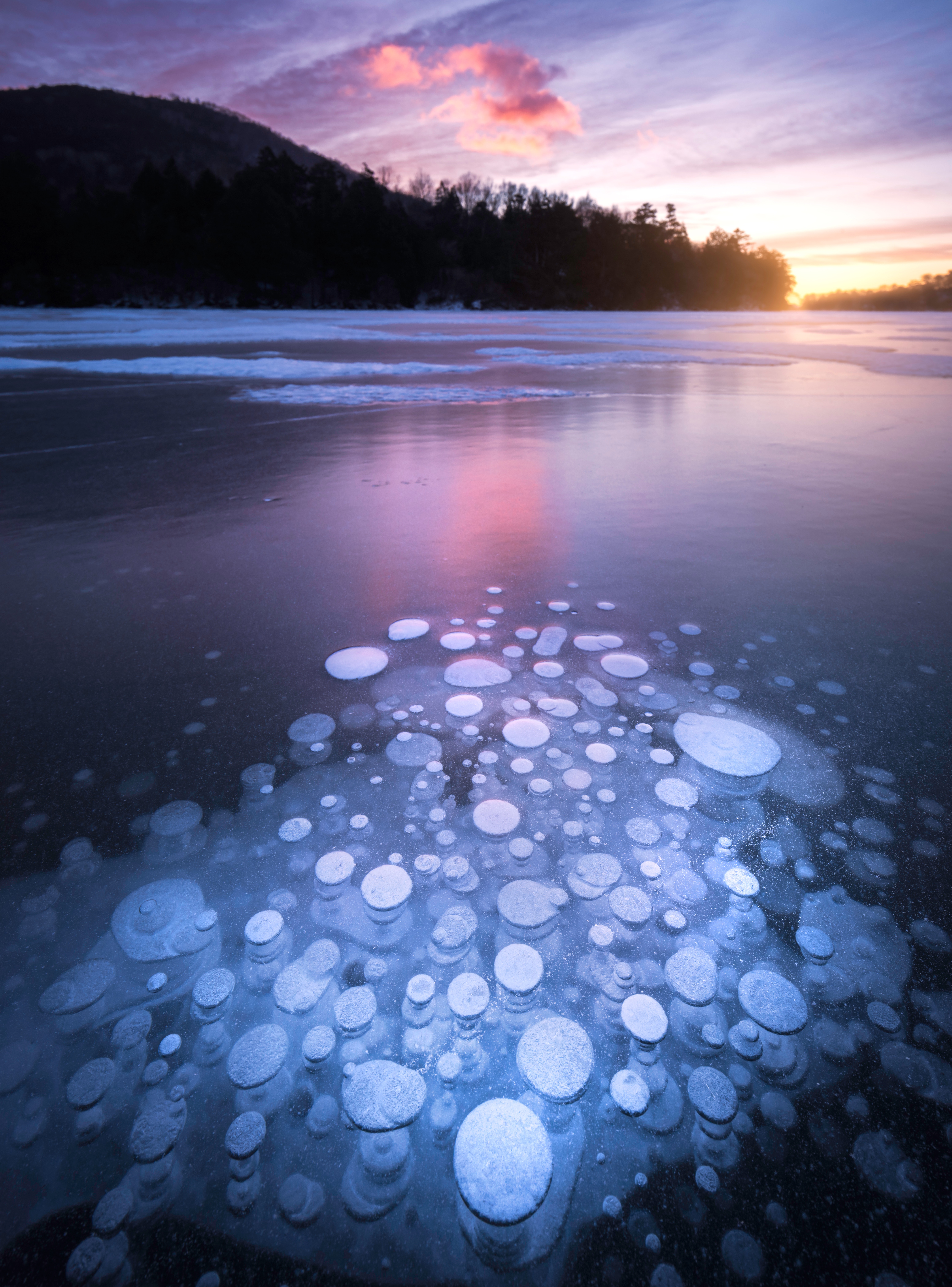 アイスバブルを日の出と絡めて撮影。撮影地は秘密なので地図設定上の場所ではありません。