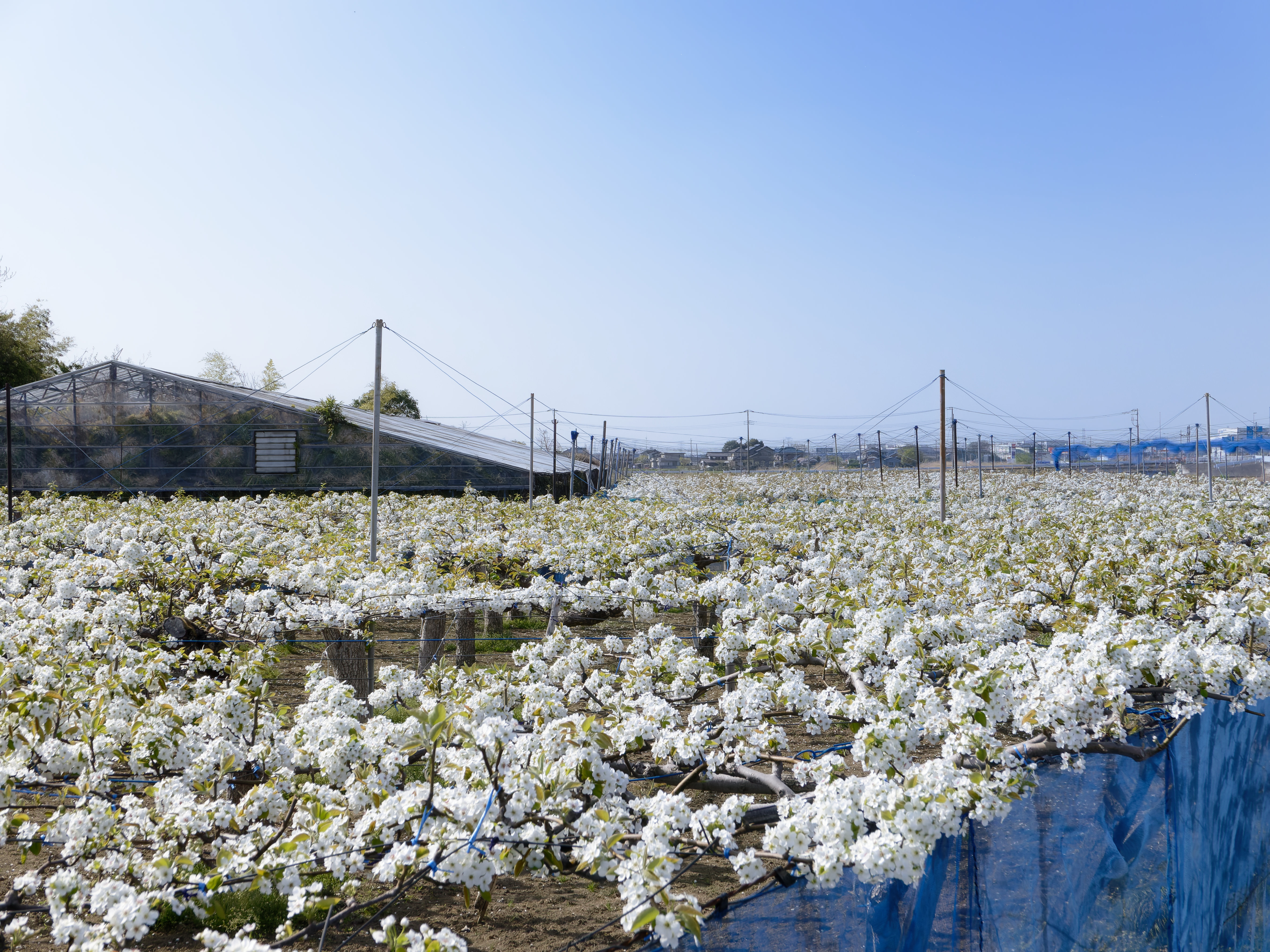 本来は実の収穫用に栽培されているので、水平の棚状に枝が伸ばされますが、そこに満開の花が咲いたところを枝の上から見下ろした光景は、まるで華やかな白い絨毯を広げたよう。