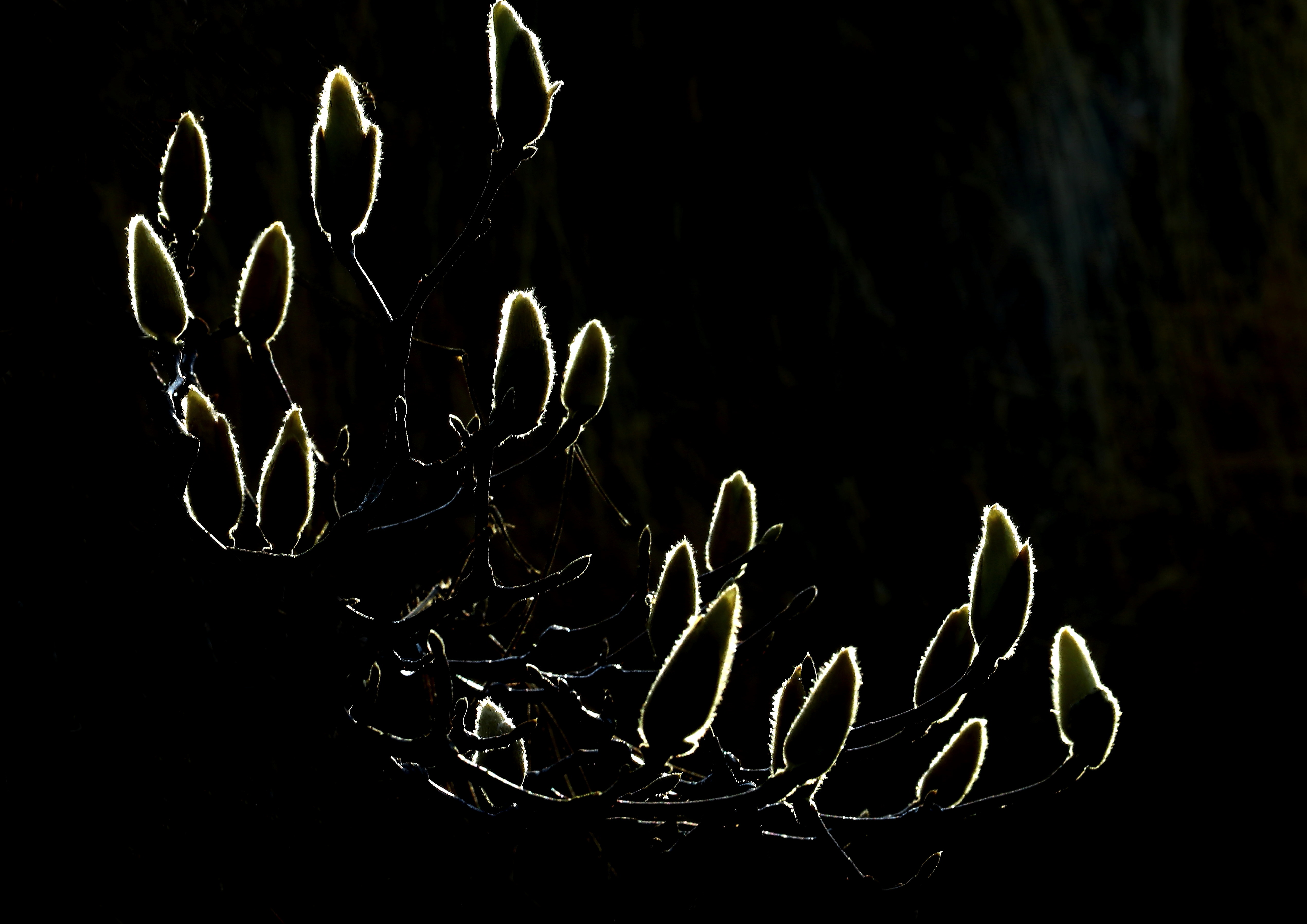 池の土手下で開花をまつ、モクレンの枝。朝日が差し込んだ数分を逆光で撮る。白モクレンを黒モクレンにする。