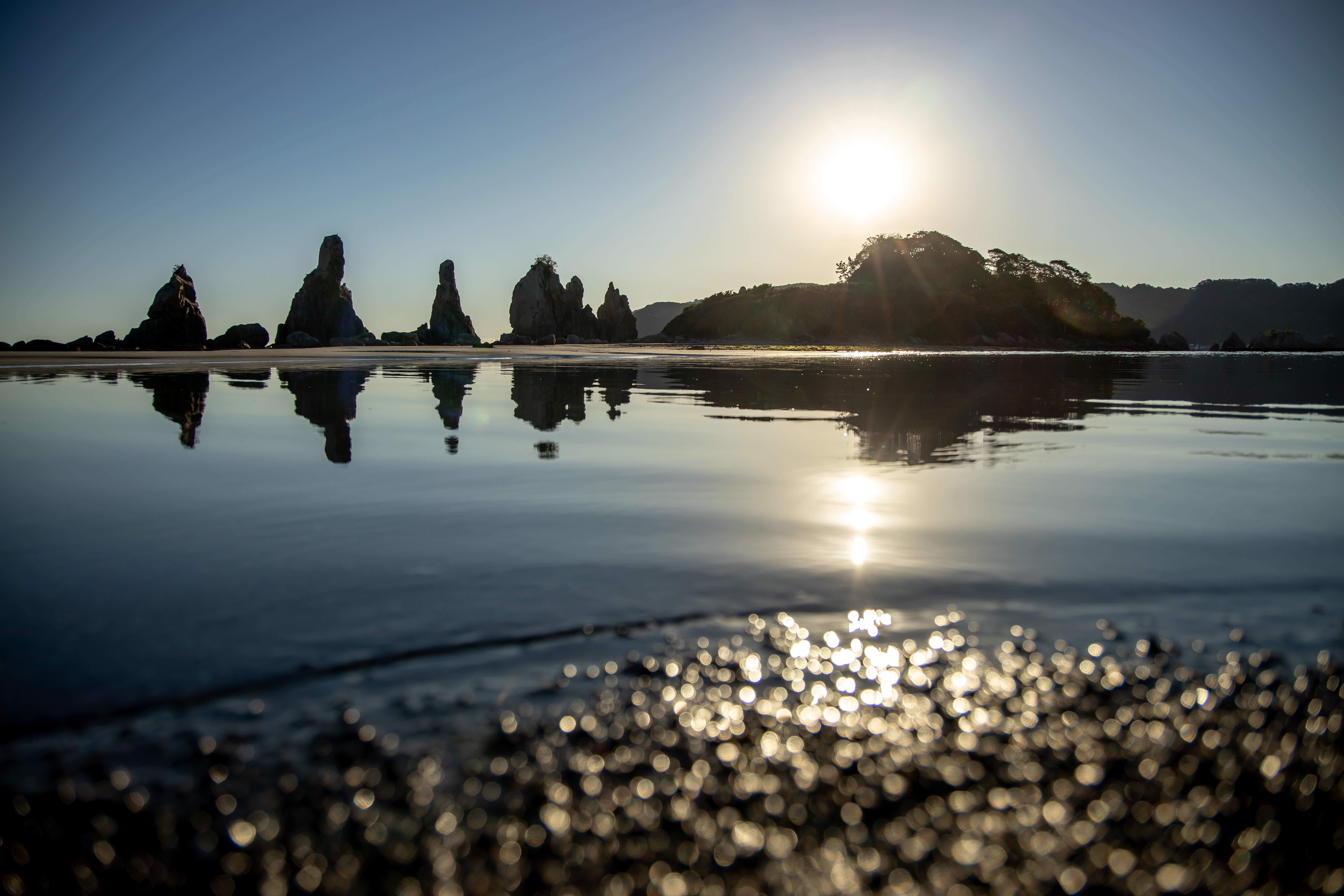 日の出とともに鳥の群れ