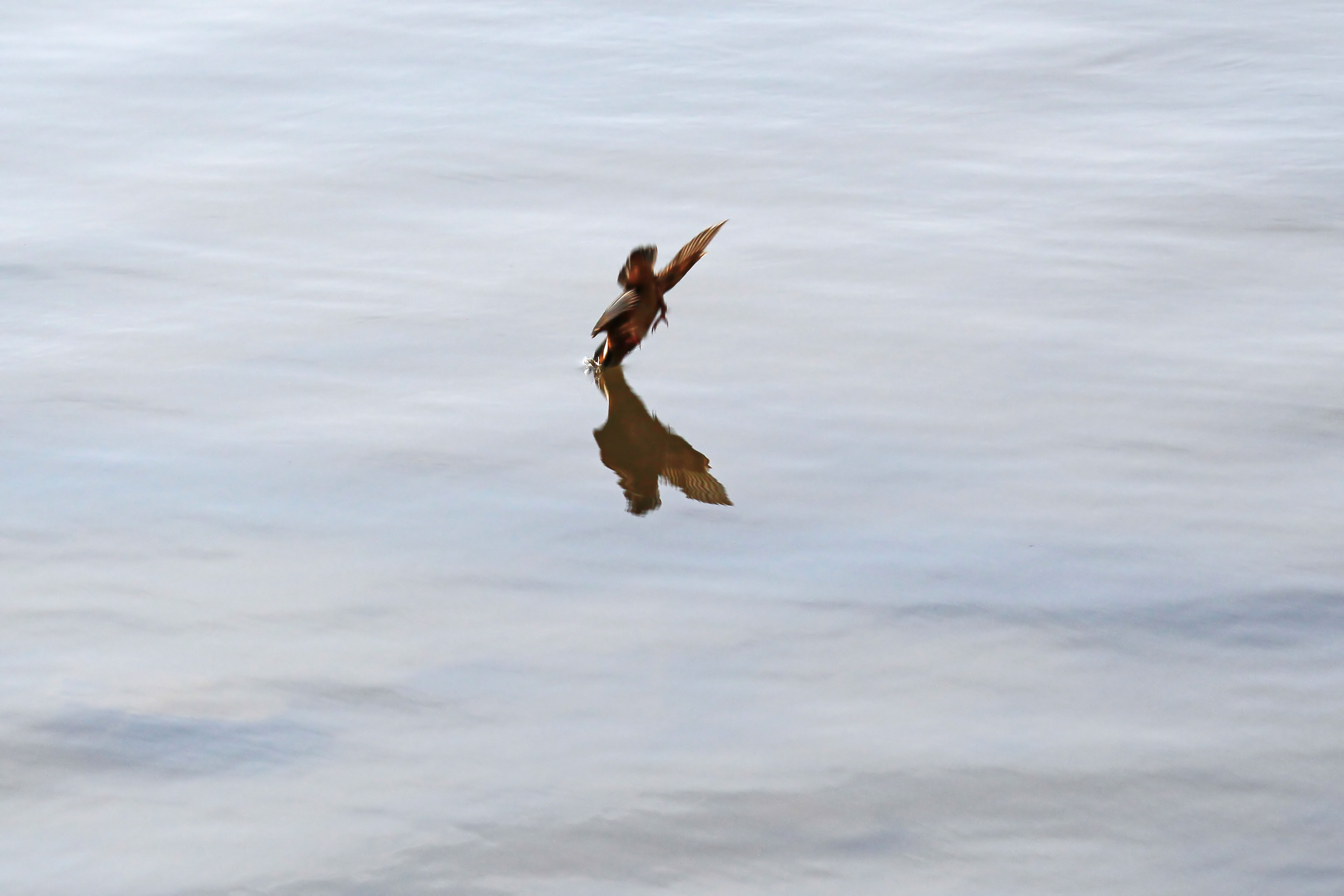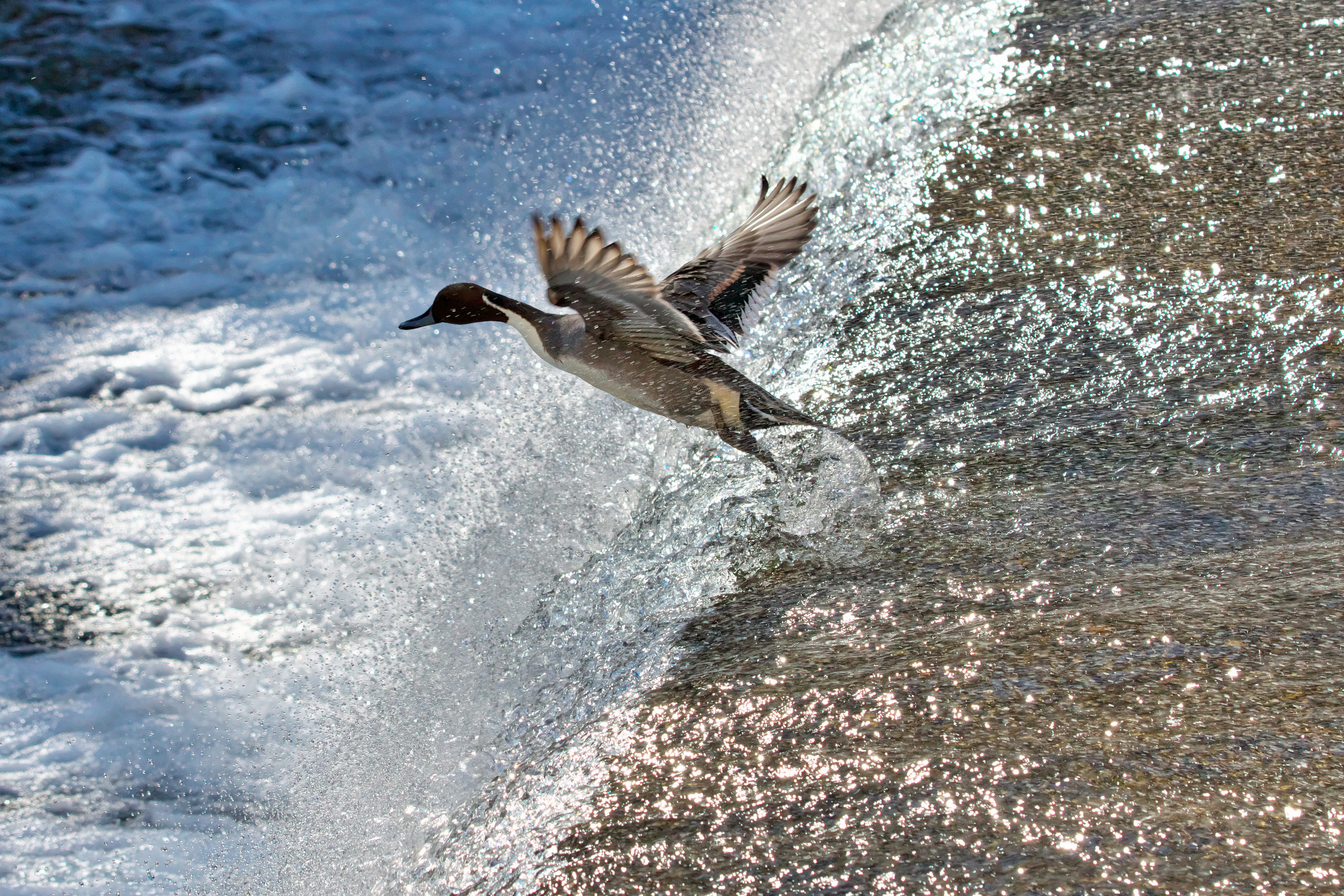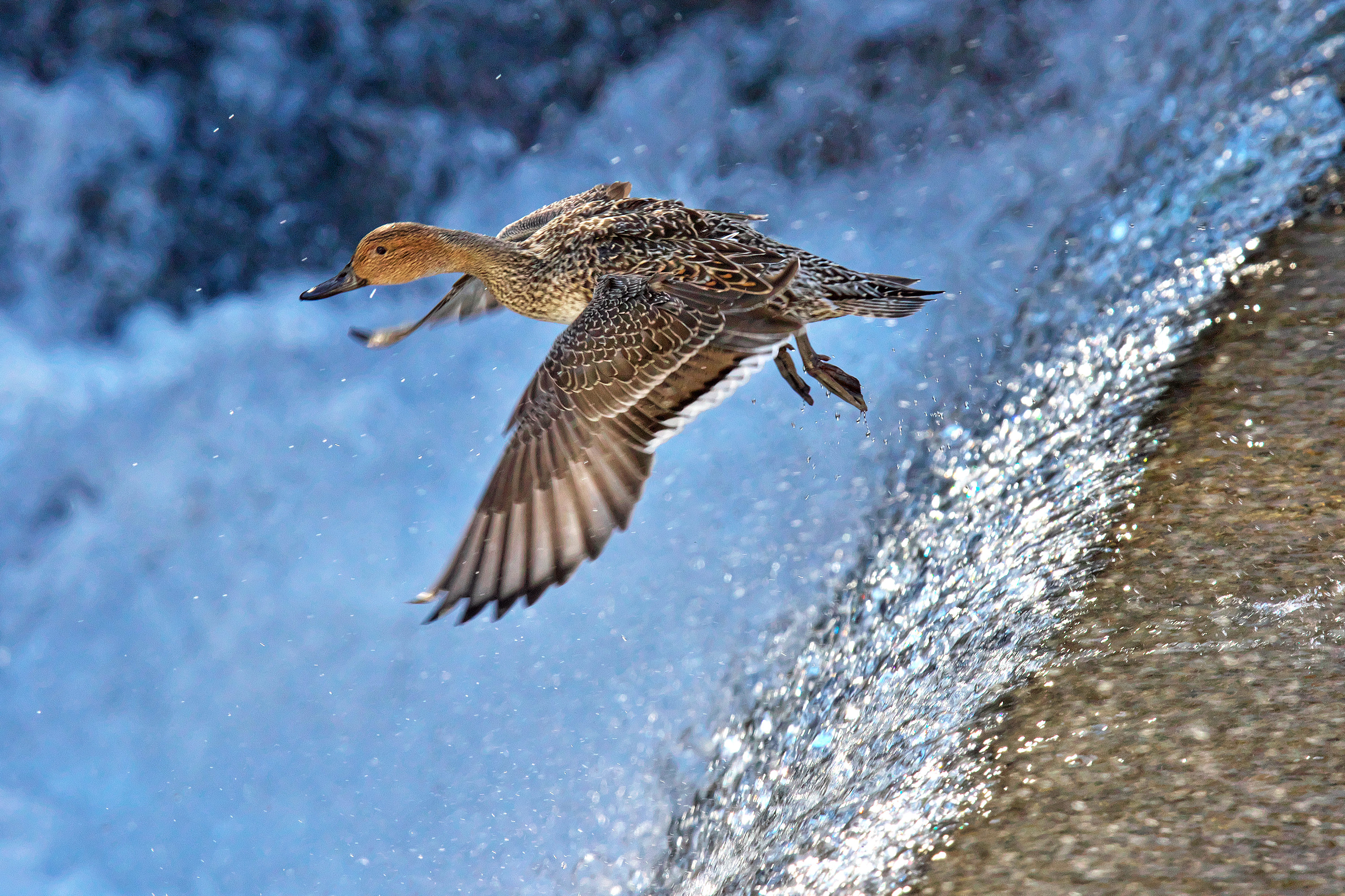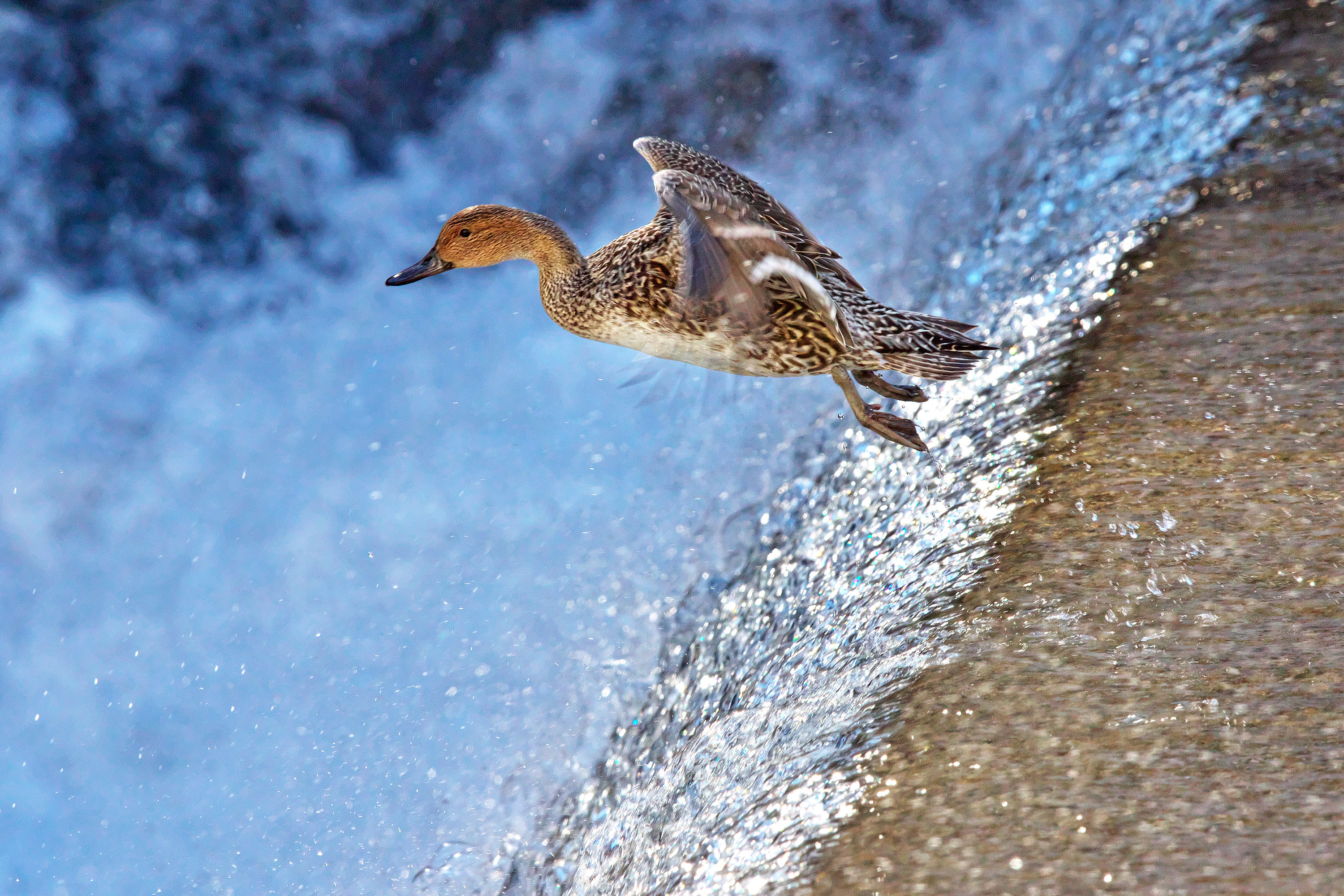 渓流の流れに押されて堰の落ち際まで来ると、ジャンプして飛び立ちます。