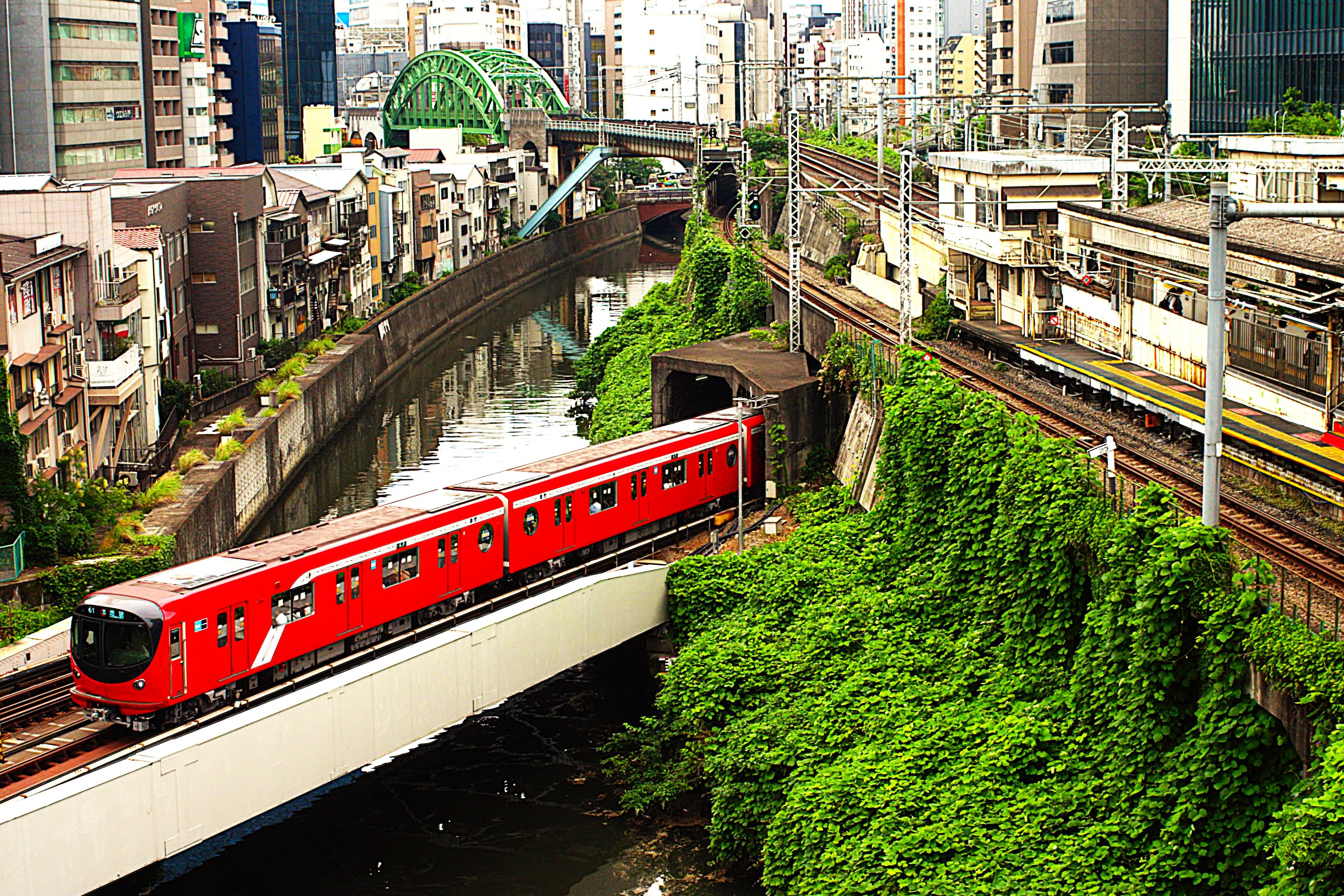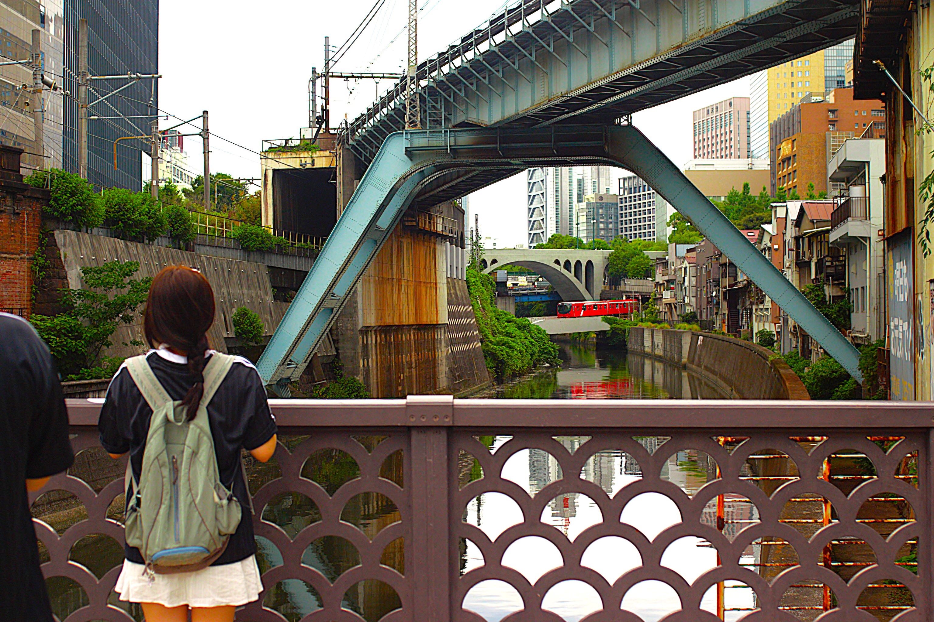 橋の欄干で流れる川と遠く走る電車を見ていると