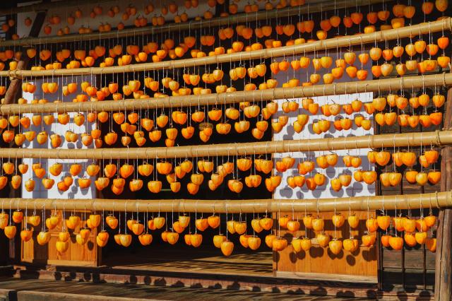 偶然立ち寄った日本家屋で干し柿が作られていました。 まだ瑞々しさが残る美しい柿の実に思わず見惚れてしまいました。