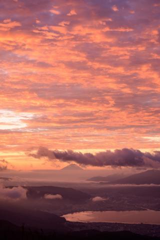 強風で霧が流れると目の前には広い朝焼けの景色が表れたのでした。