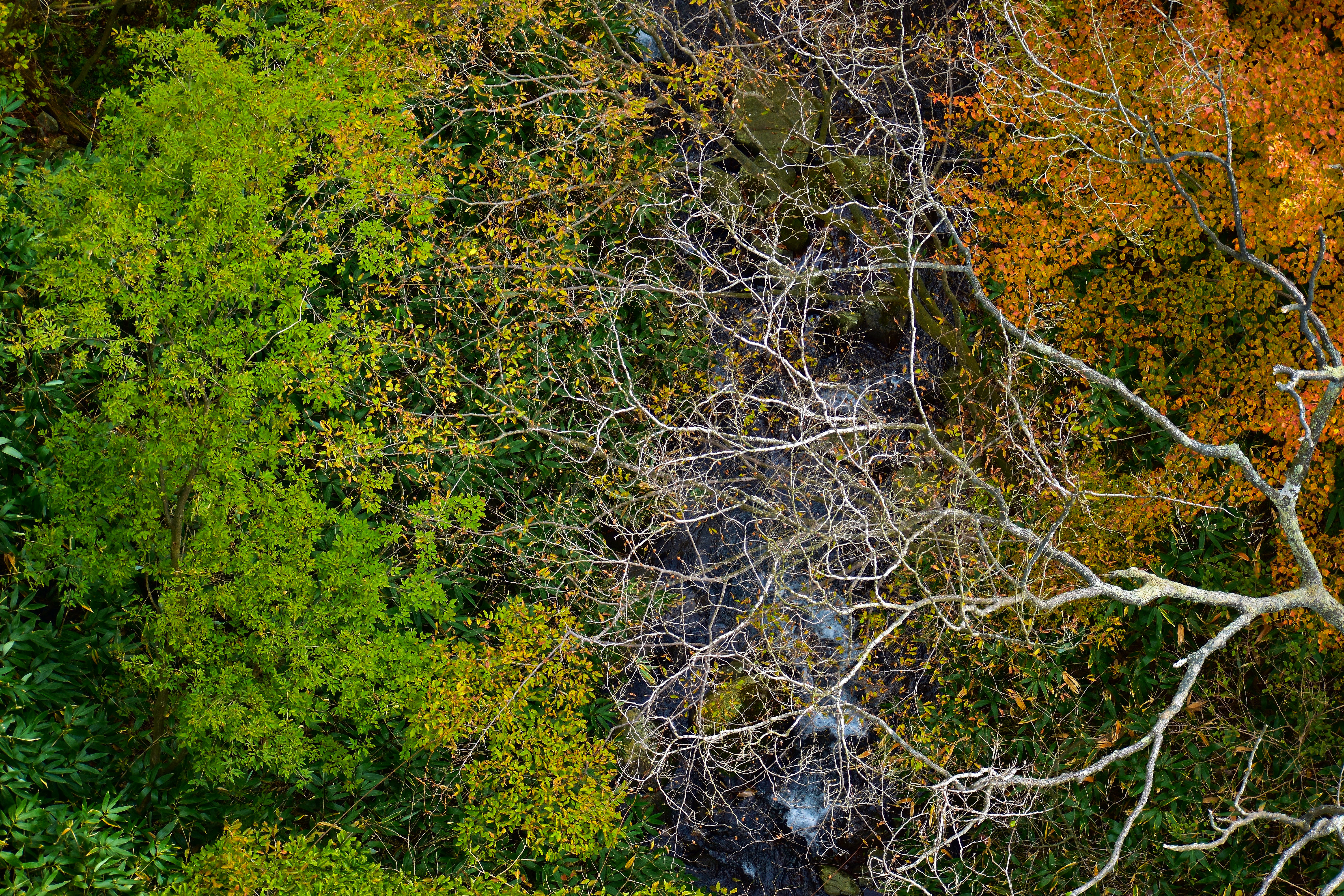 During my visit to the Tsutsuji Suspension Bridge of Nasu, I saw this view from the bridge. The source of life, water, runs between the green tree and the dead one. also, we can see three phases of life: The green (youth) time, the yellow (old) time, and the leafless (death) branches, which is also the truth of "Life".