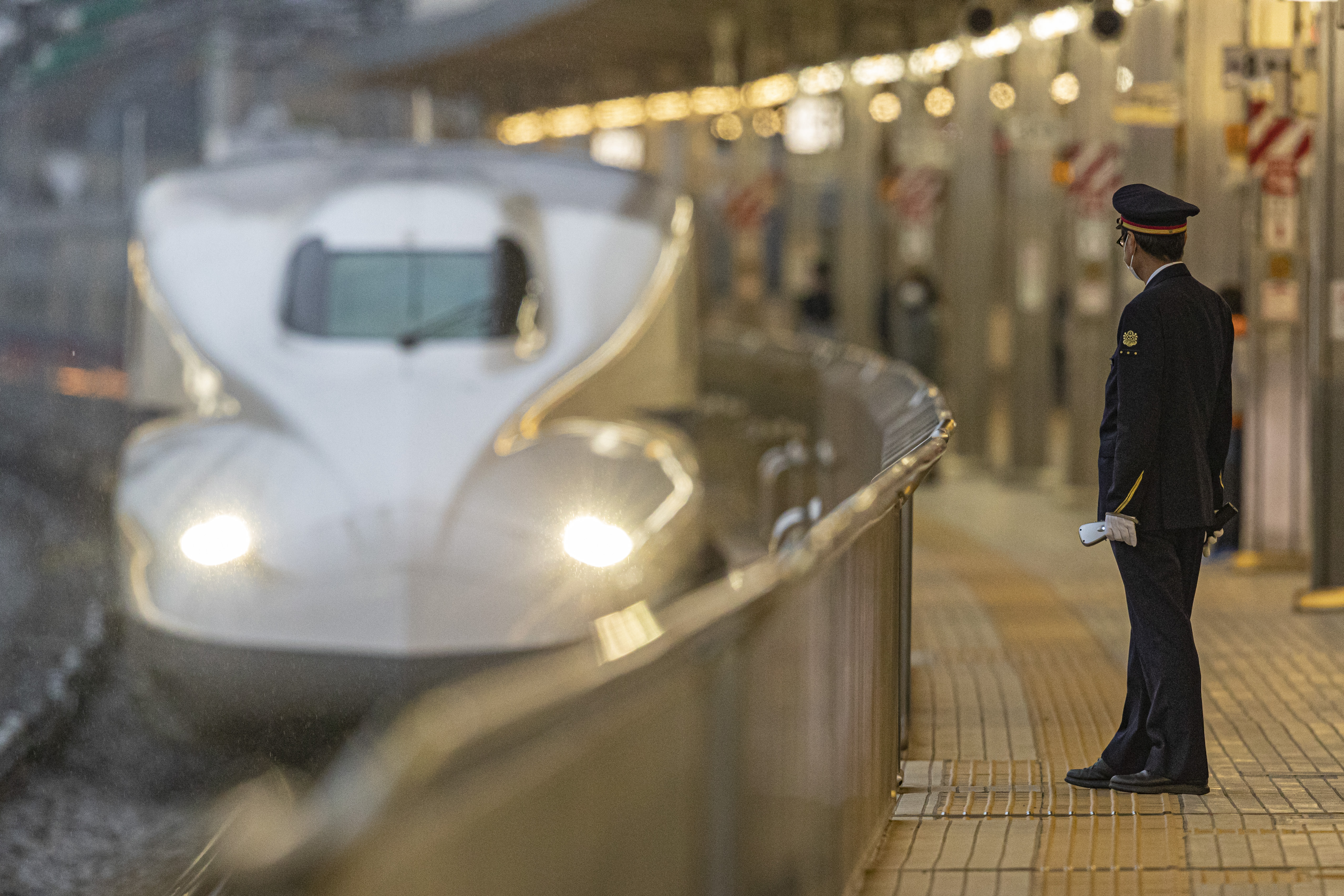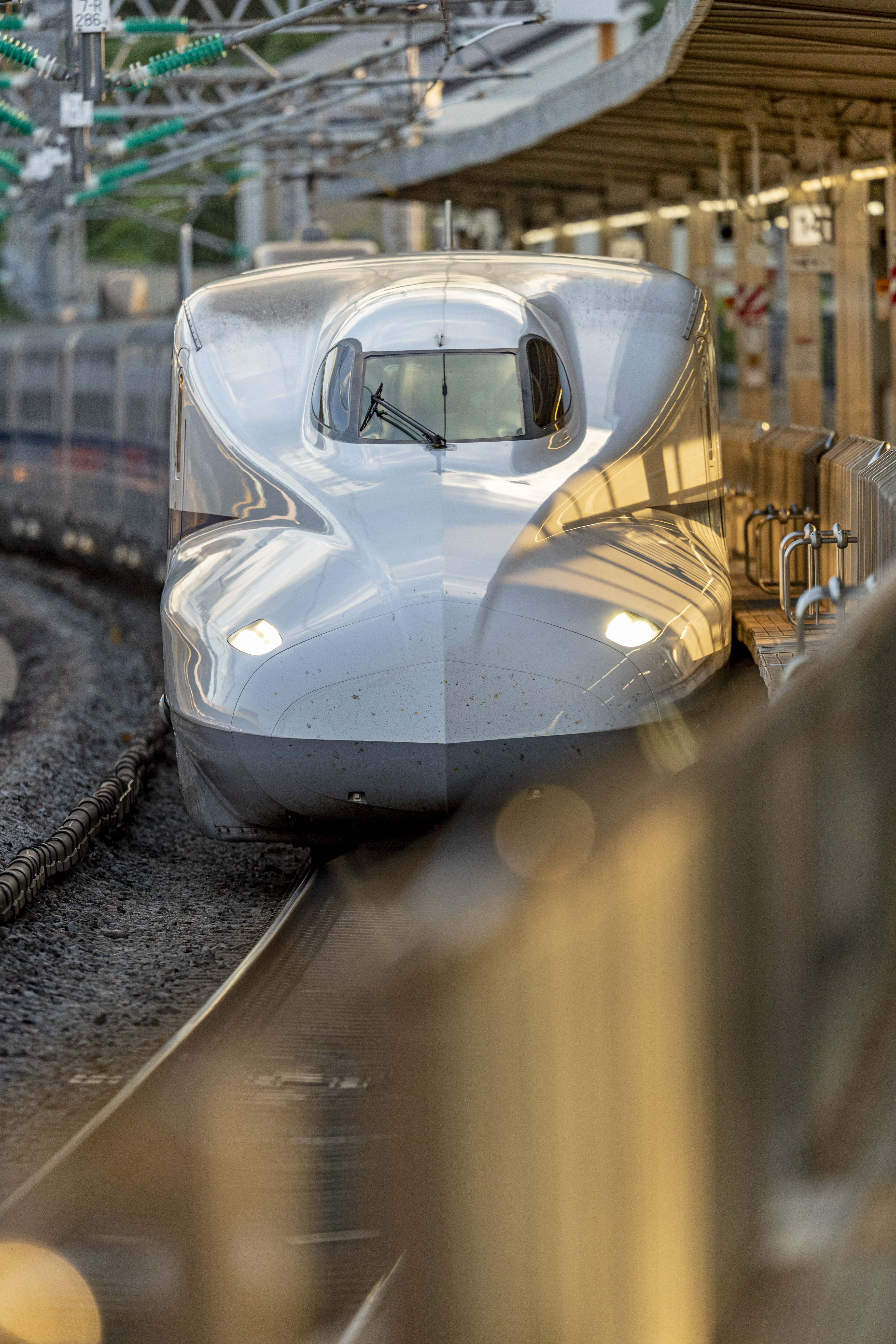 ホームに入線し、夕日に照らされて輝きを誇る新幹線、ひかり号。