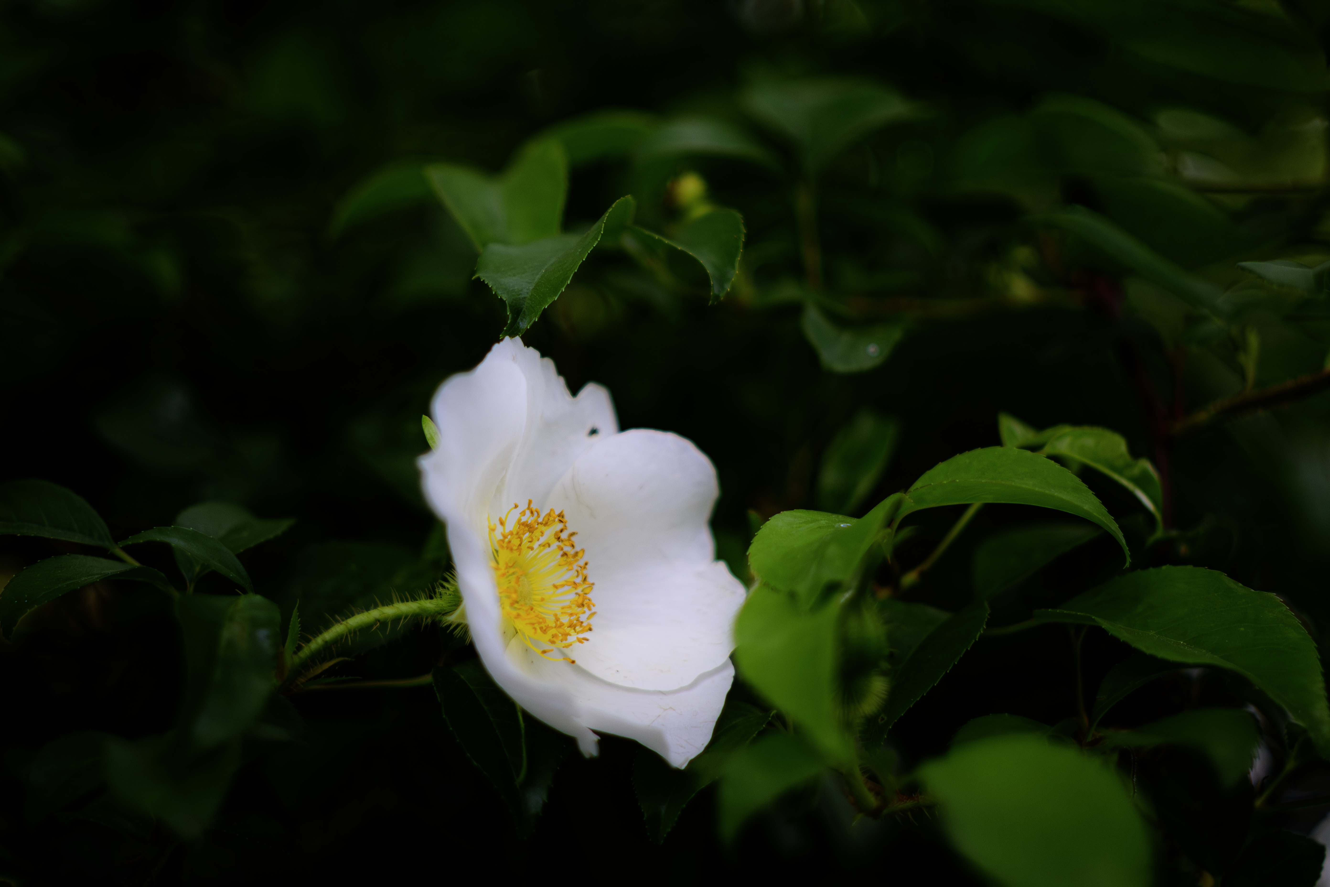 しべの色が淡い黄色の時が咲き始め、このレンズは2線ボケになり易く白い花なので 背景が暗くシンプルな構図を探して撮りました。