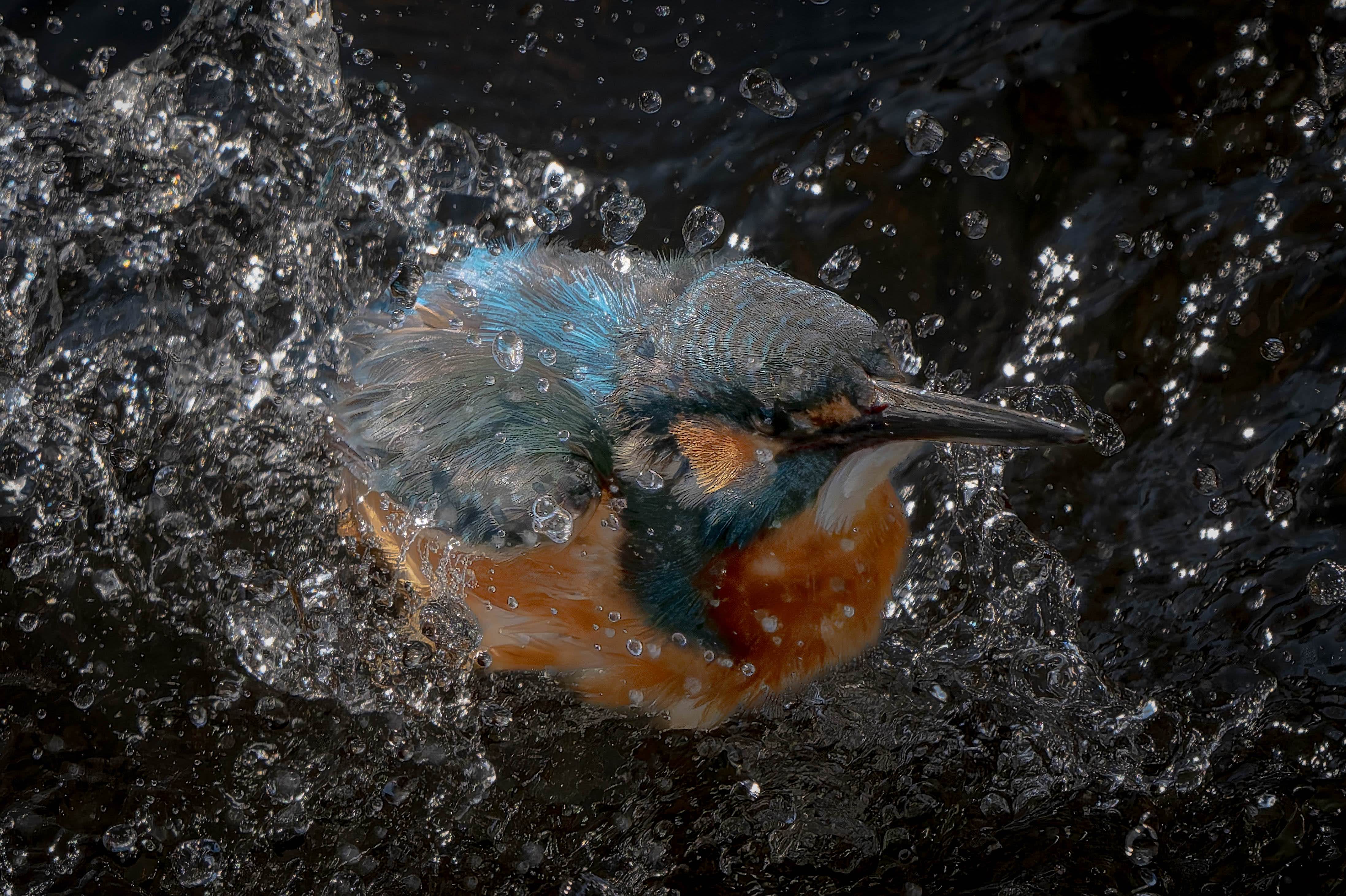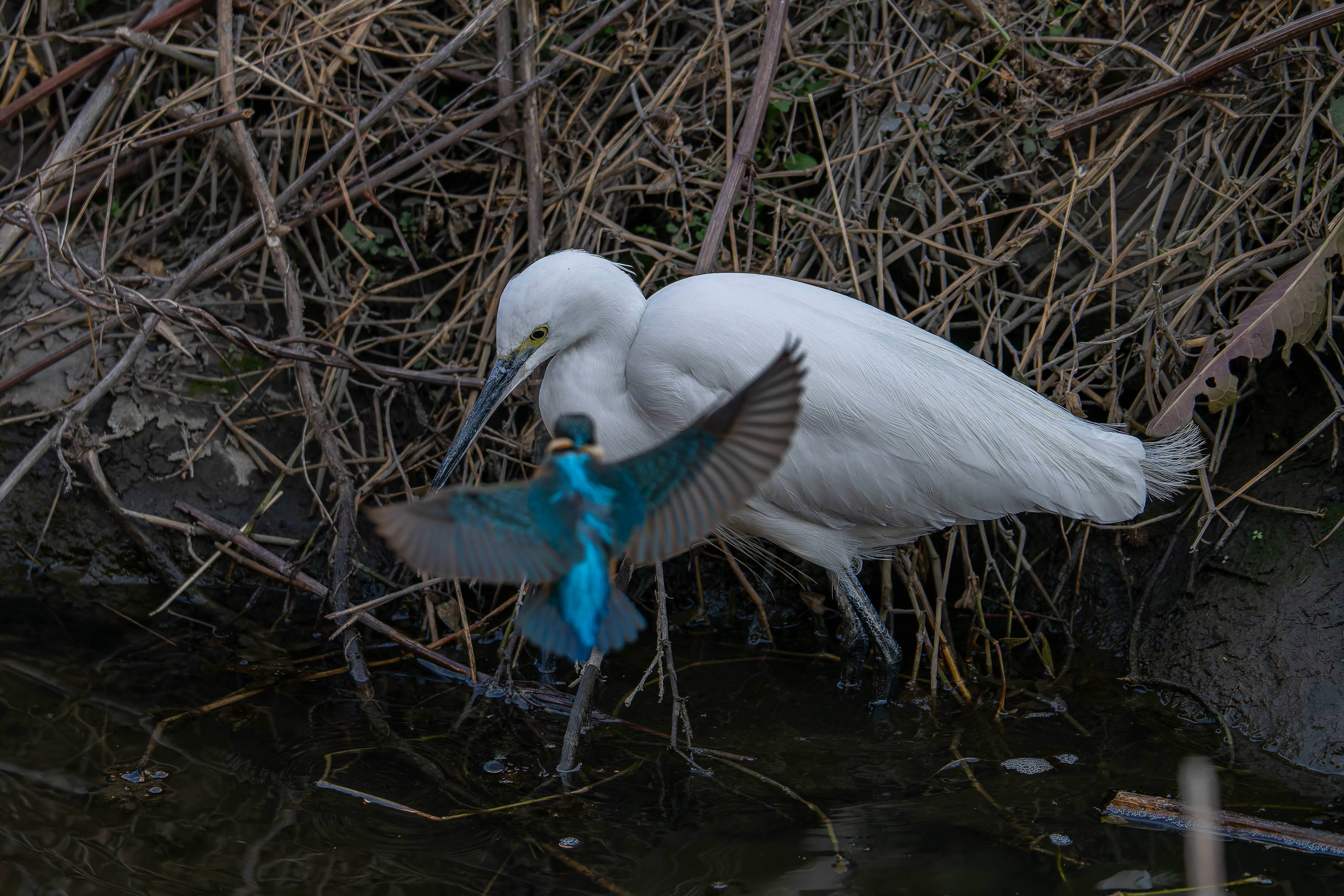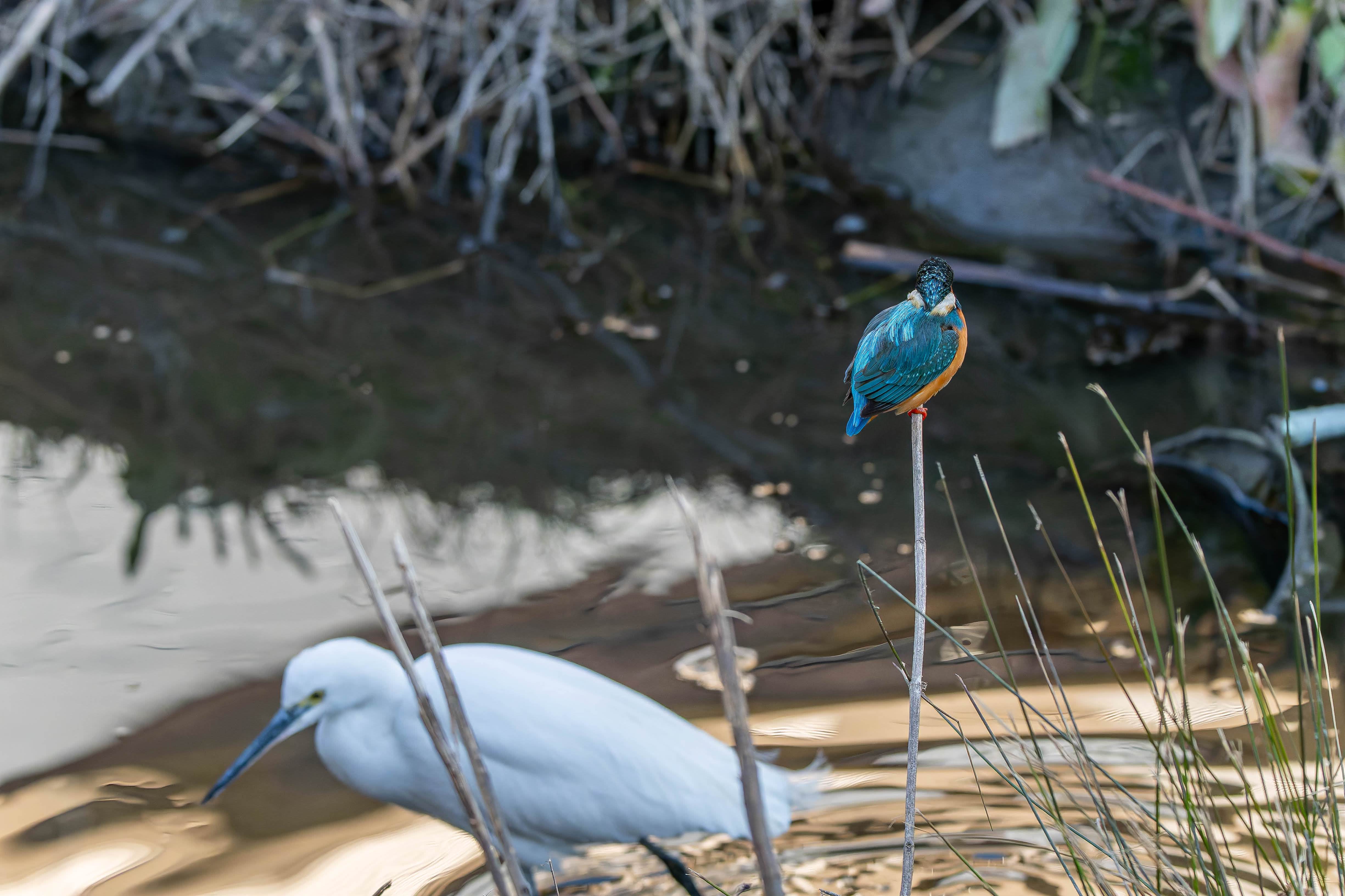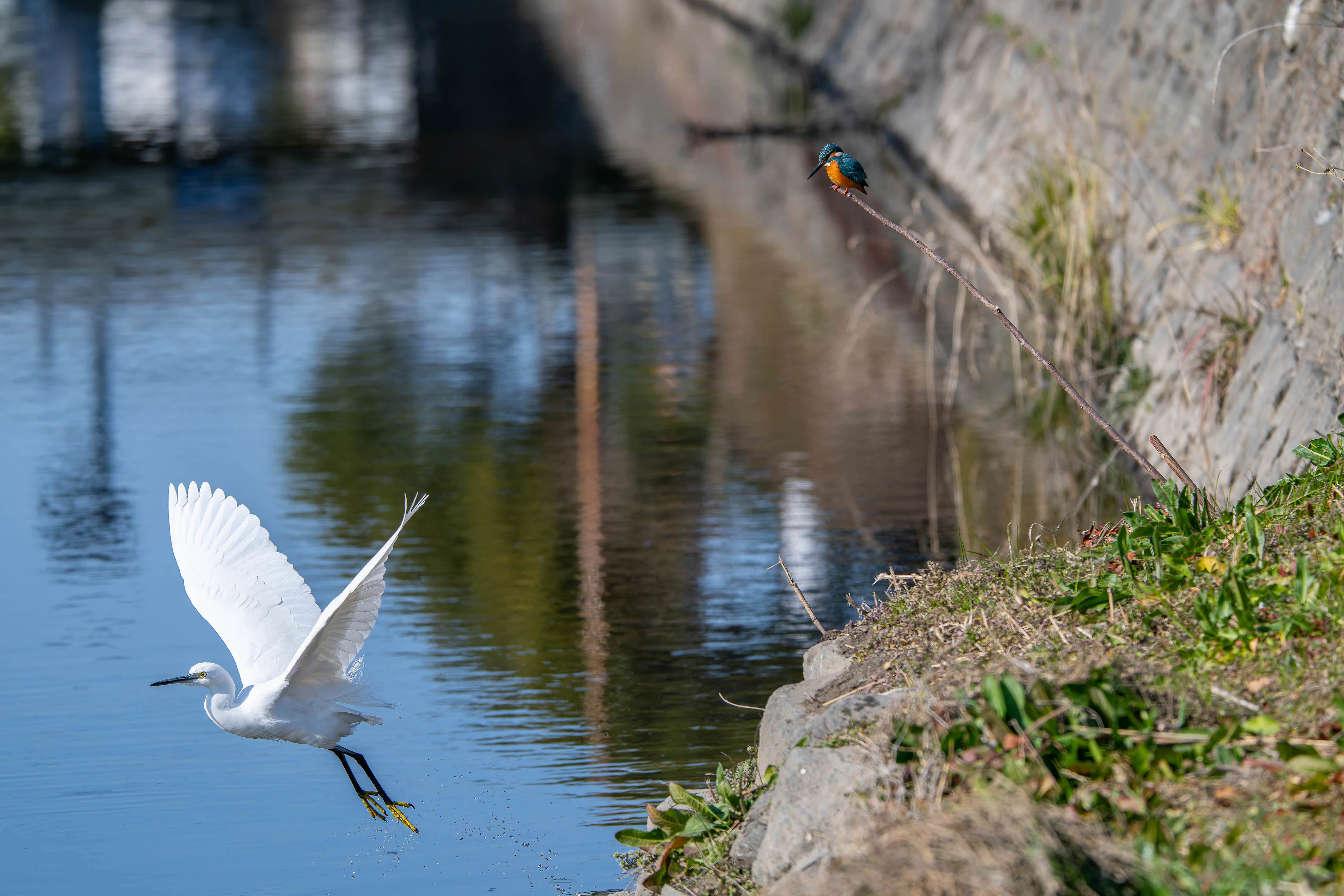 自分の縄張りに侵入してきたコサギを監視しているカワセミです。
