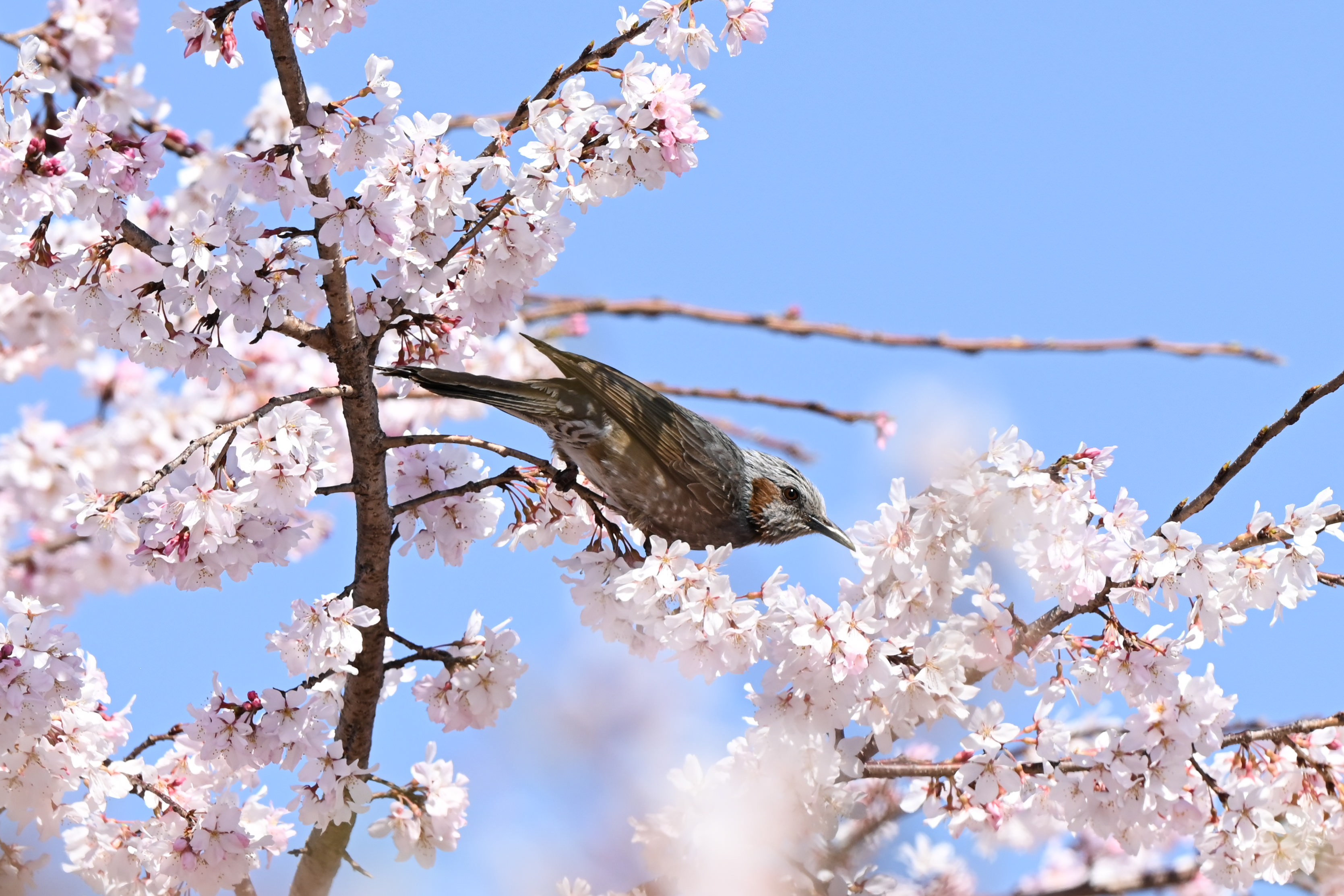 被写体検出の鳥認識がまだ無い世代でしたので少し手間取りましたが、青空の元、陽の光を浴びるヒヨドリに、桜の影がかかり美しく撮れたと思いました。