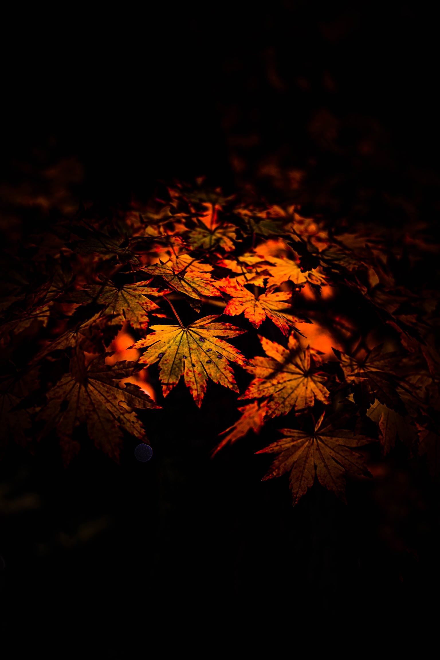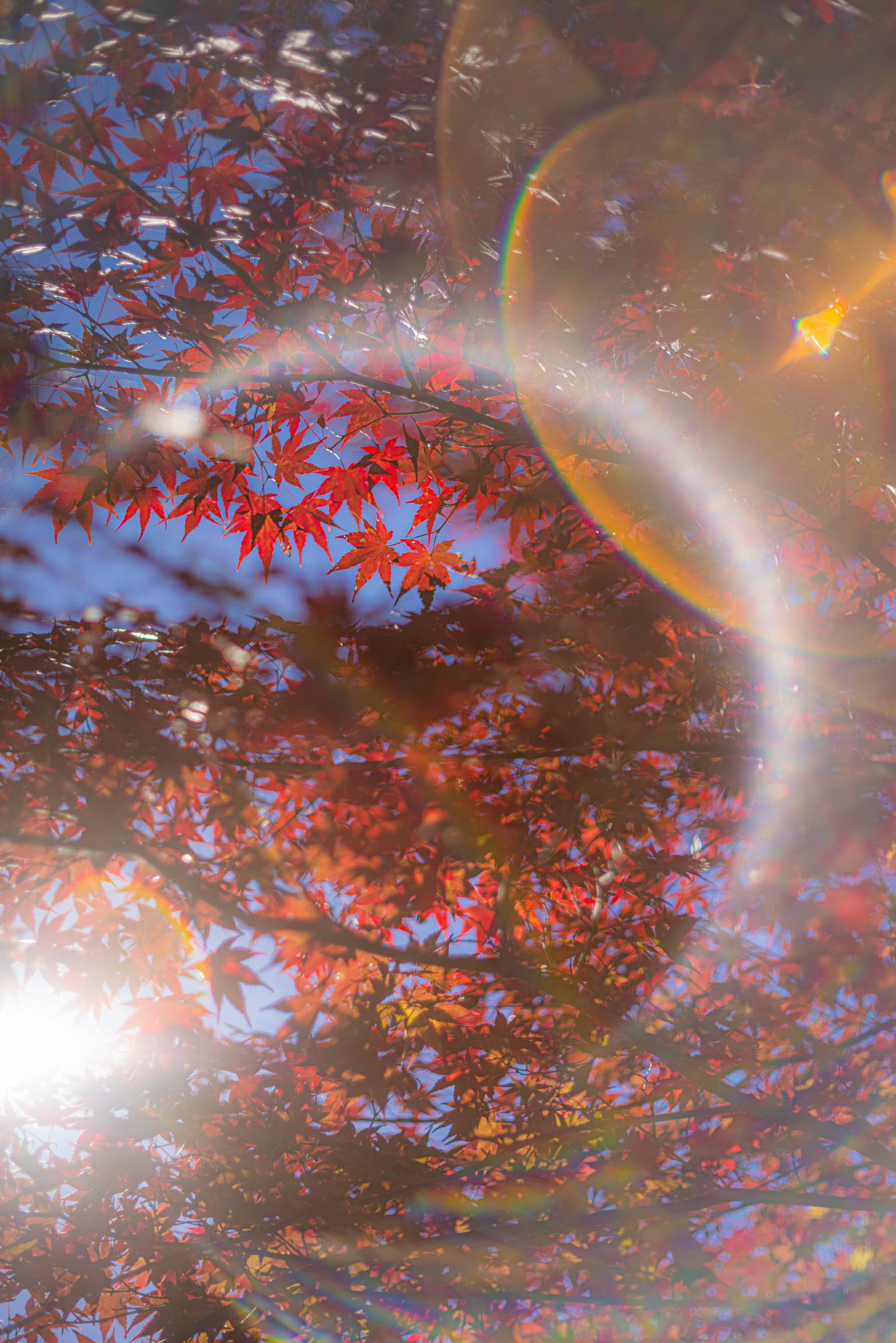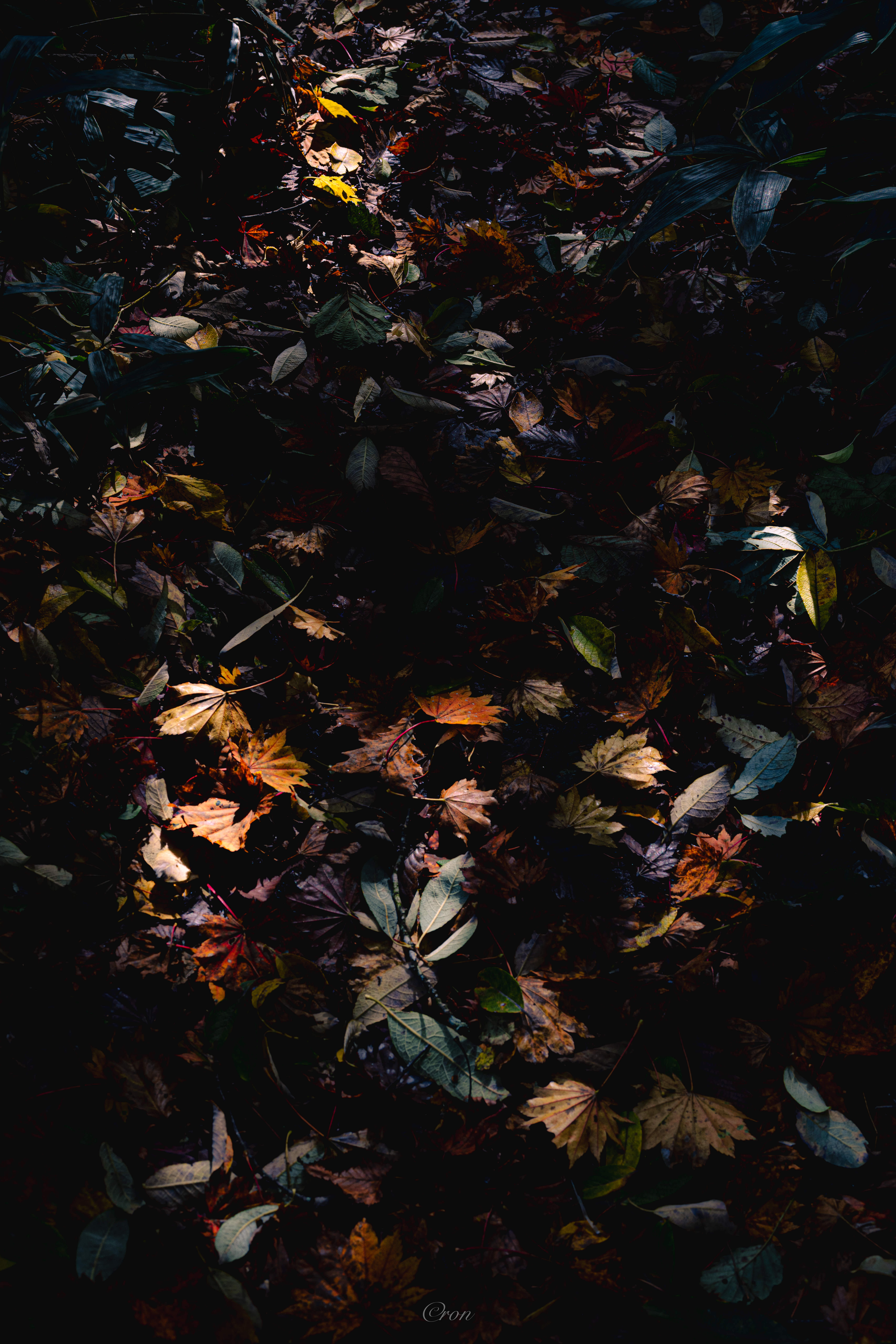 色とりどりの落ち葉に朝日が差し込んできたところです