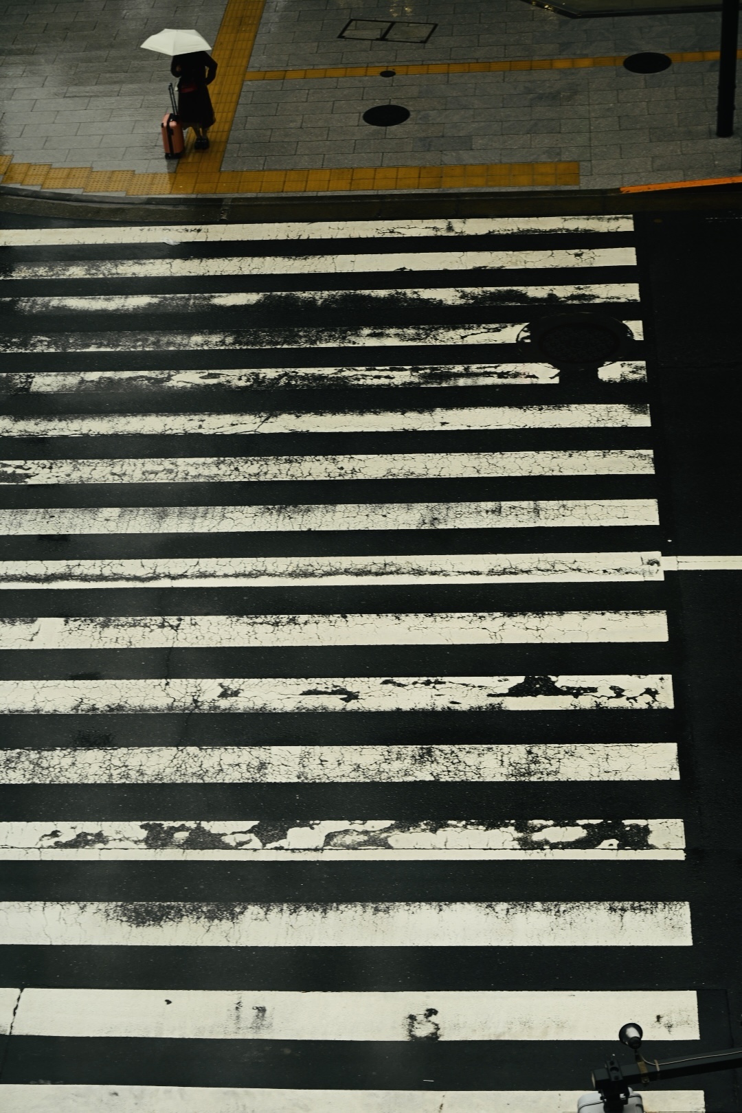 信号が変わる間際に横断する女性 その傘はレインボーとても印象的だった