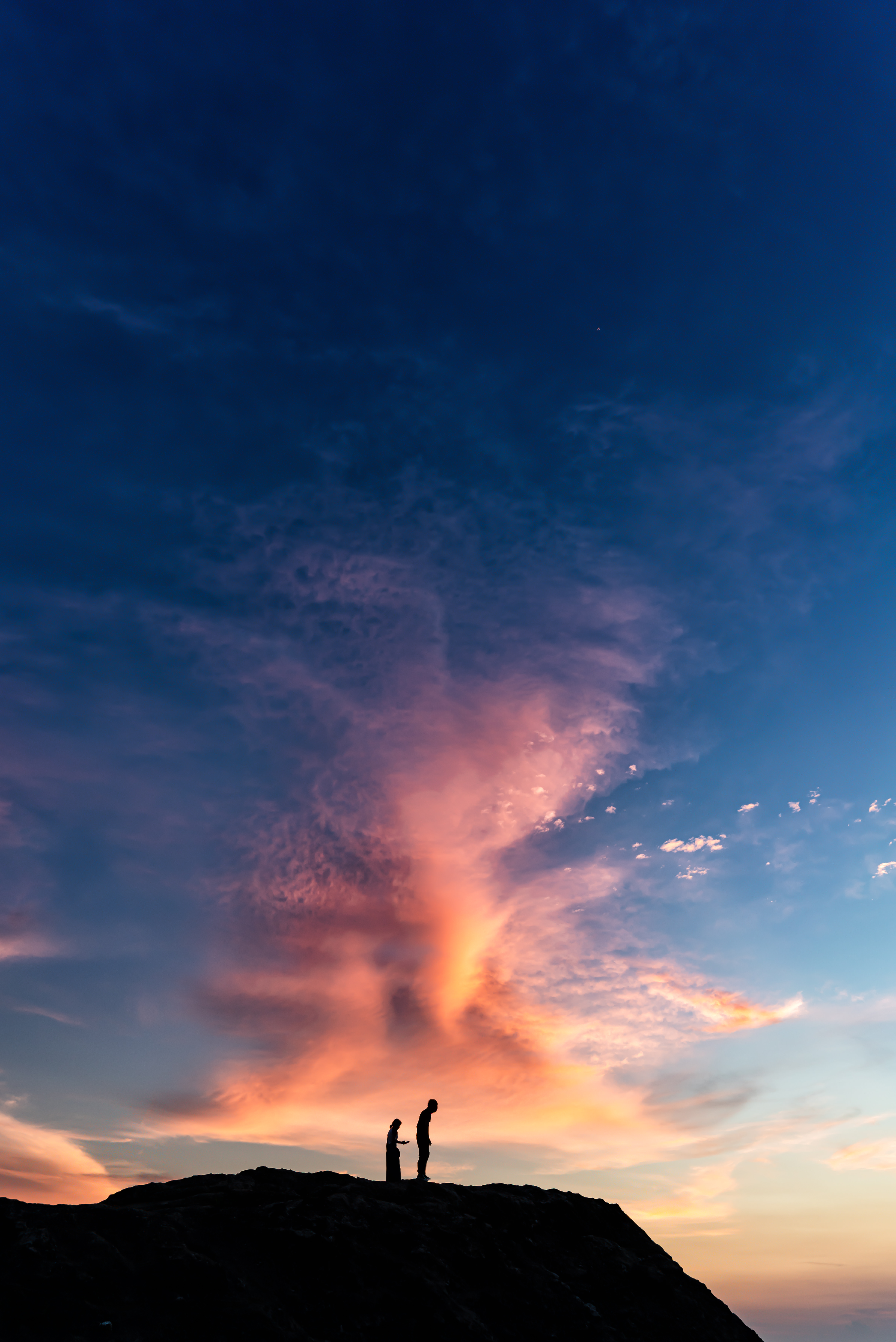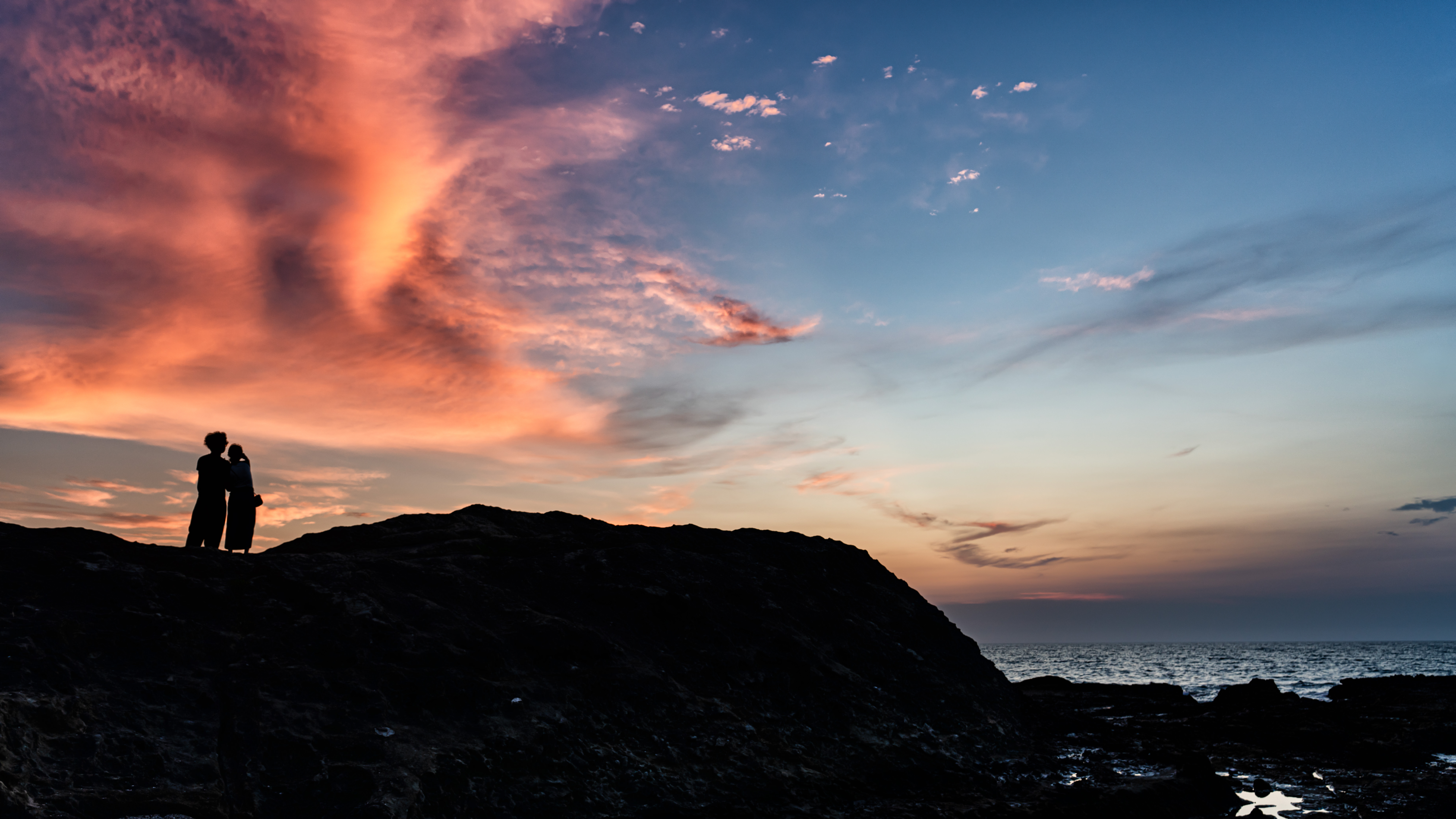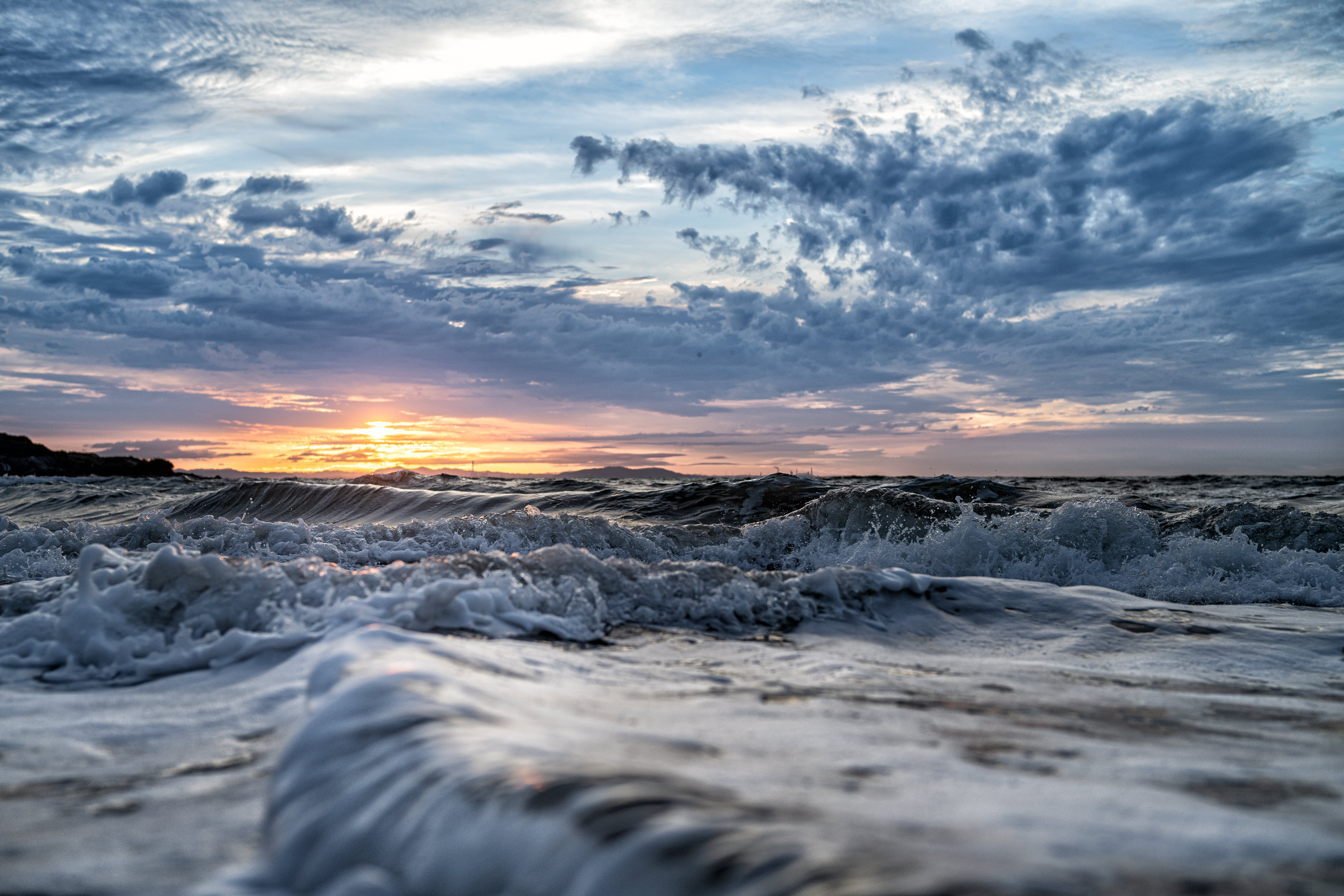 朝焼けの空、太陽がとても綺麗で、波や岩の流れがそこに向かう旅路のように感じました。