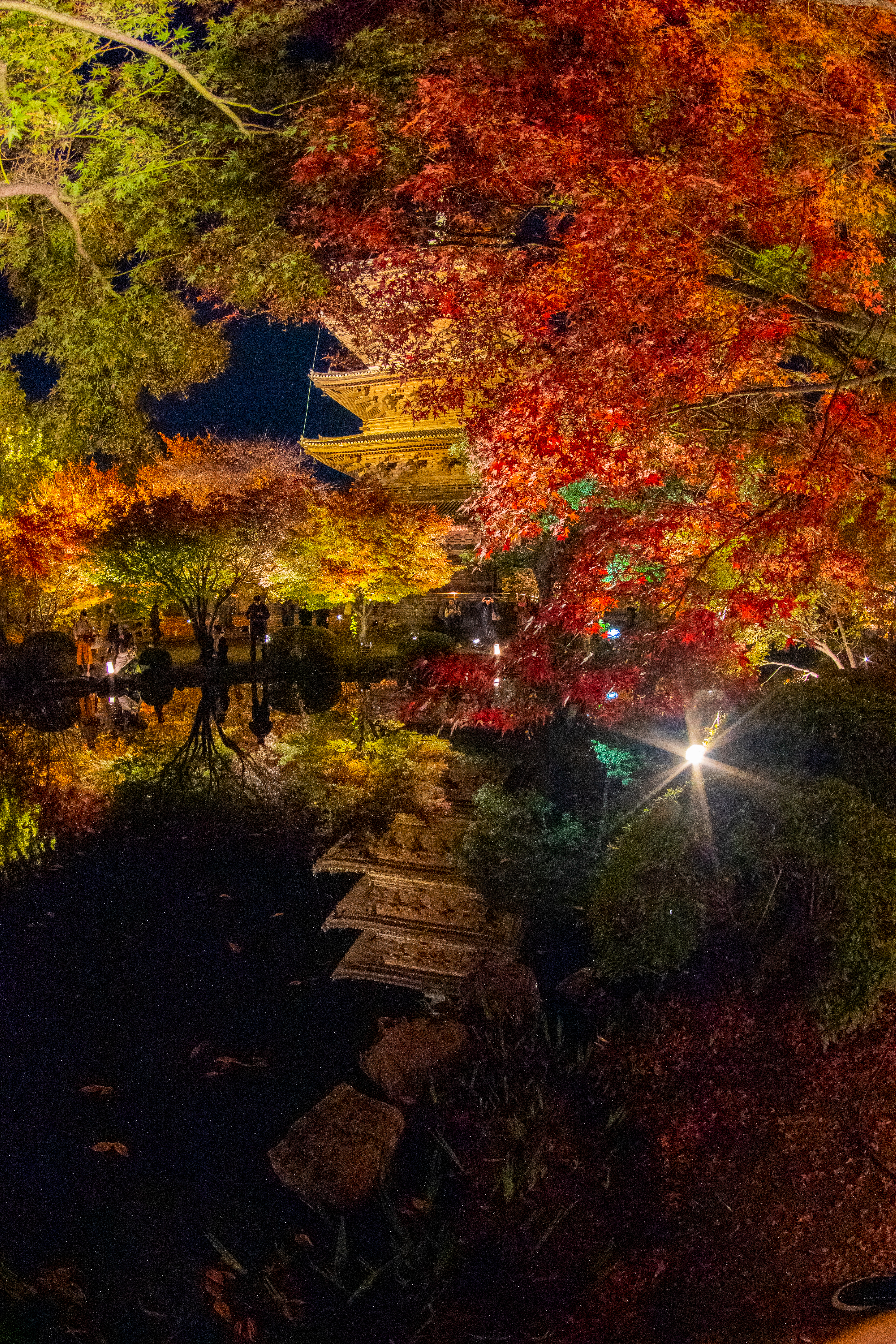 明るく照らされた五重塔が立派な紅葉に頭を隠していますが、実は池に映りこんでいます。