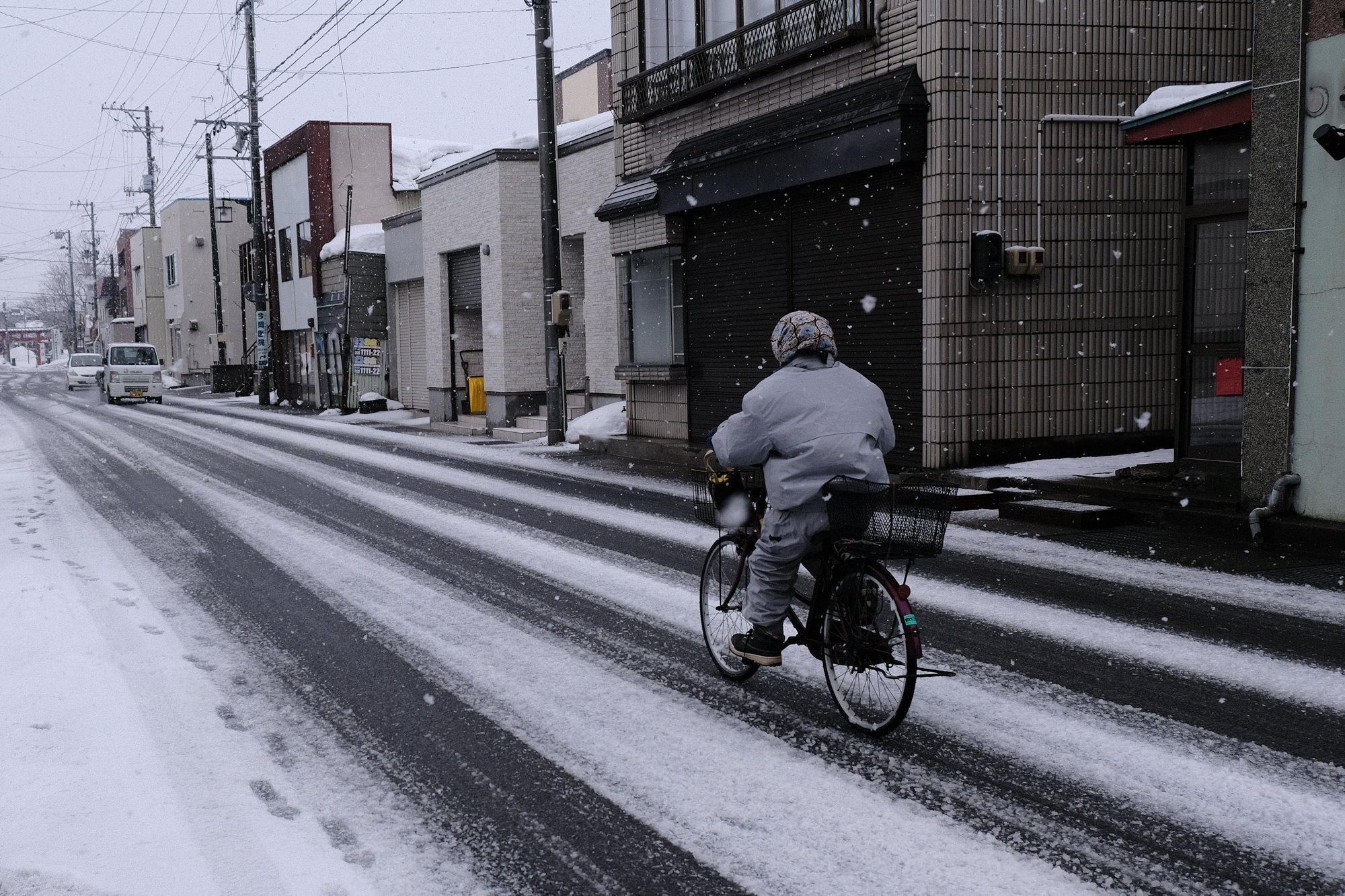 雪煙に見えか隠れしながら、小さなディーゼル列車が走る。まるで雪の海を走るようだった。