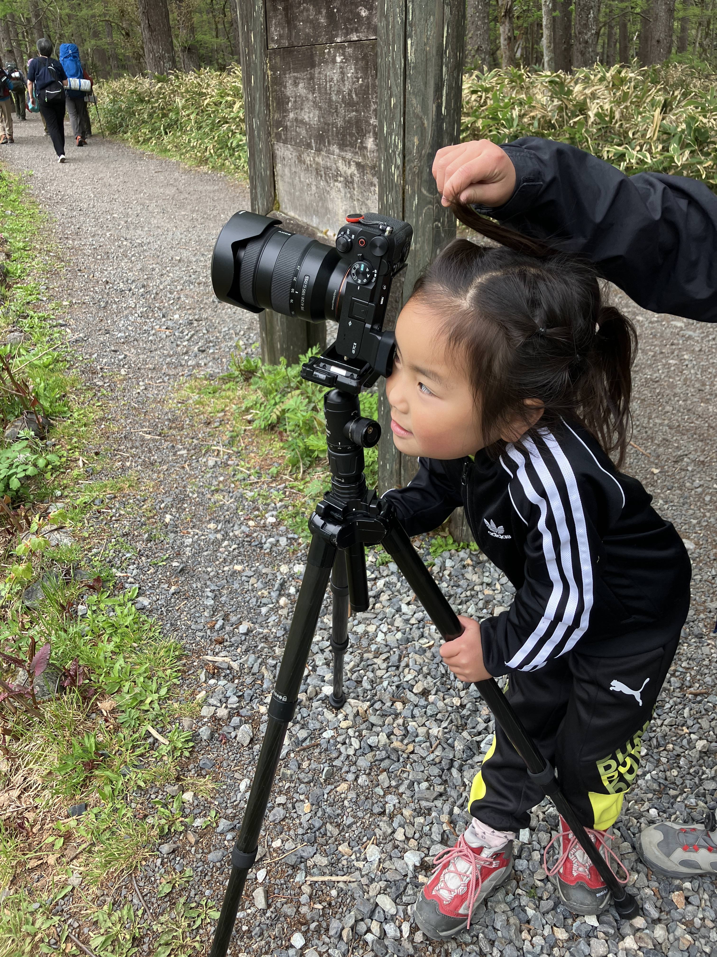 家族で上高地へ。父親のマネをしてファインダーを覗く幼稚園児の三女。頼もしい相棒に成長してもらいたいな。