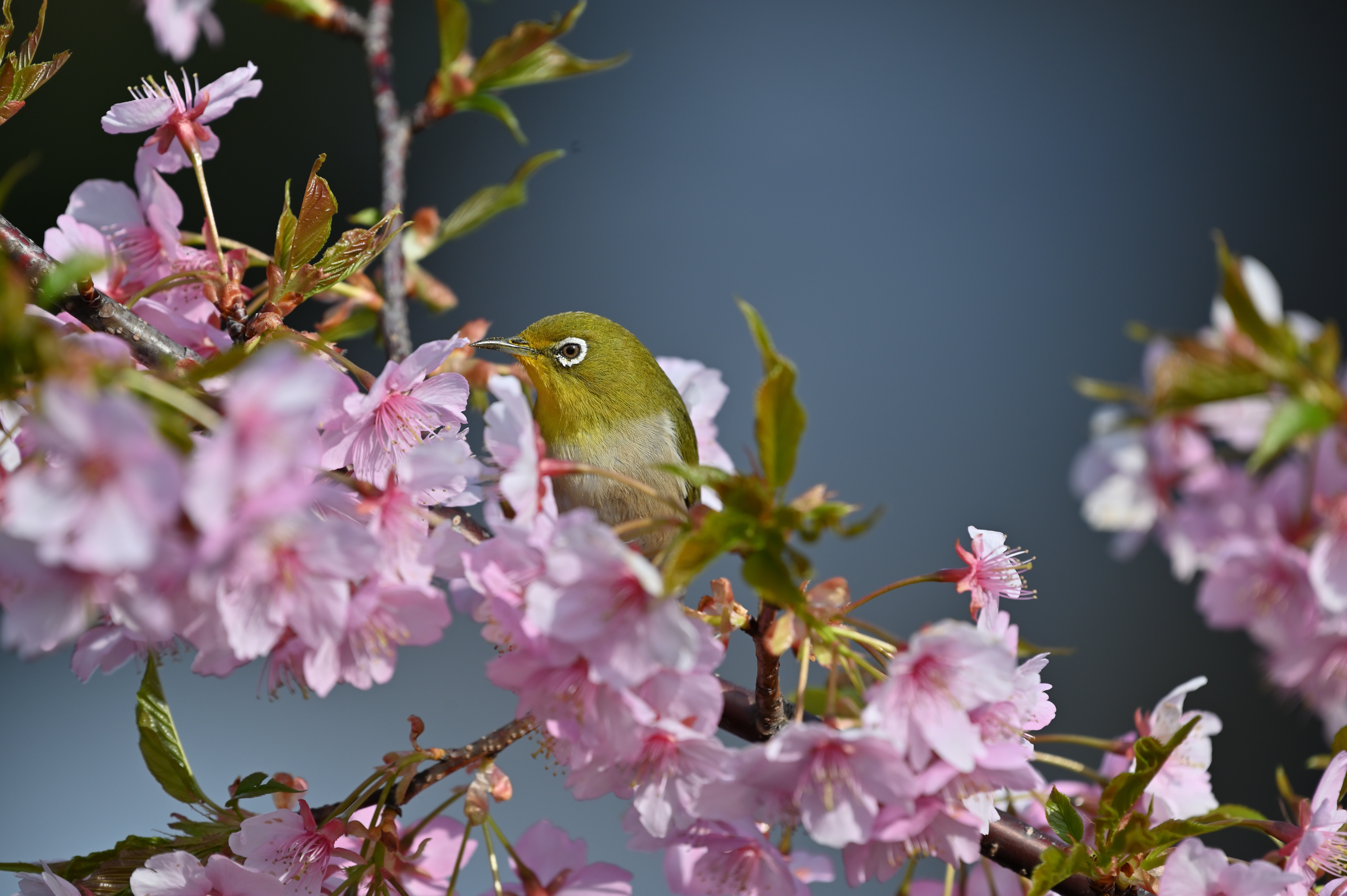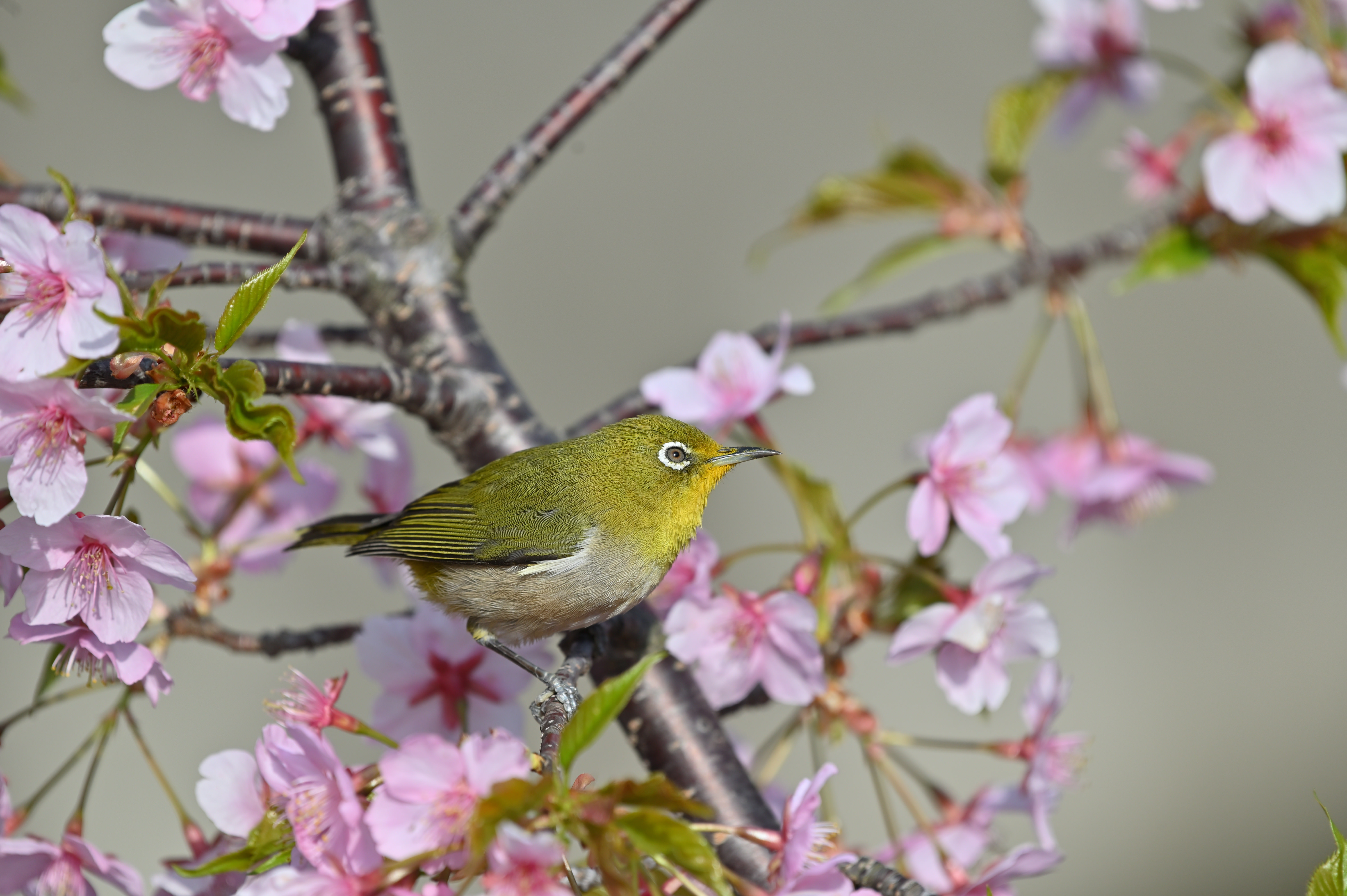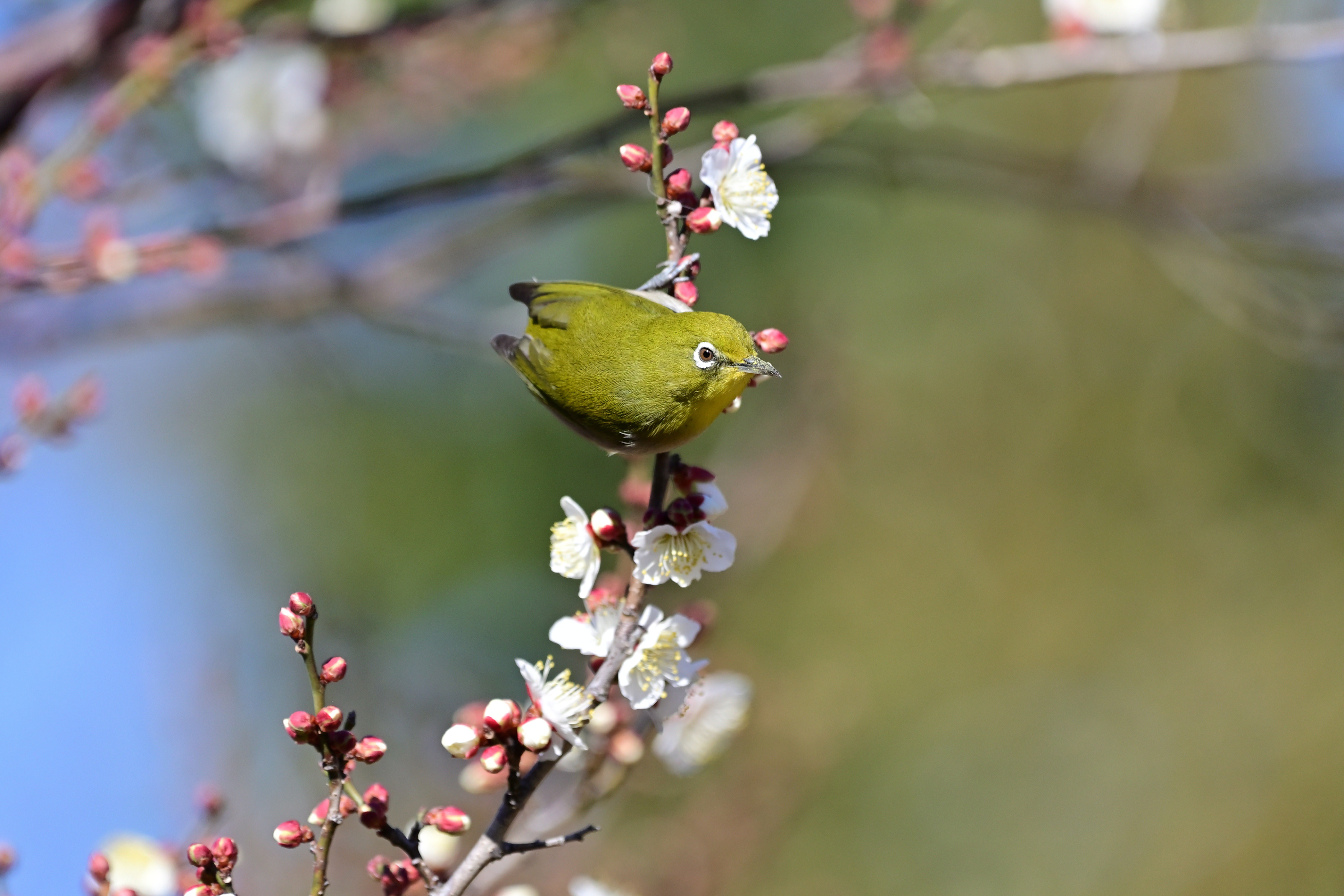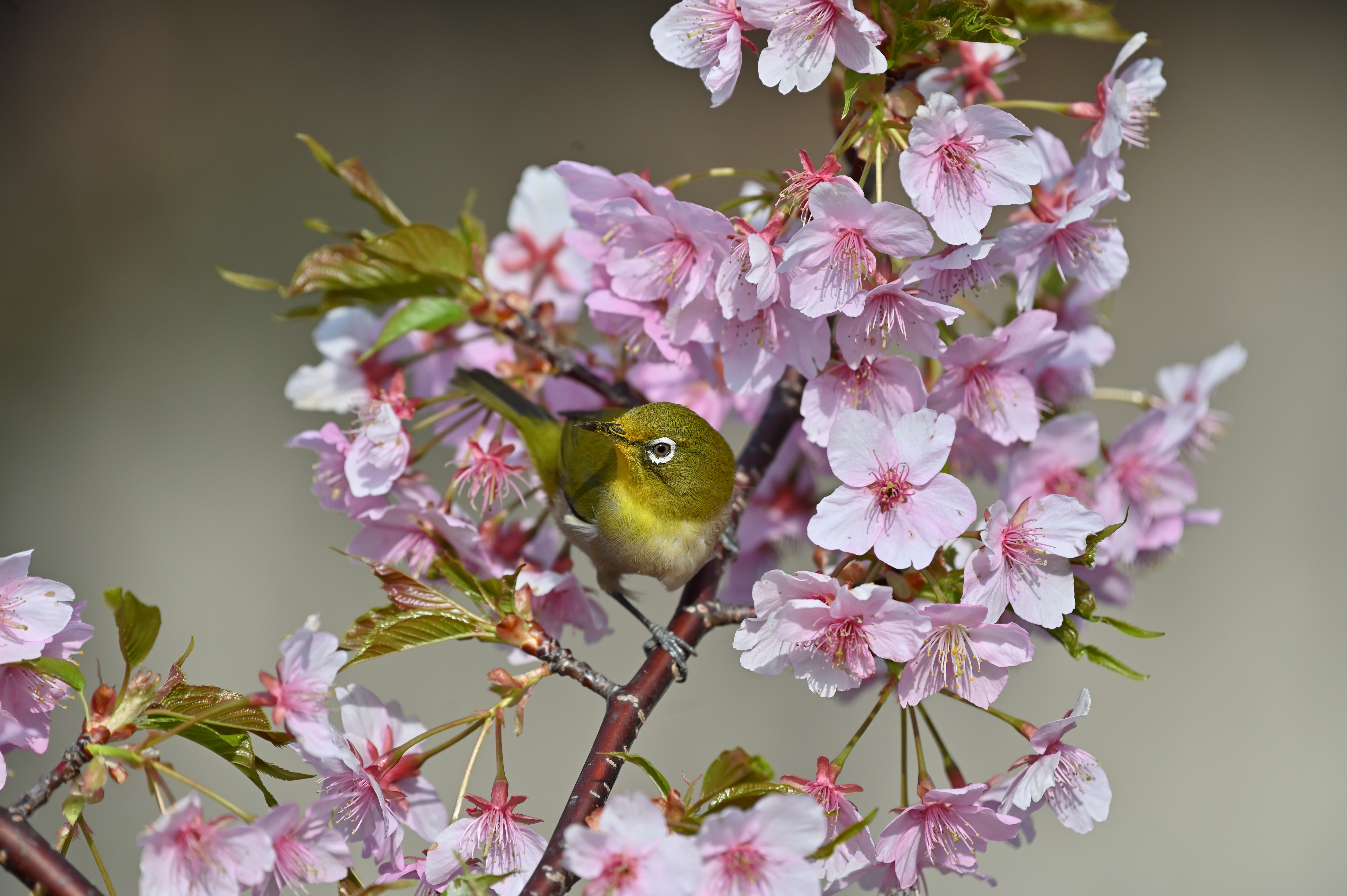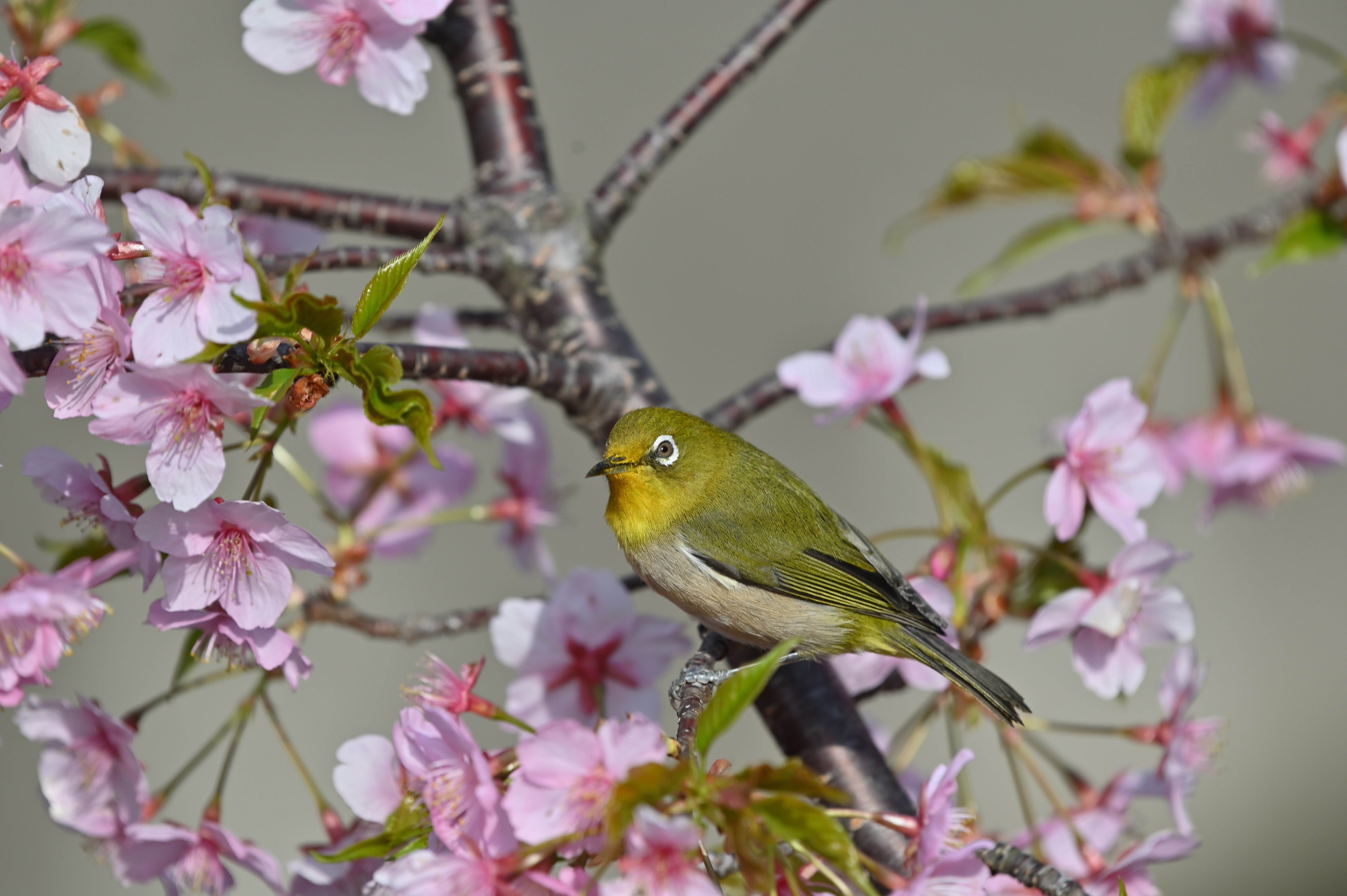 近くの公園では、いろいろな花が咲き始めました。今日は橋の袂の小さな桜の木にメジロがつがいでやってきました。