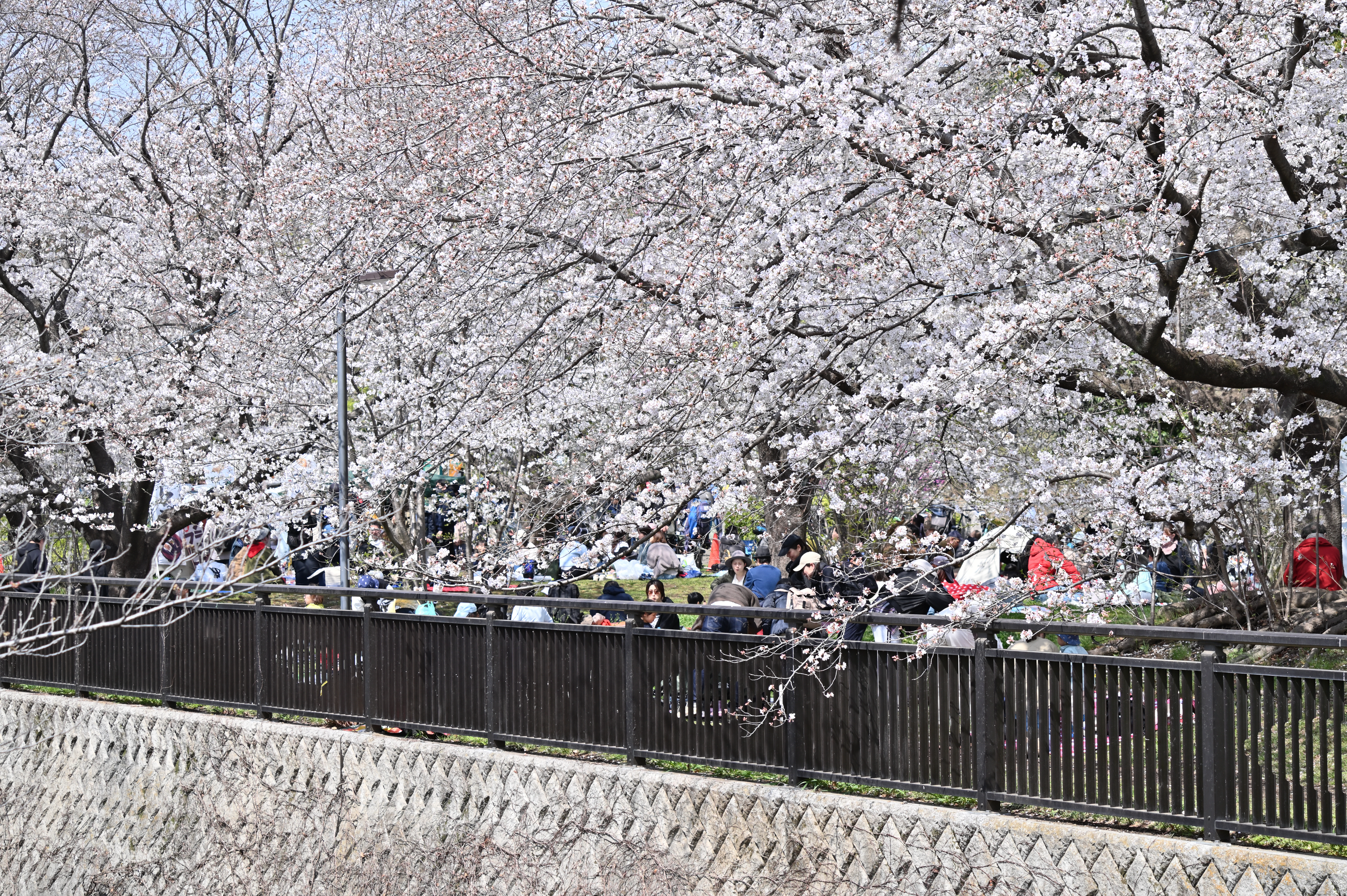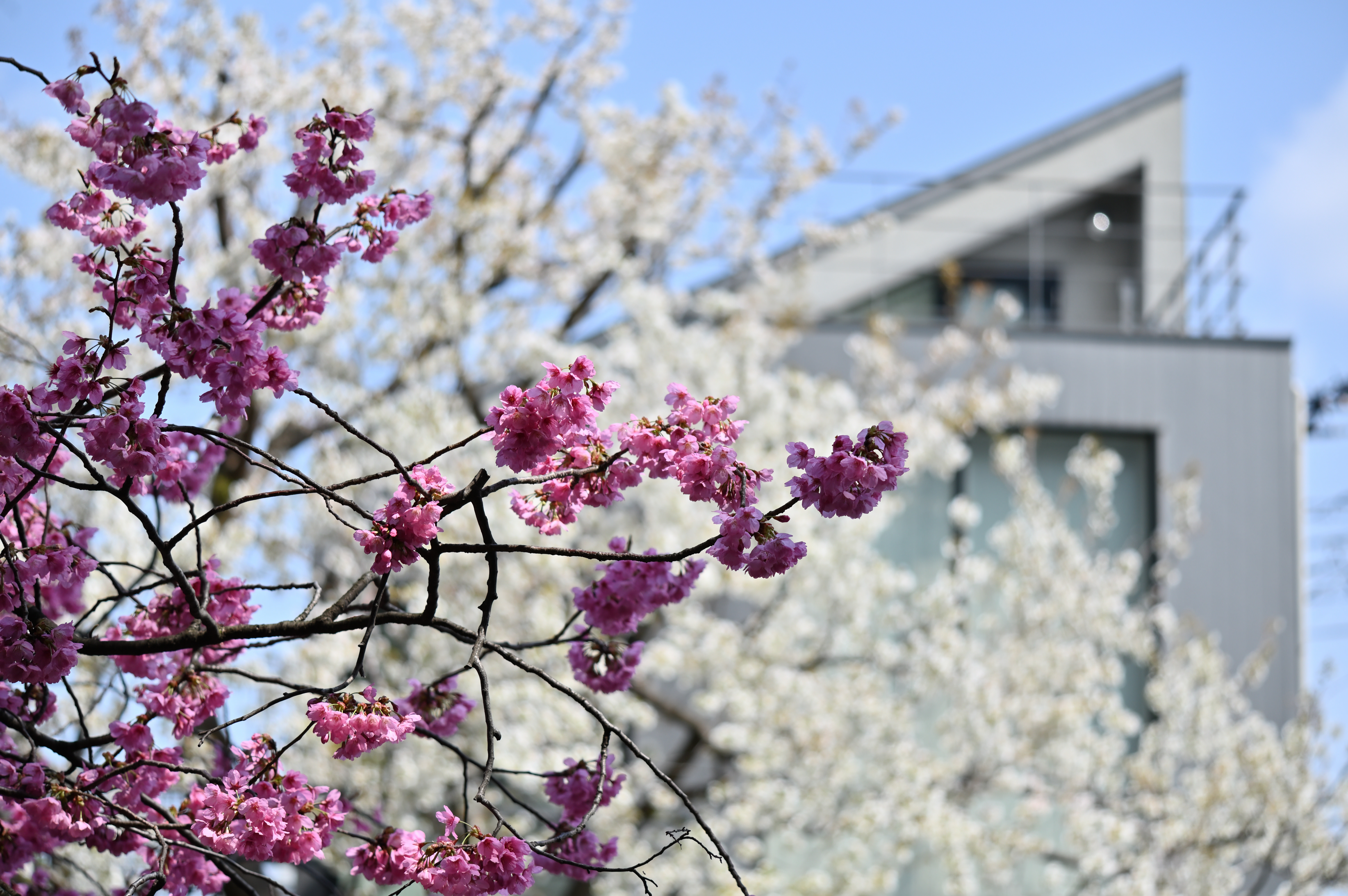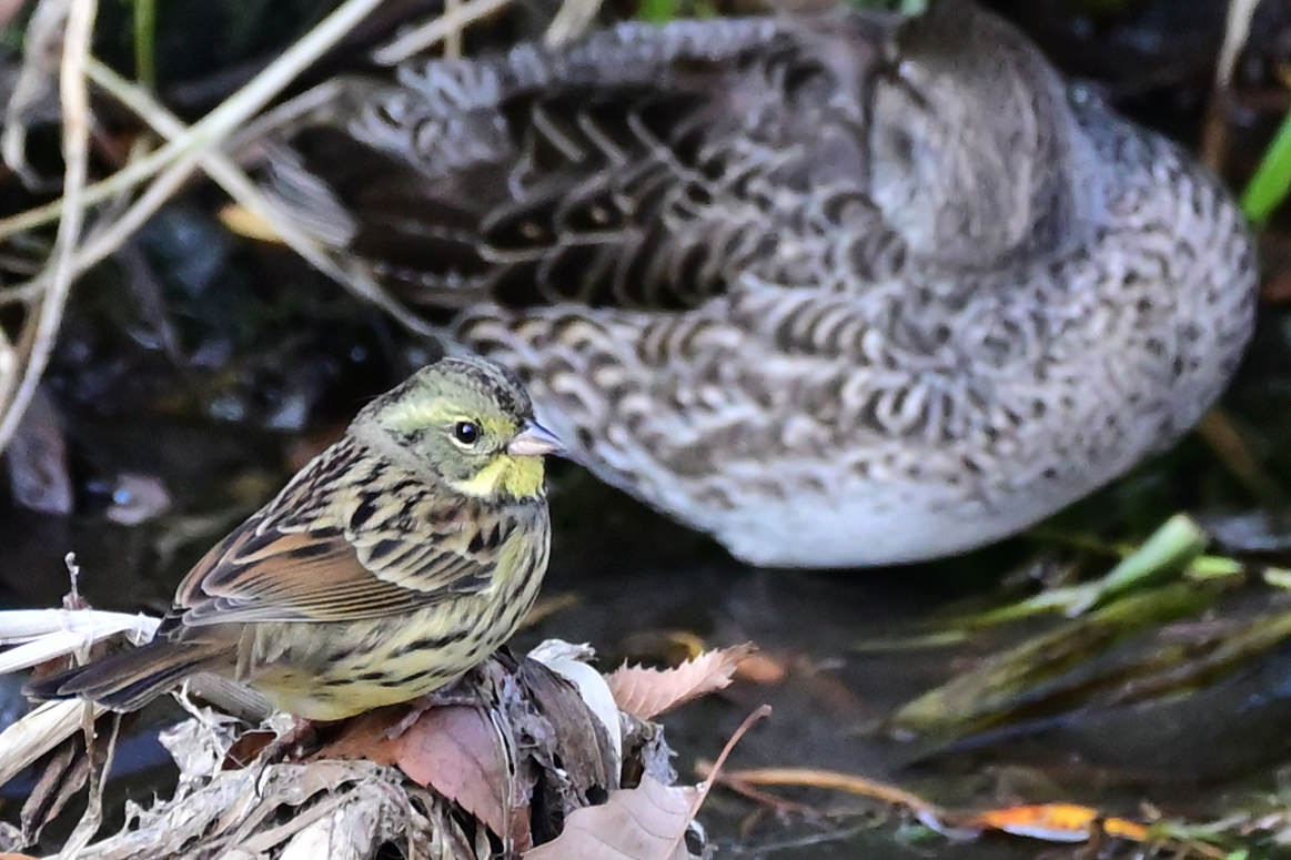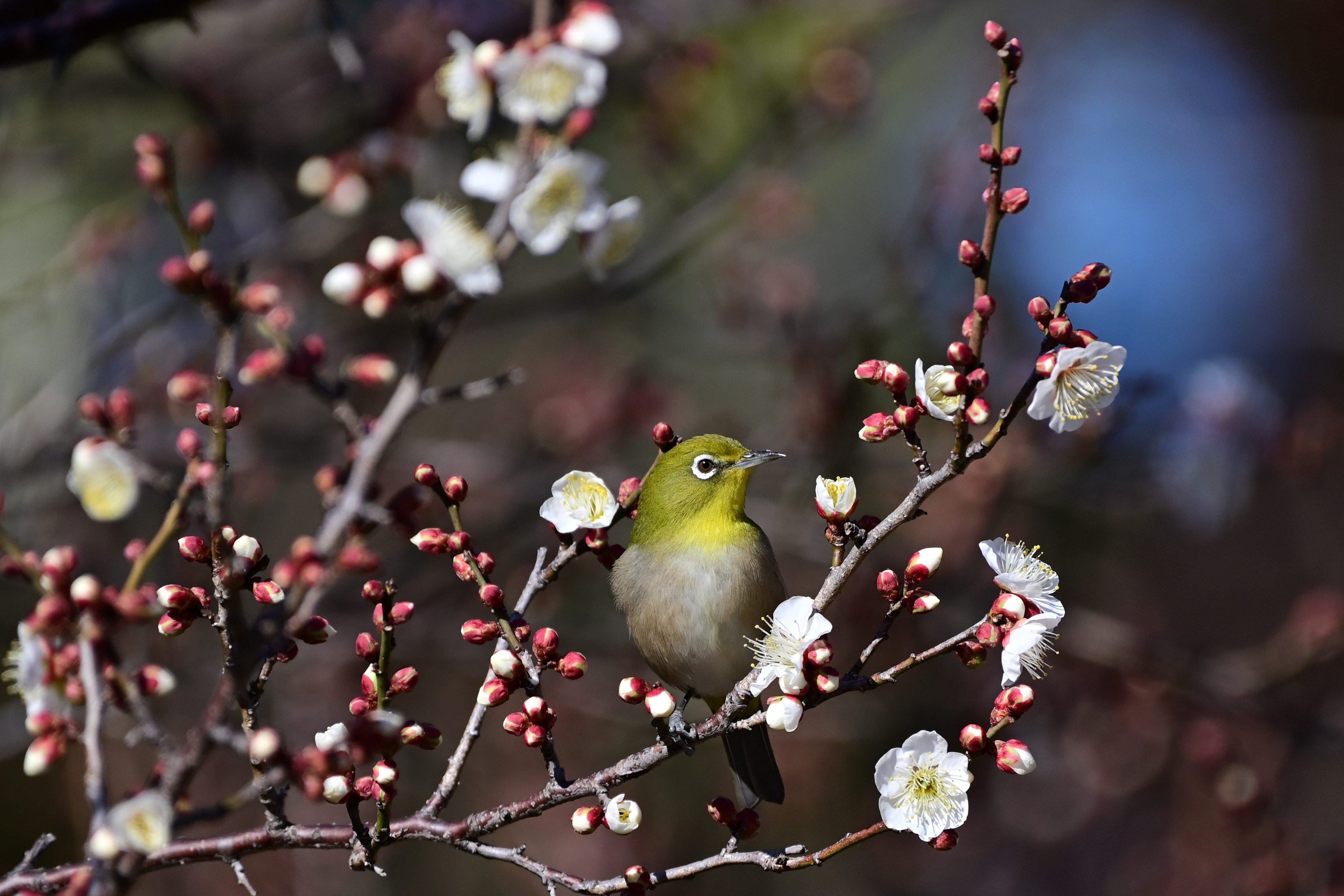 近くの公園では、いろいろな花が咲き始めました。今日は橋の袂の小さな桜の木にメジロがつがいでやってきました。