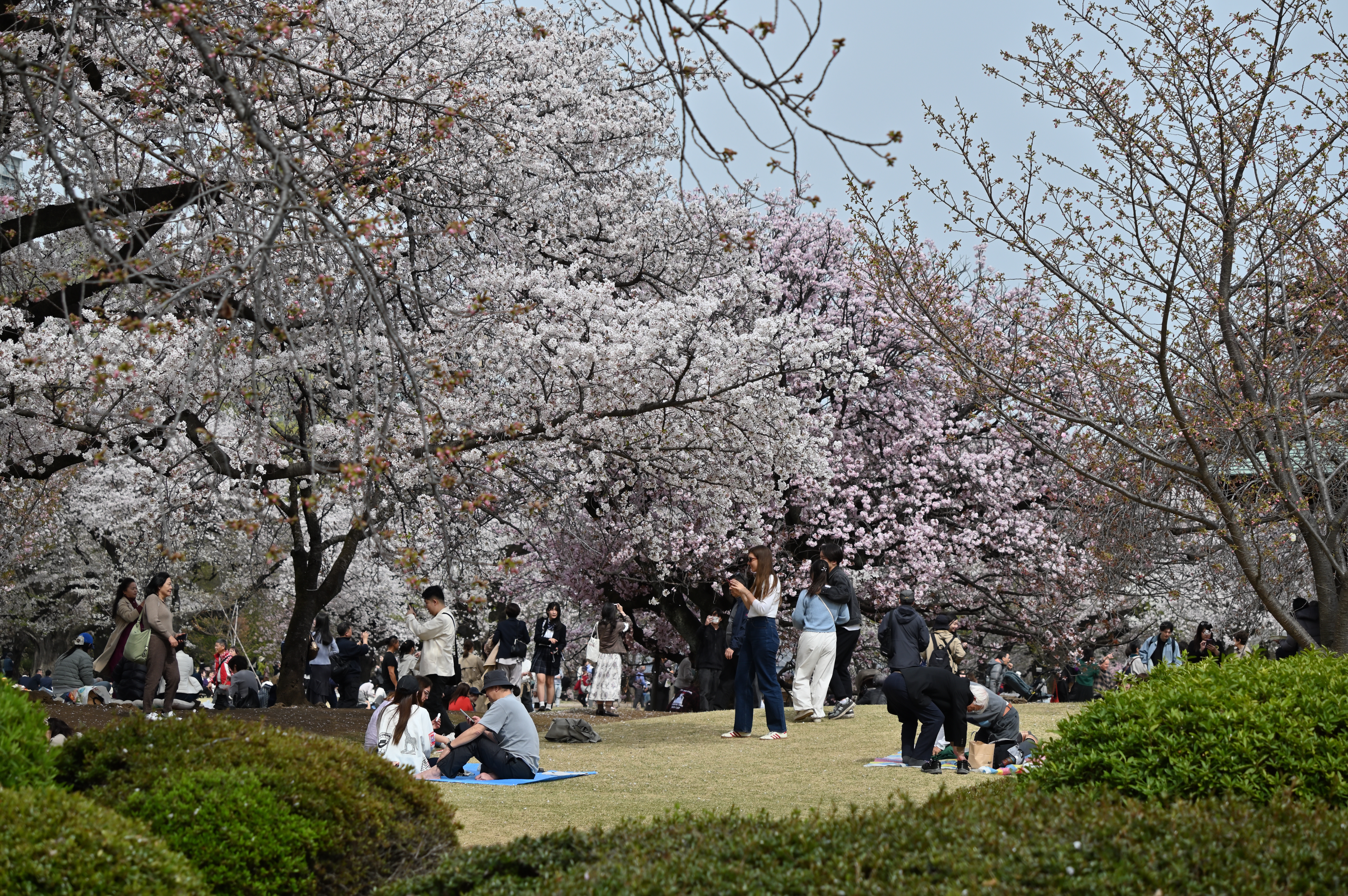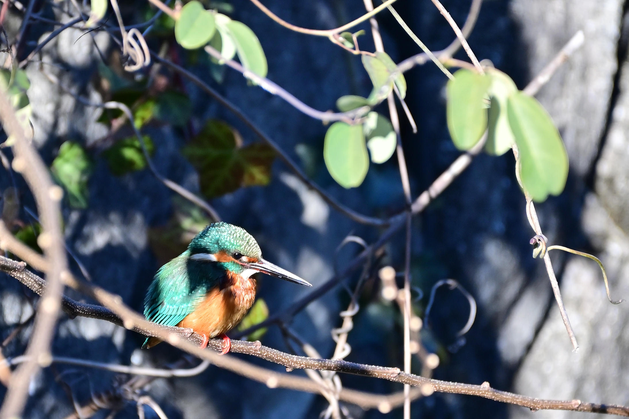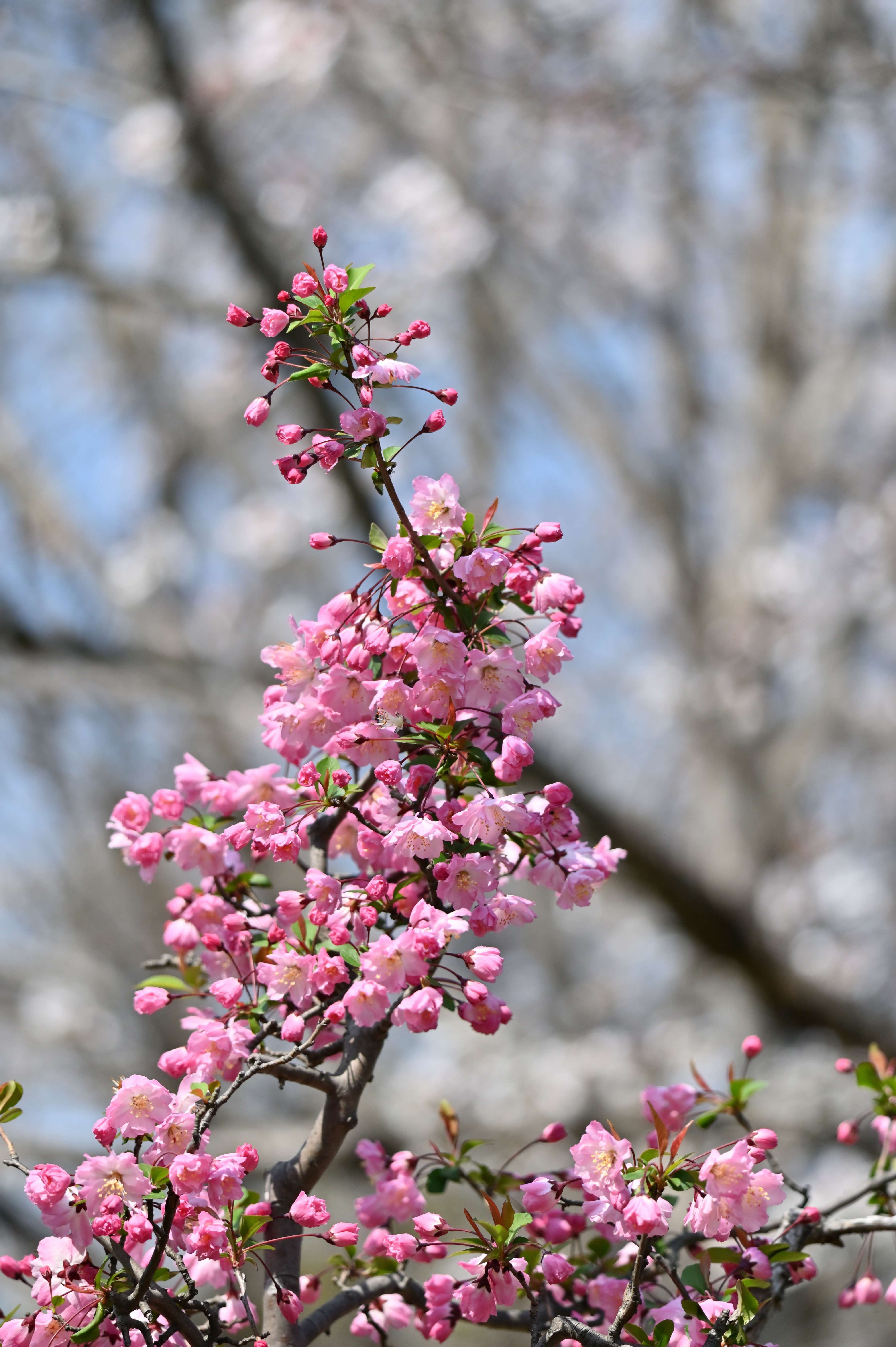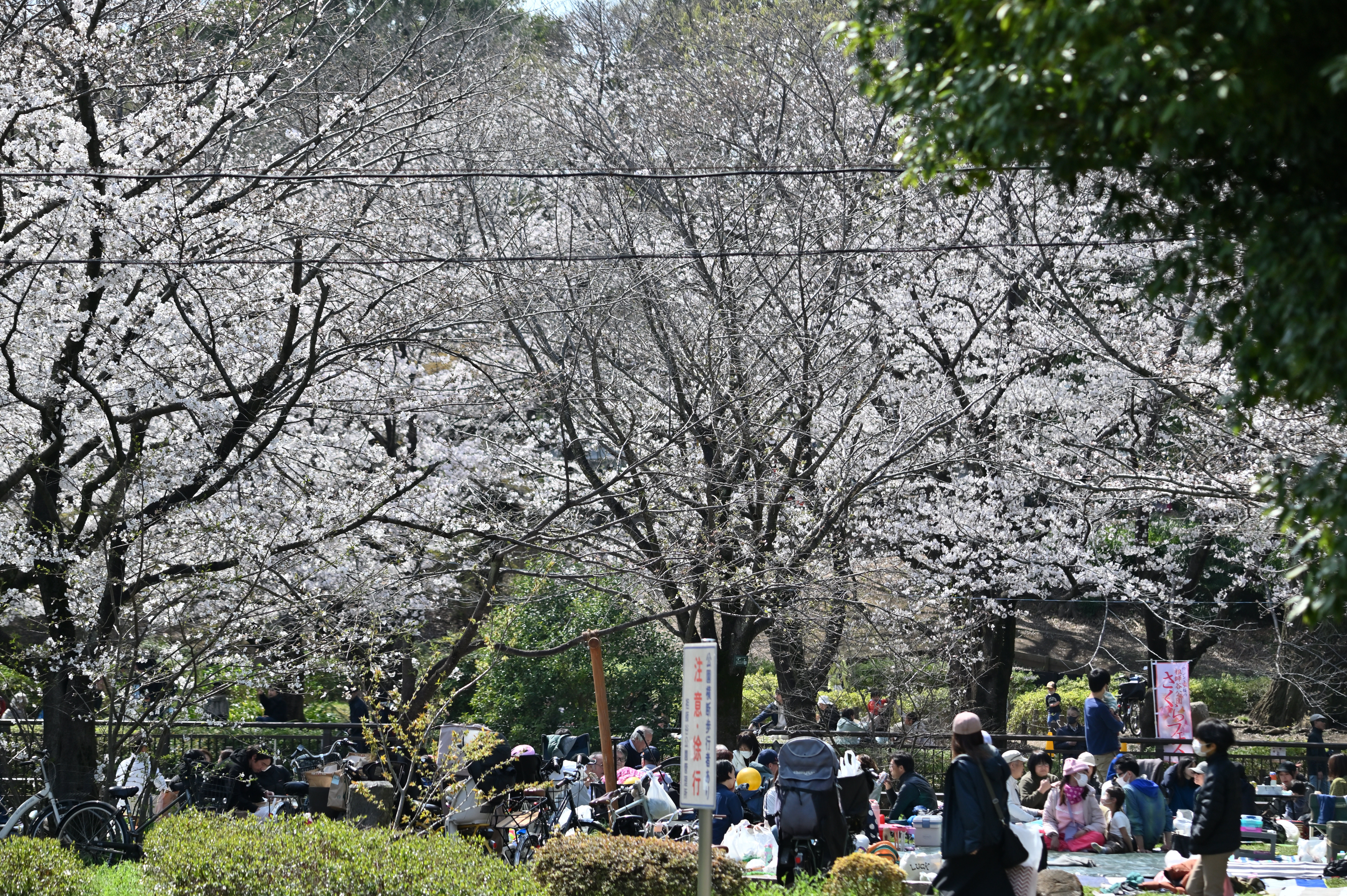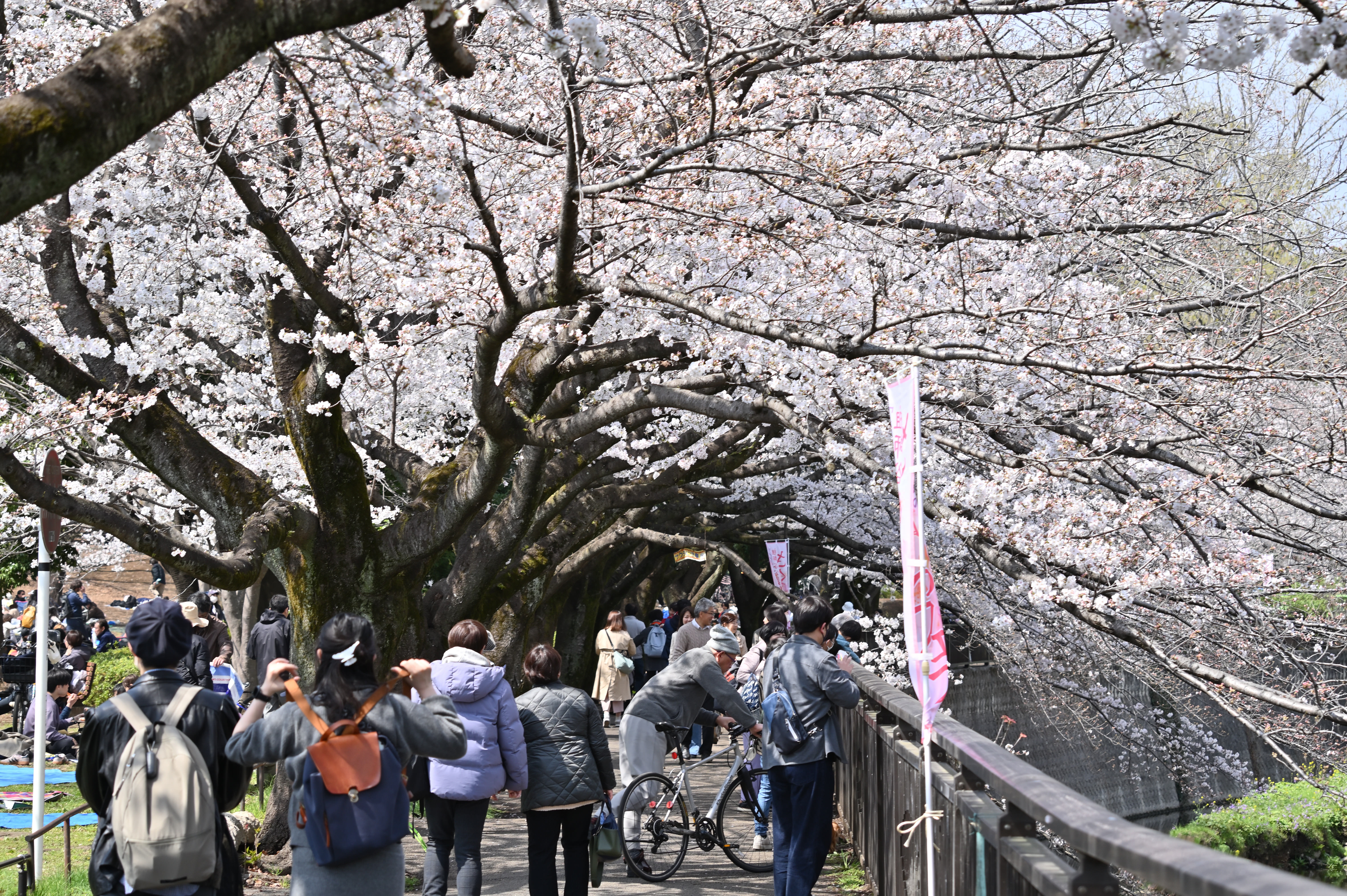近くの公園では、いろいろな花が咲き始めました。今日は橋の袂の小さな桜の木にメジロがつがいでやってきました。