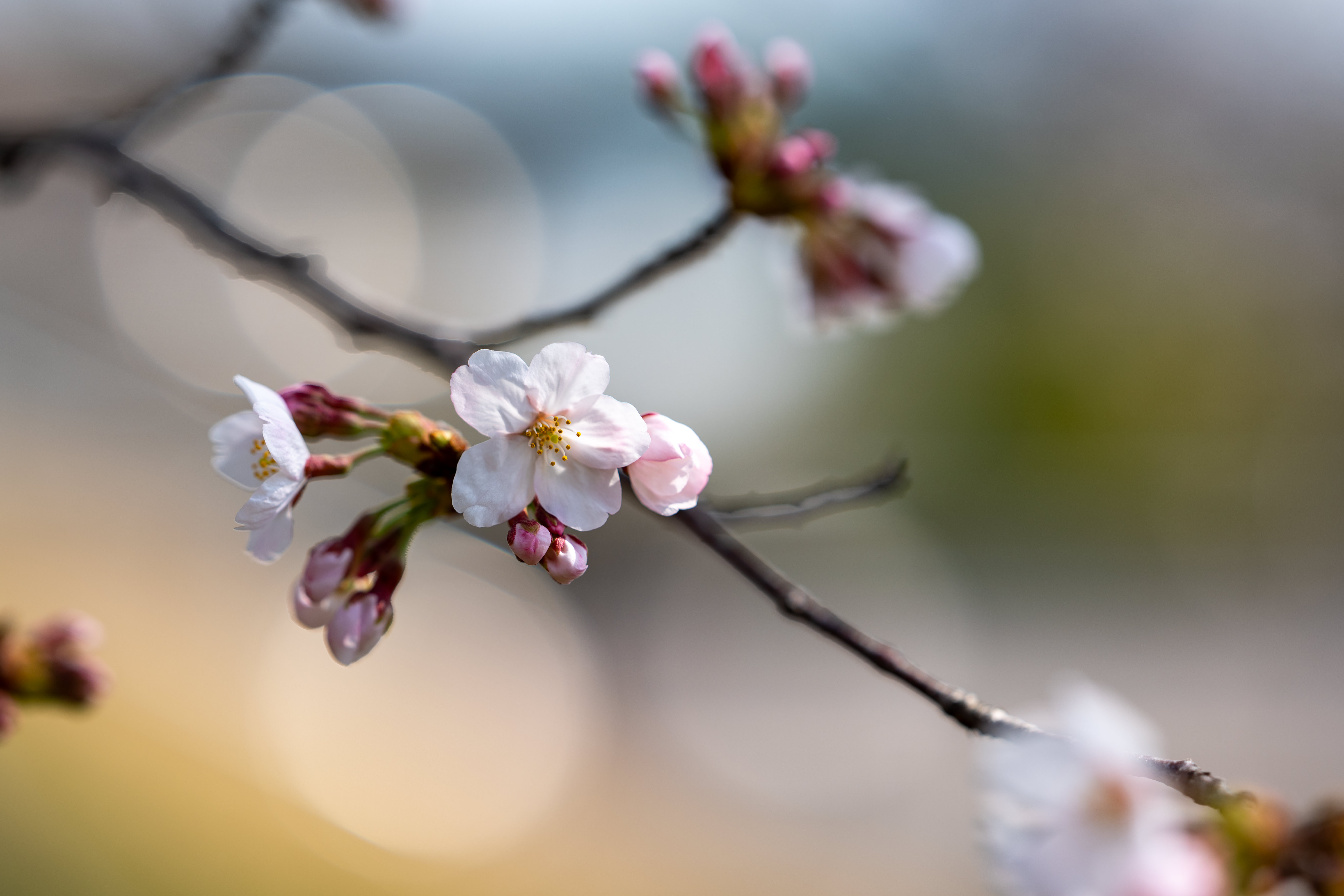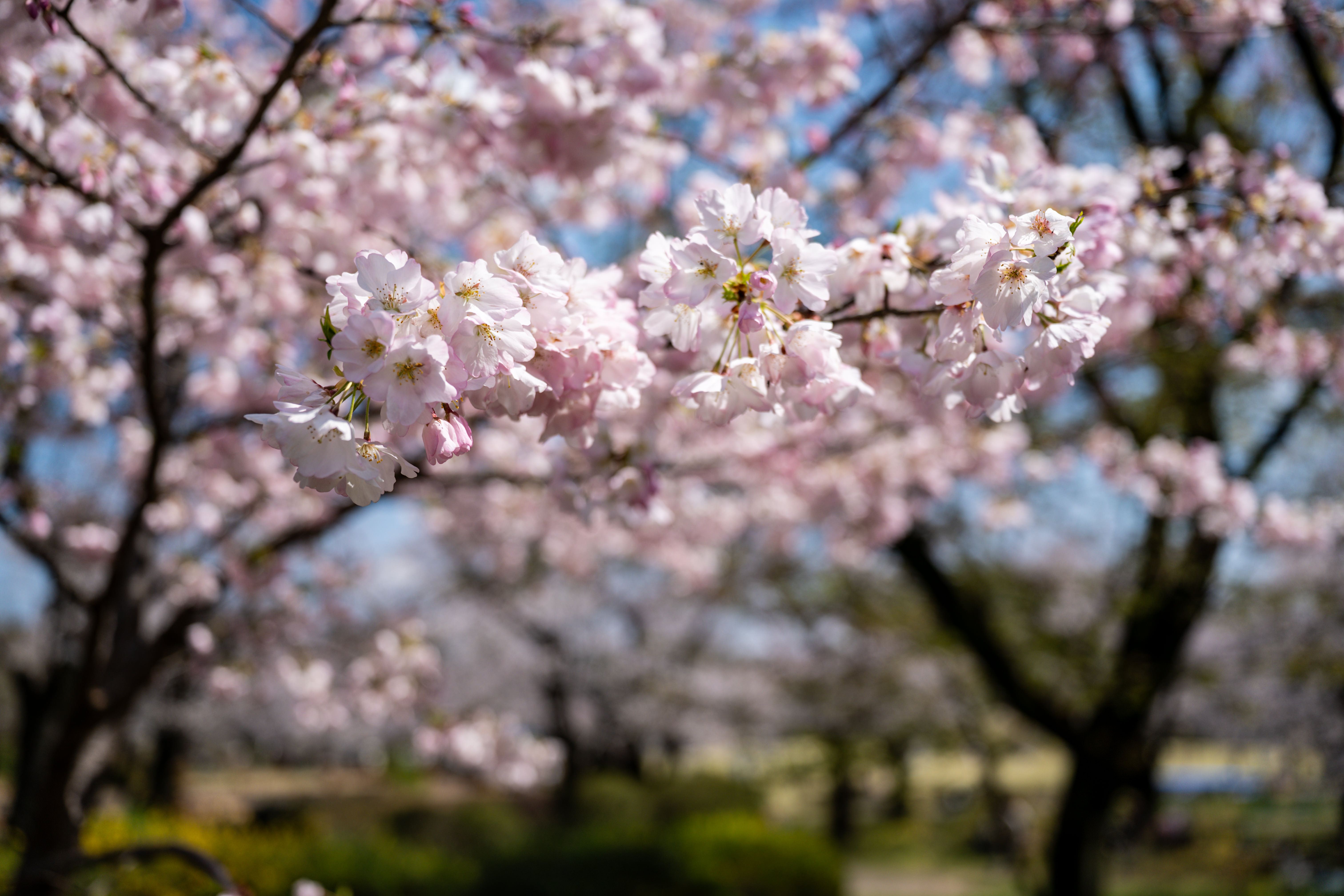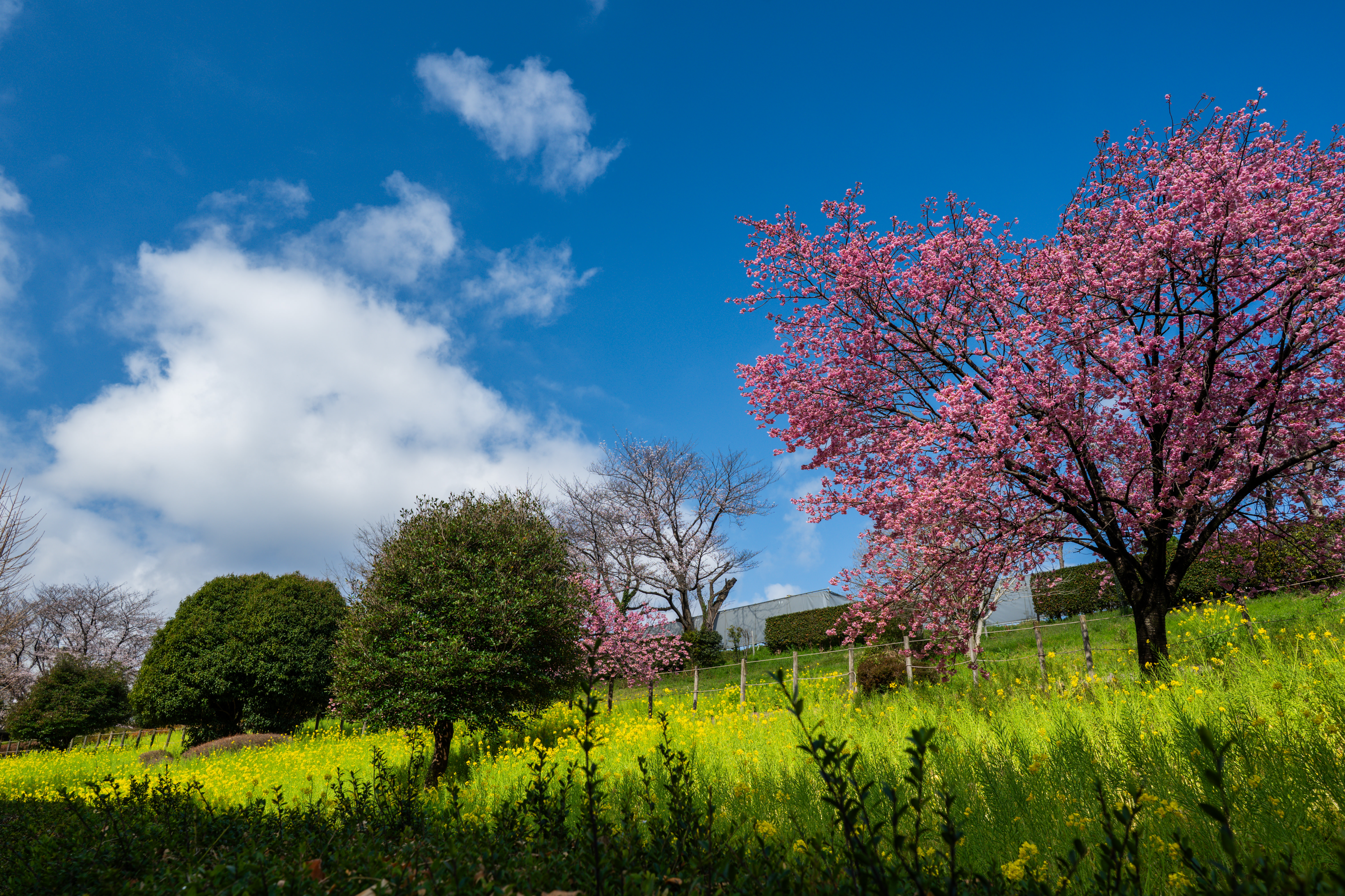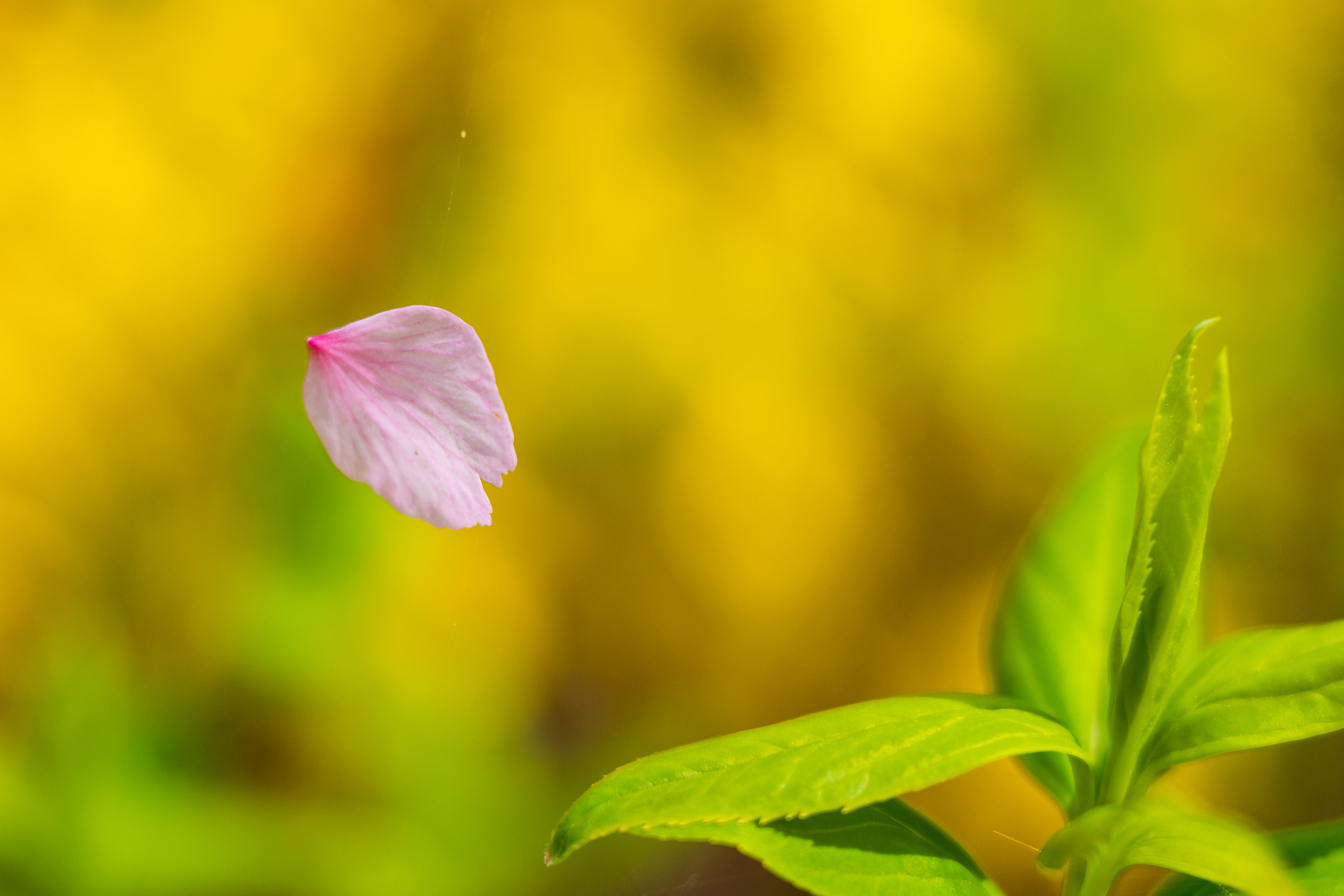 菜の花畑に張られた蜘蛛の巣にちょうど引っかかった桜の花びらを一枚。
