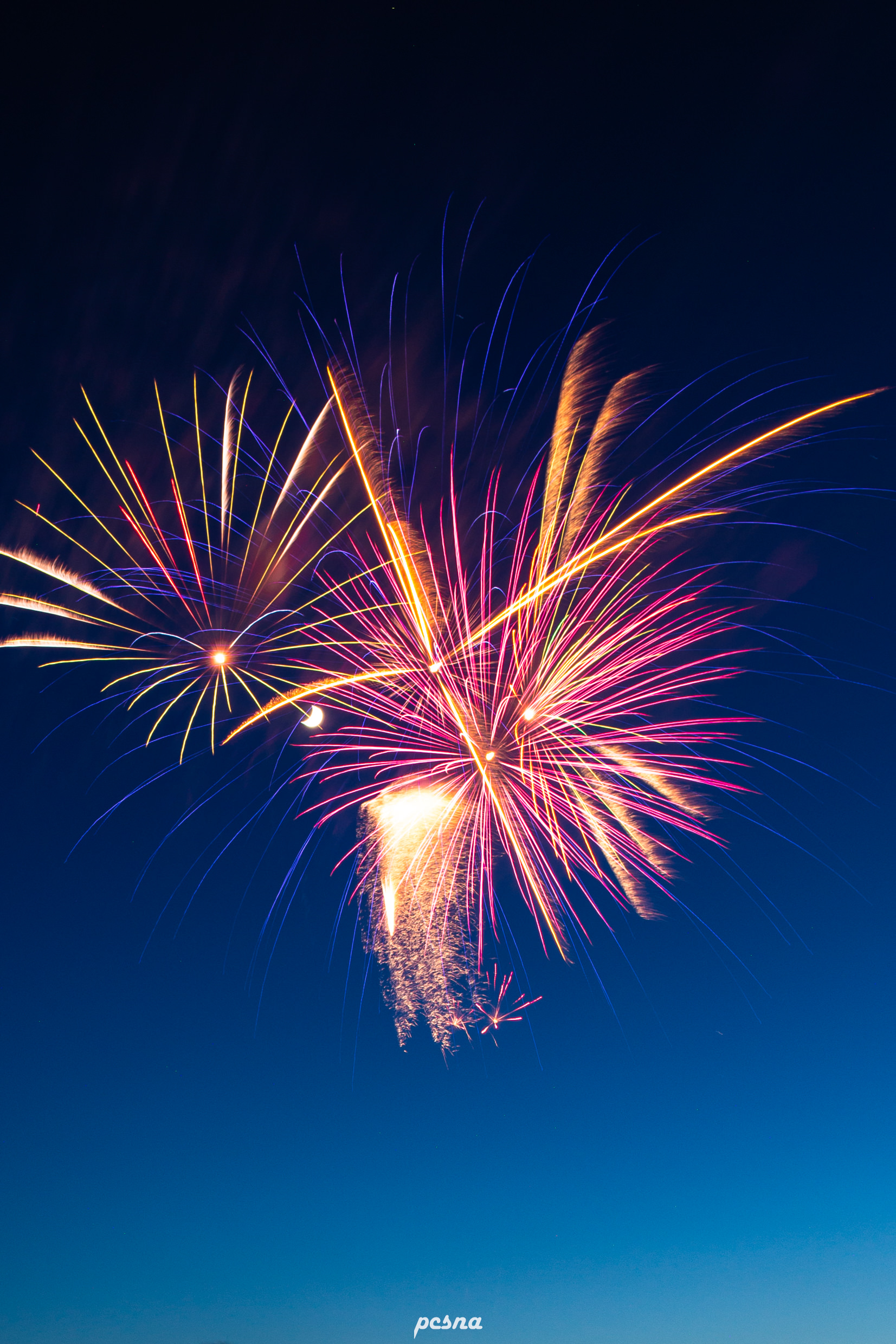 日が暮れる前、まだ明るさの残るグラデーションがかった夜空に打ち上がった鮮やかな花火が、まるでこれから夜に向かうように弾けている美しい光景。あえてクロップすることにより余計な要素を入れずに空と花火のコントラストが際立つようにしました。
