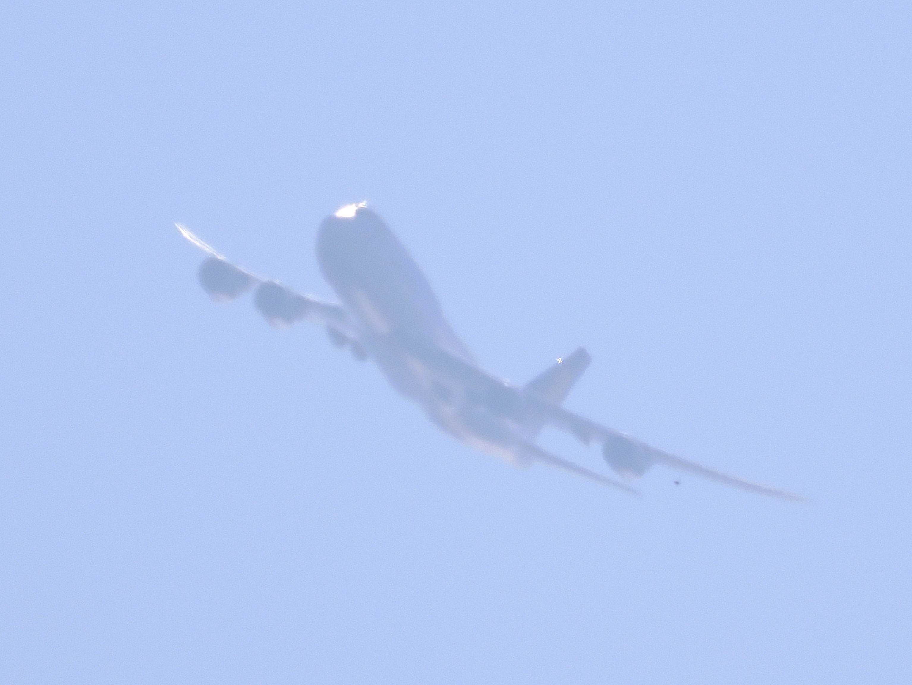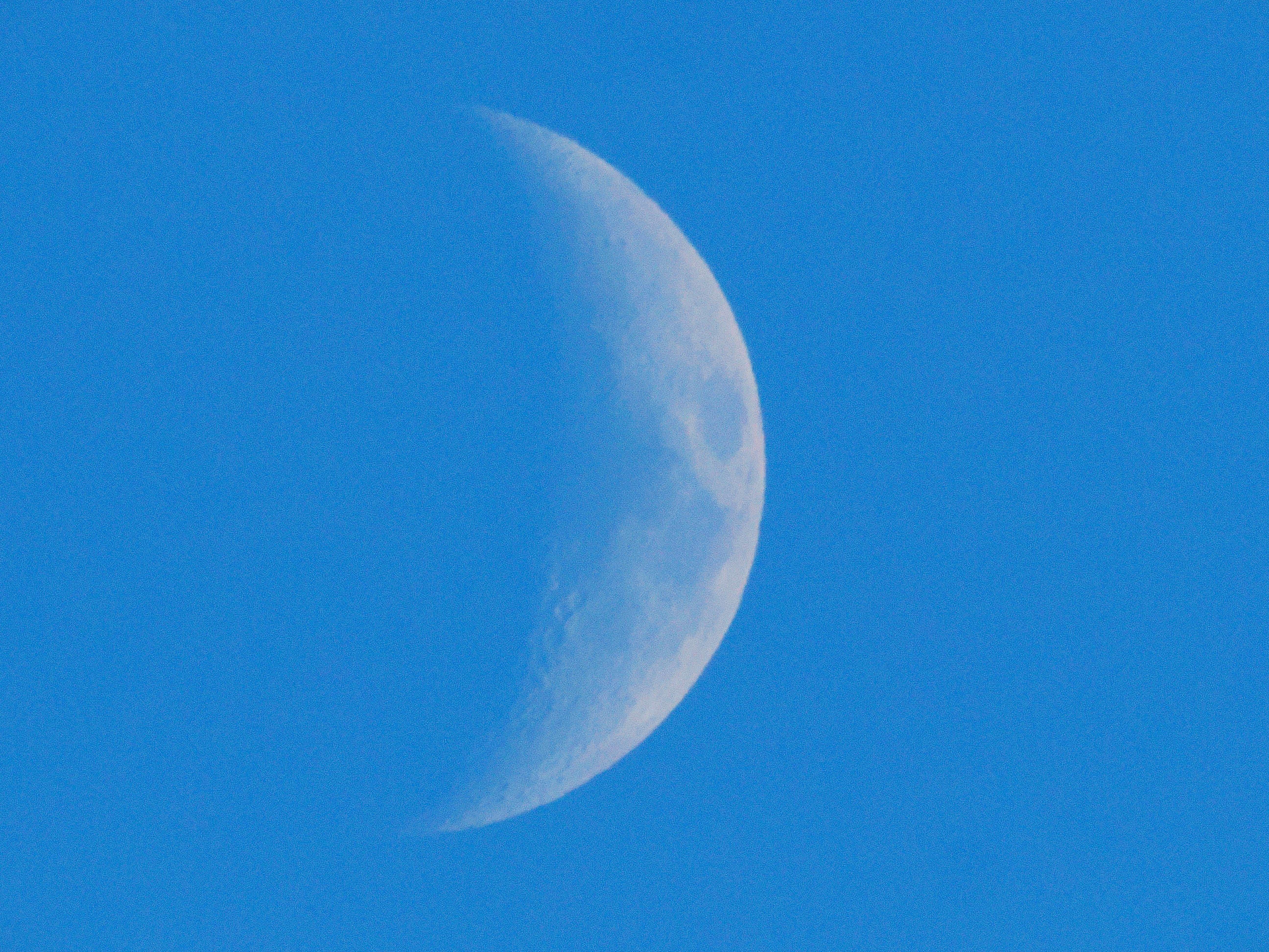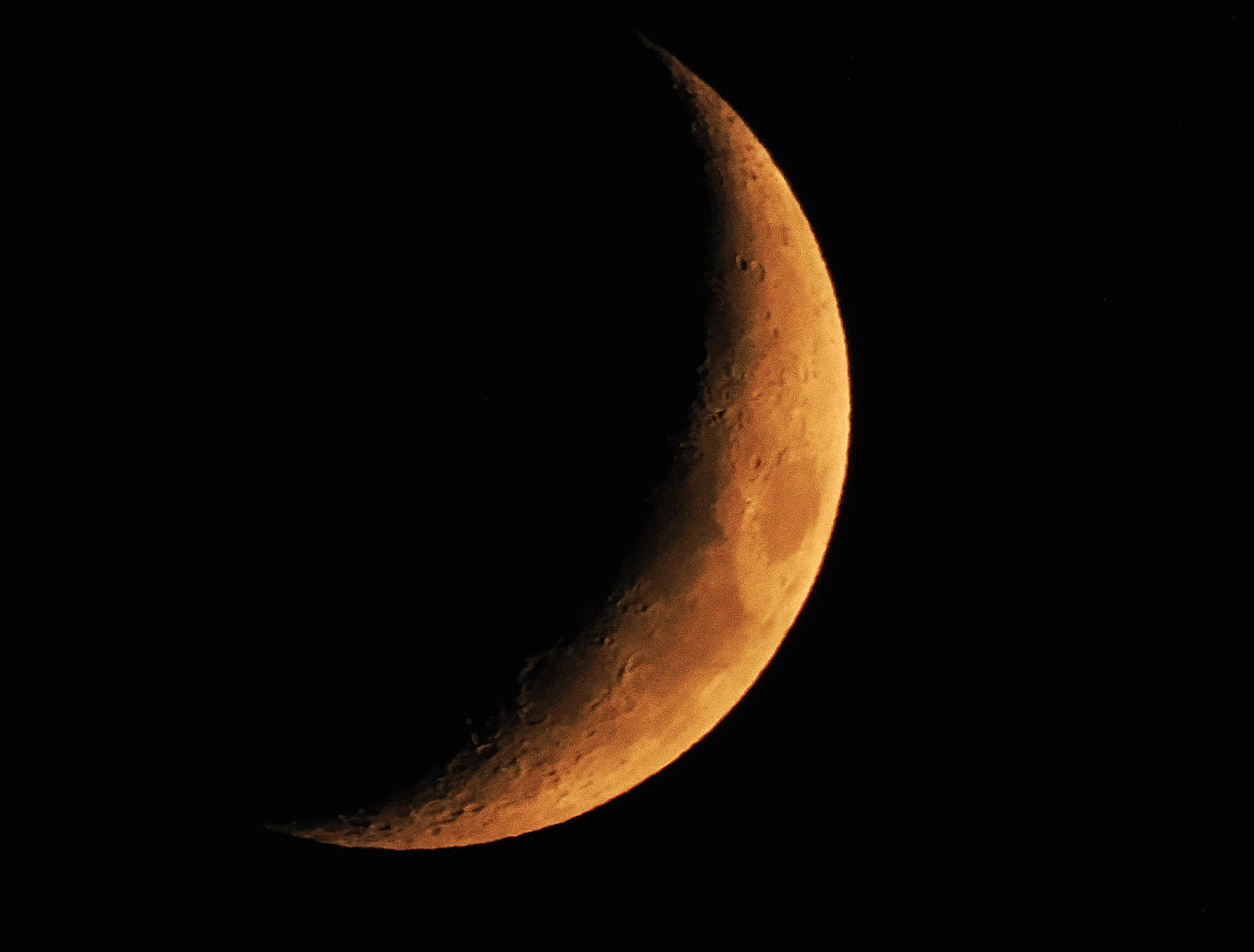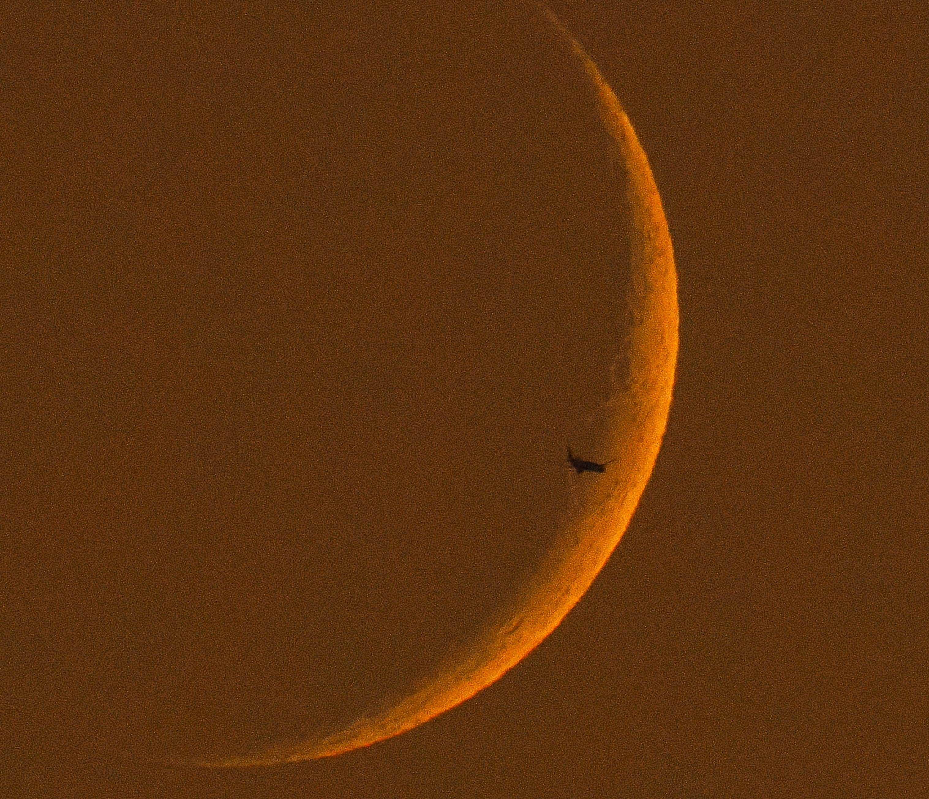 三日月の前を小さな旅客機が横切りました。