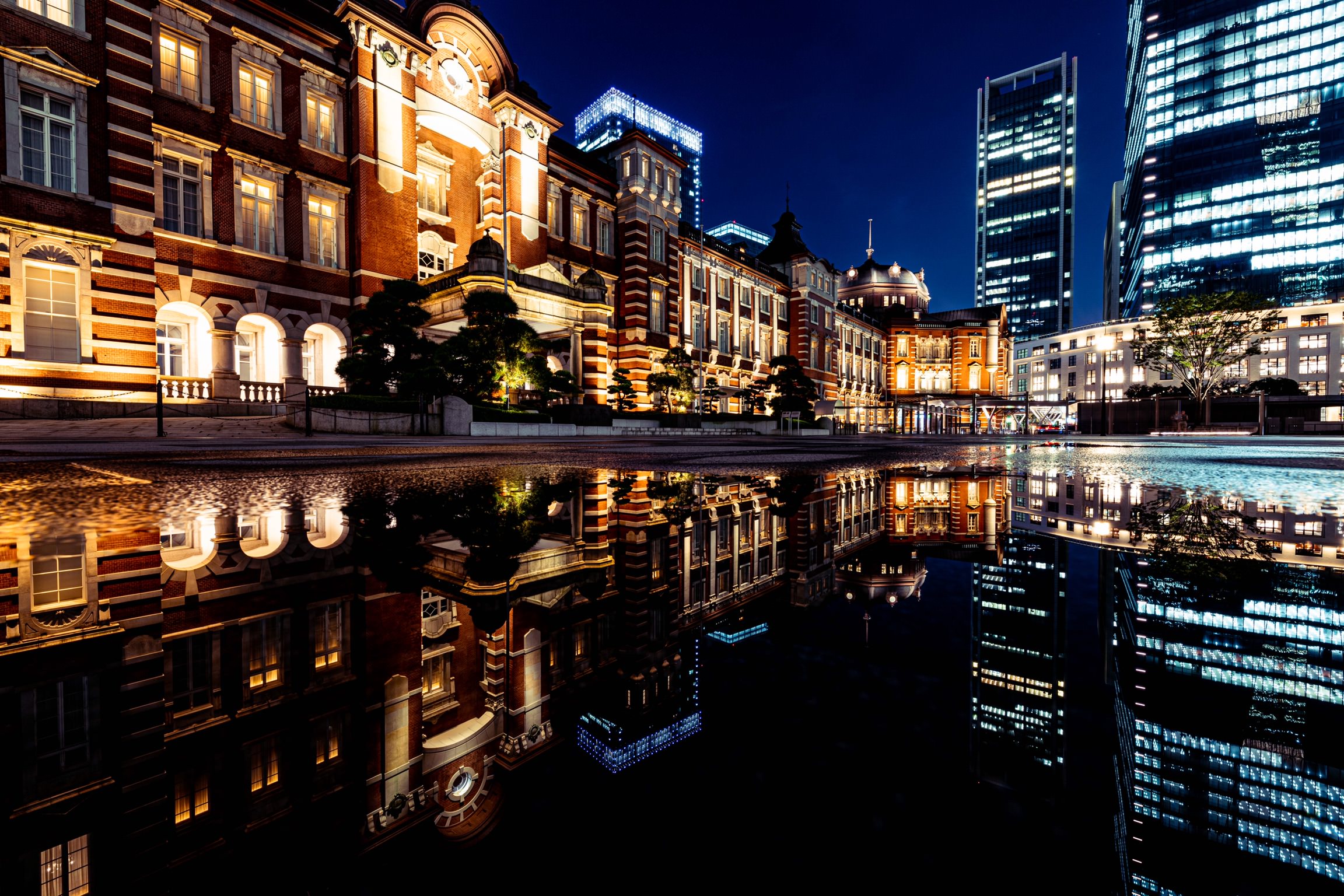 雨上がりの東京駅、水溜りに映る駅舎、ビルが美しかった
