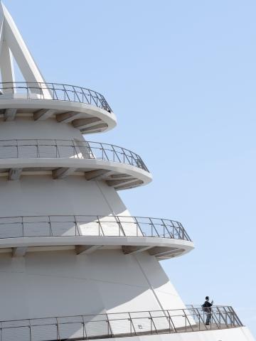 頂上に向けて螺旋状にスロープが続く建造物にて、それを上る途中に写真撮影を行う人を撮影した。建造物が織りなす幾何学的な構図の中に、日常行動である写真撮影をする人が入ることで印象的なビジュアルになったと思う。
