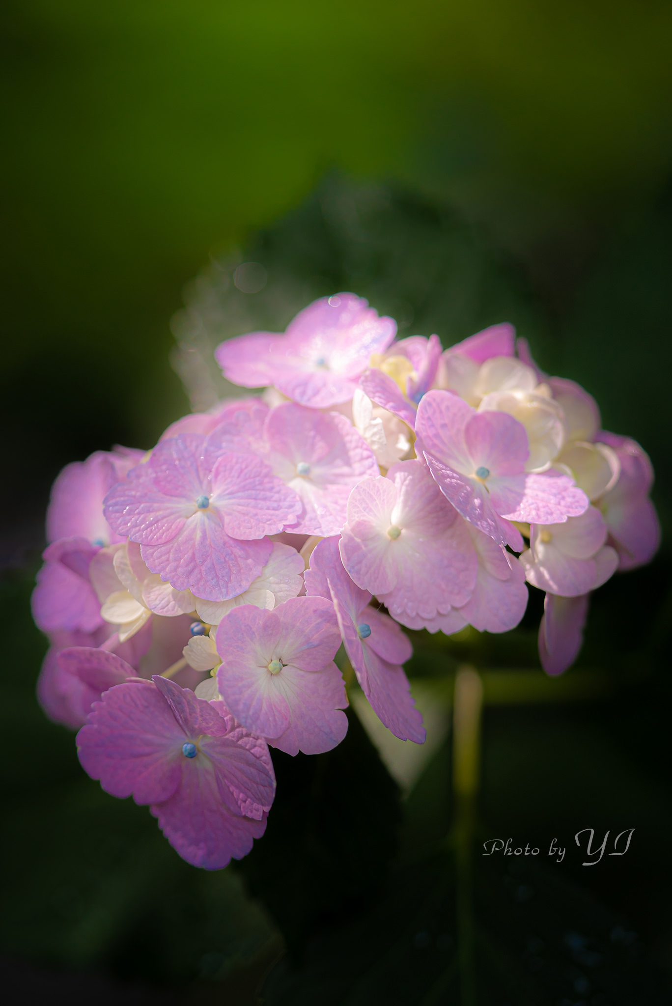 雨上がりの御池通。歩道にできた水たまりに、紫陽花や木々が映り込み緑があふれていました。