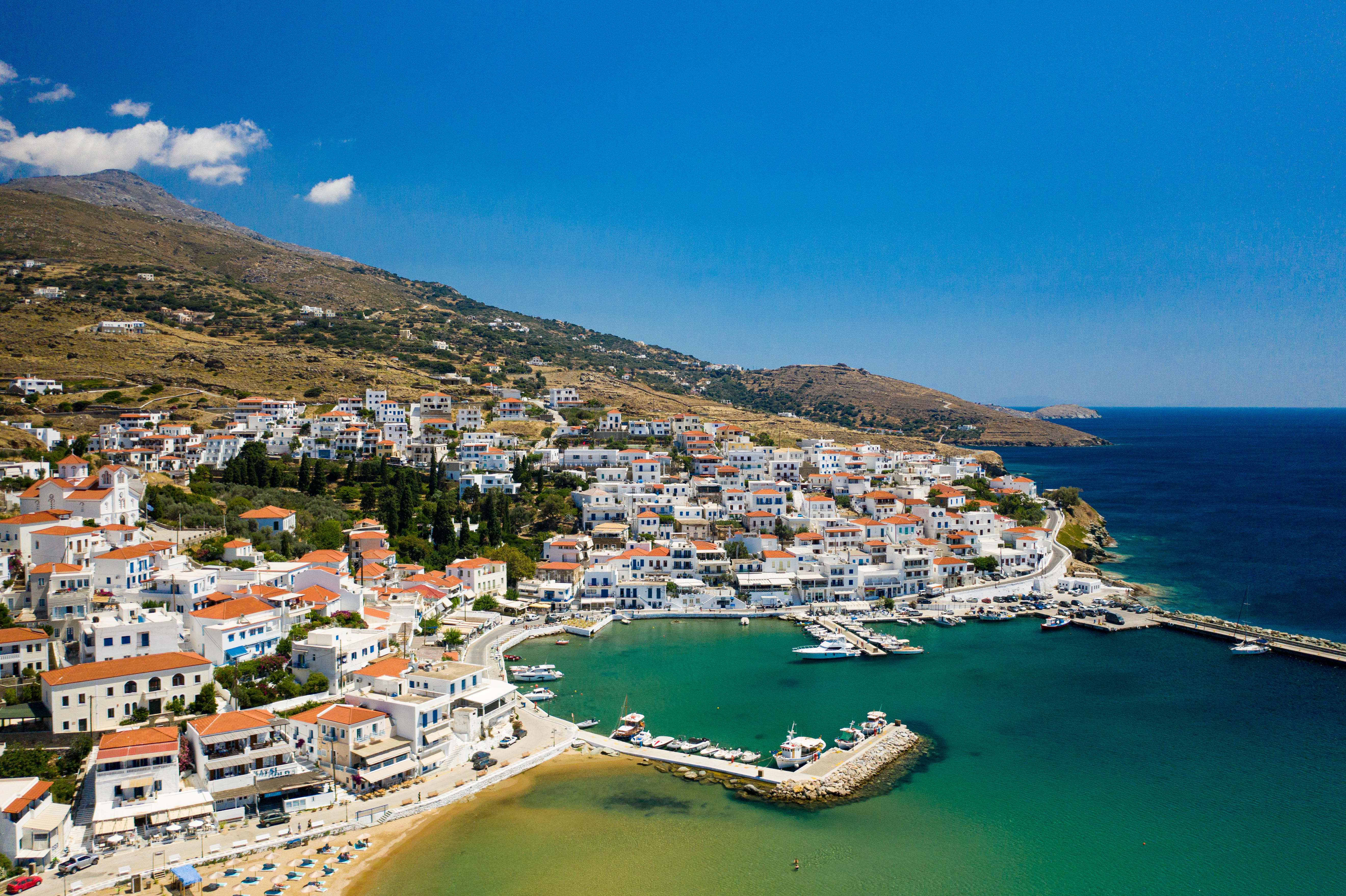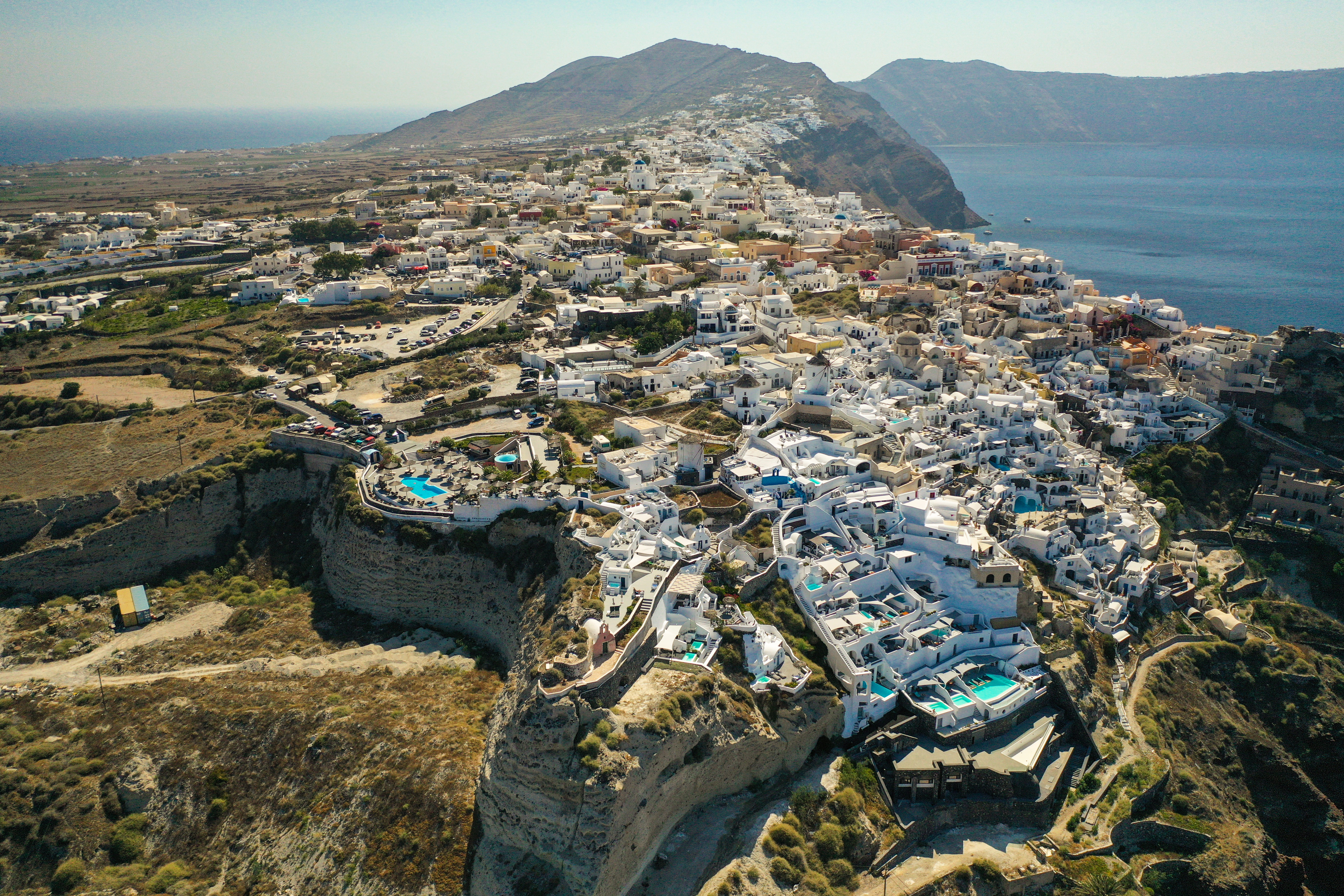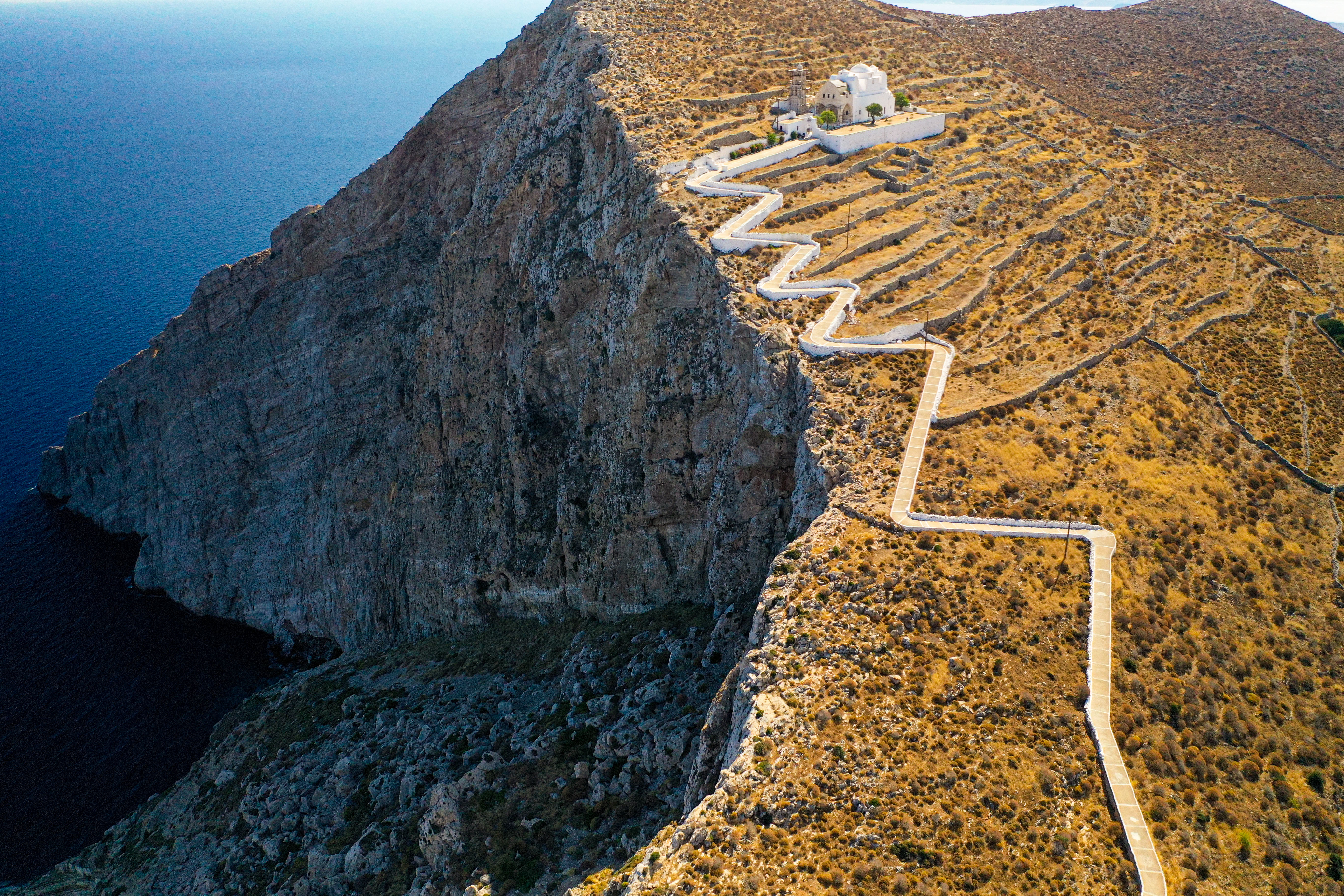 フォレガンドロス島はエーゲ海の中では比較的マイナーな島で観光客もサントリーニやミコノスに比べるとずっと少ない。しかし、ここにはエーゲ海有数の絶景がある。この小さなギリシャ正教の修道院も人気のスポット。早朝に空撮すると崖のひなたと日陰のコントラストがとても綺麗に撮れる