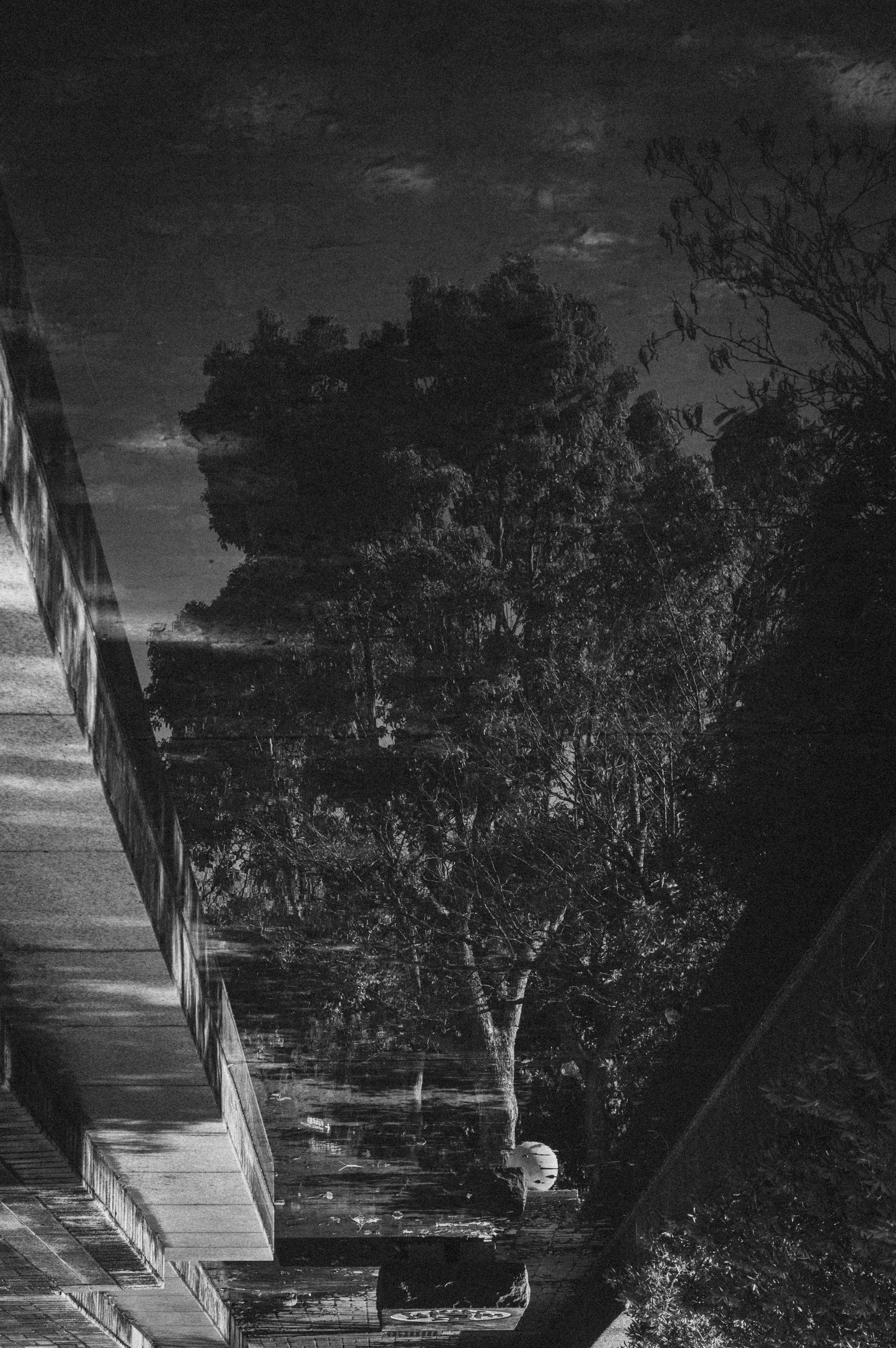 公園のちょっとした水路に綺麗に反射する木を見つけて50mmで切り取りました。モノクロにしてみるとまるで鉛筆画のようになりました。
