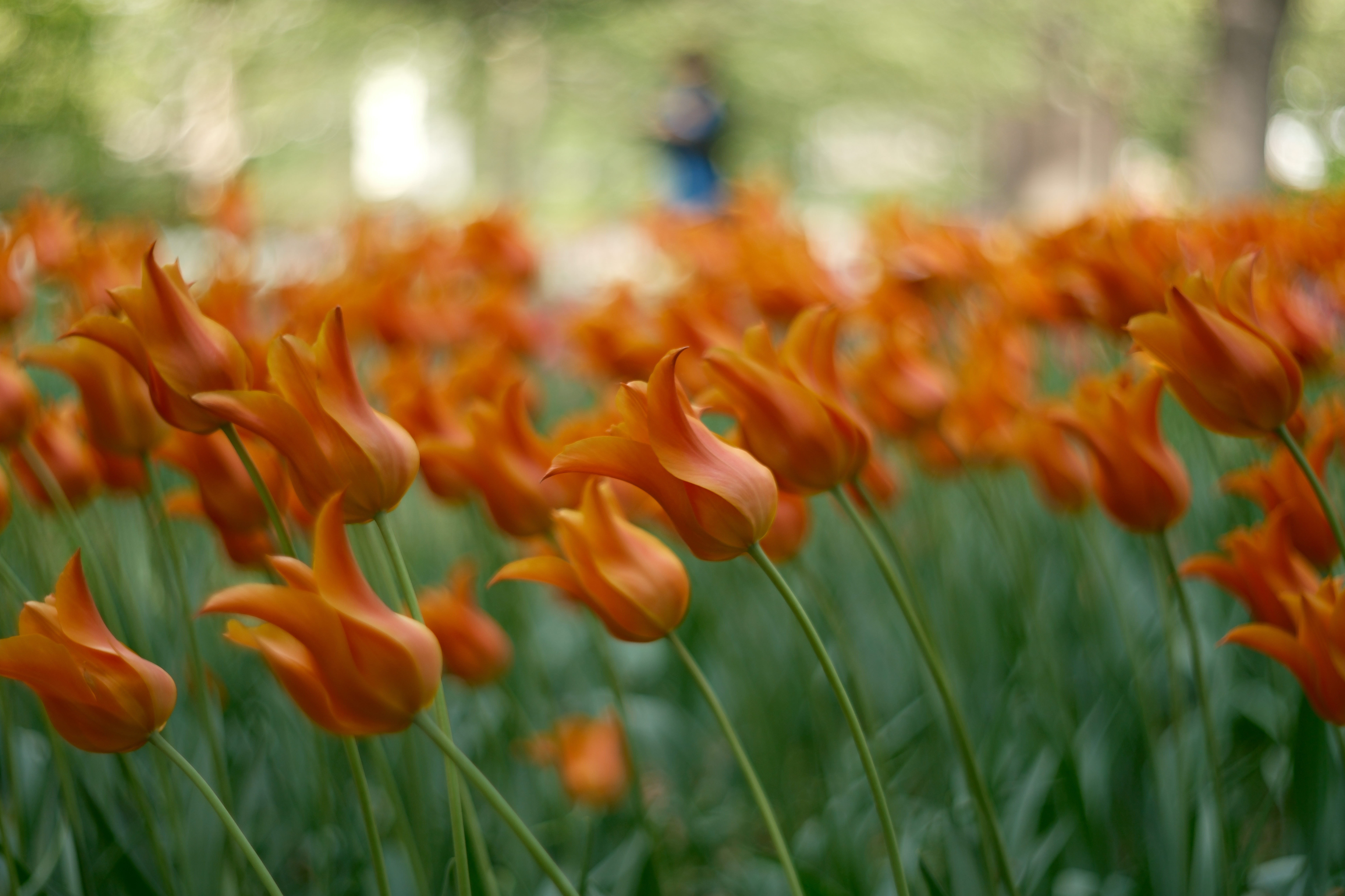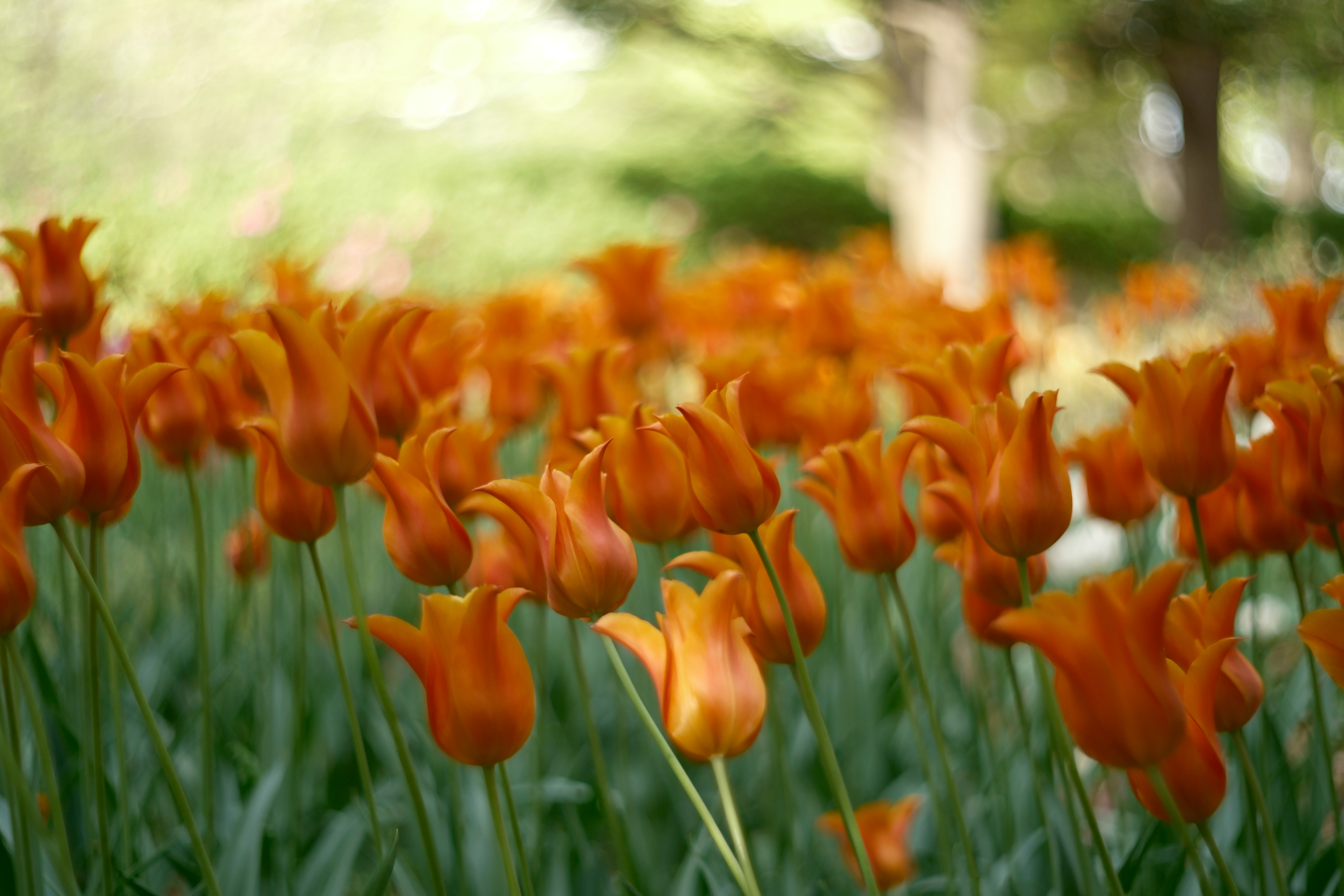 公園の雑木林の間にチューリップが植えられていて、木漏れ日に照らされていました。ボケの強いレンズで撮影してみました。