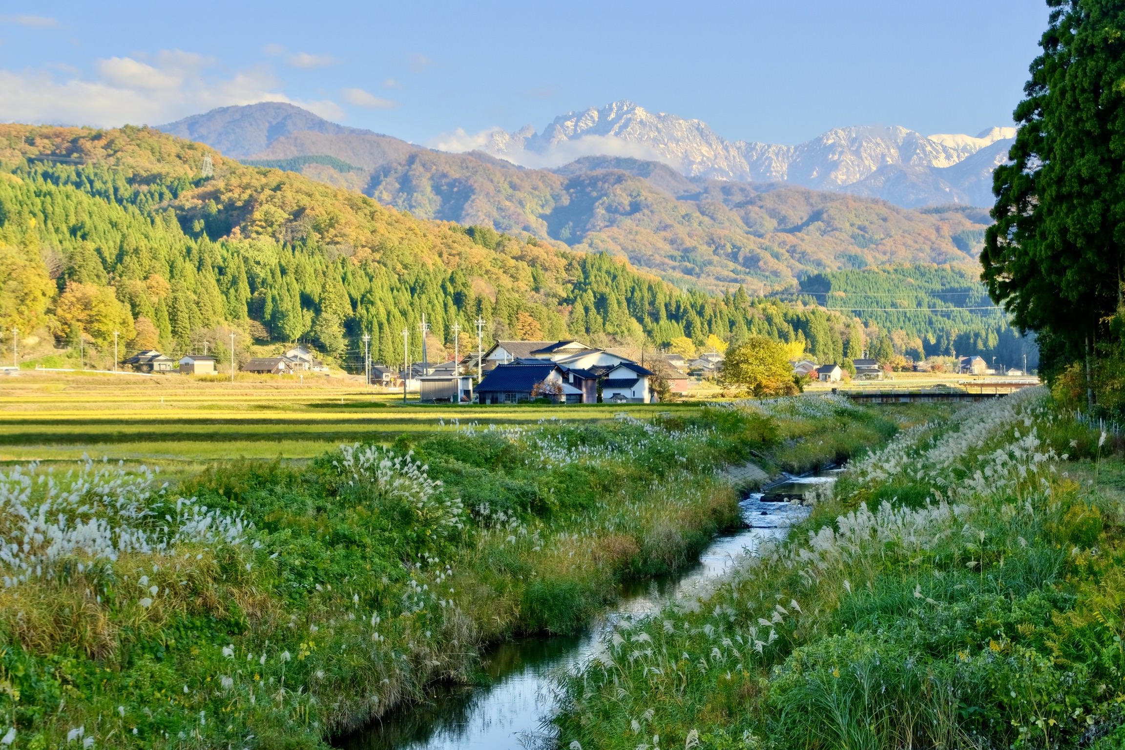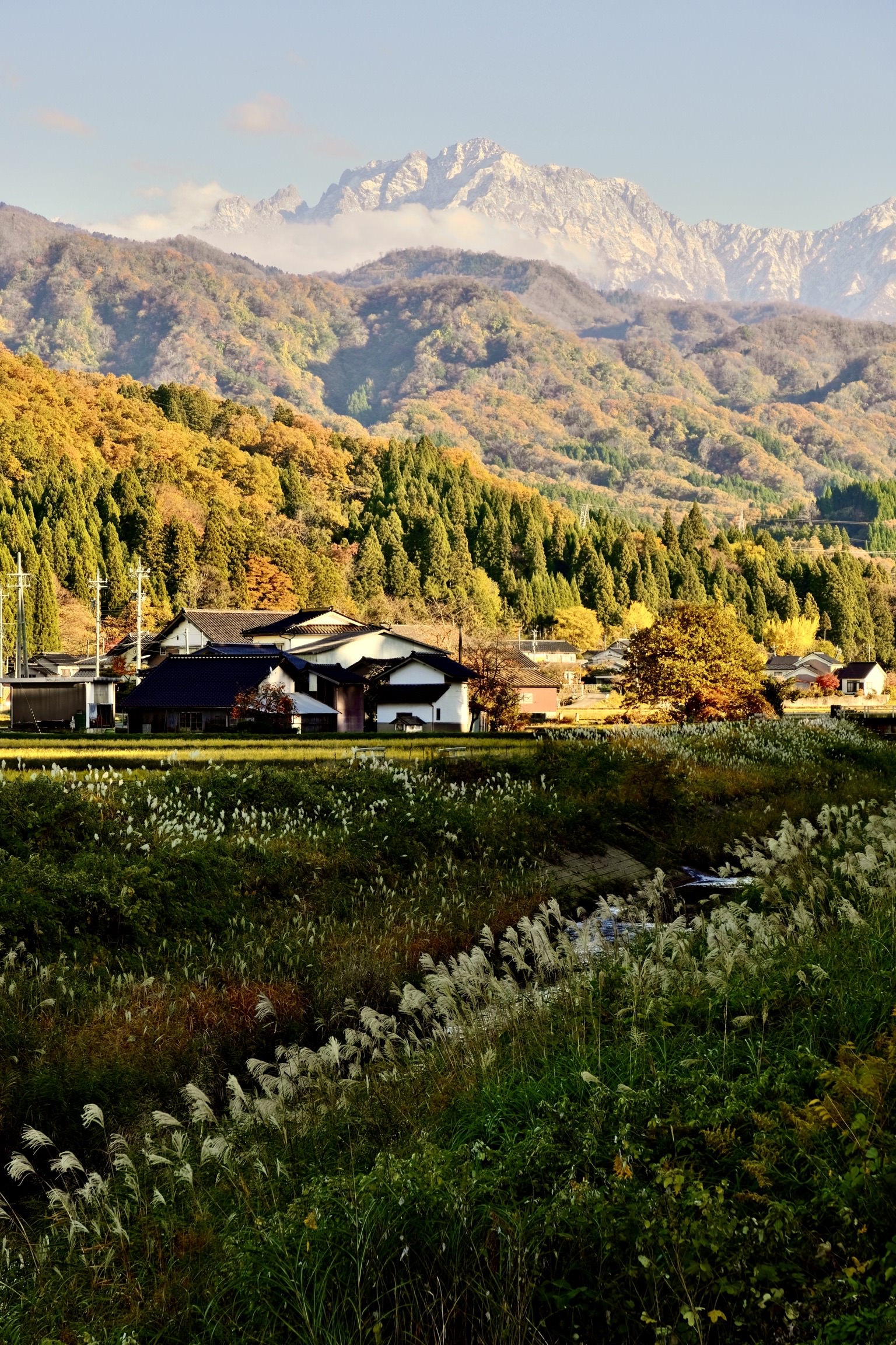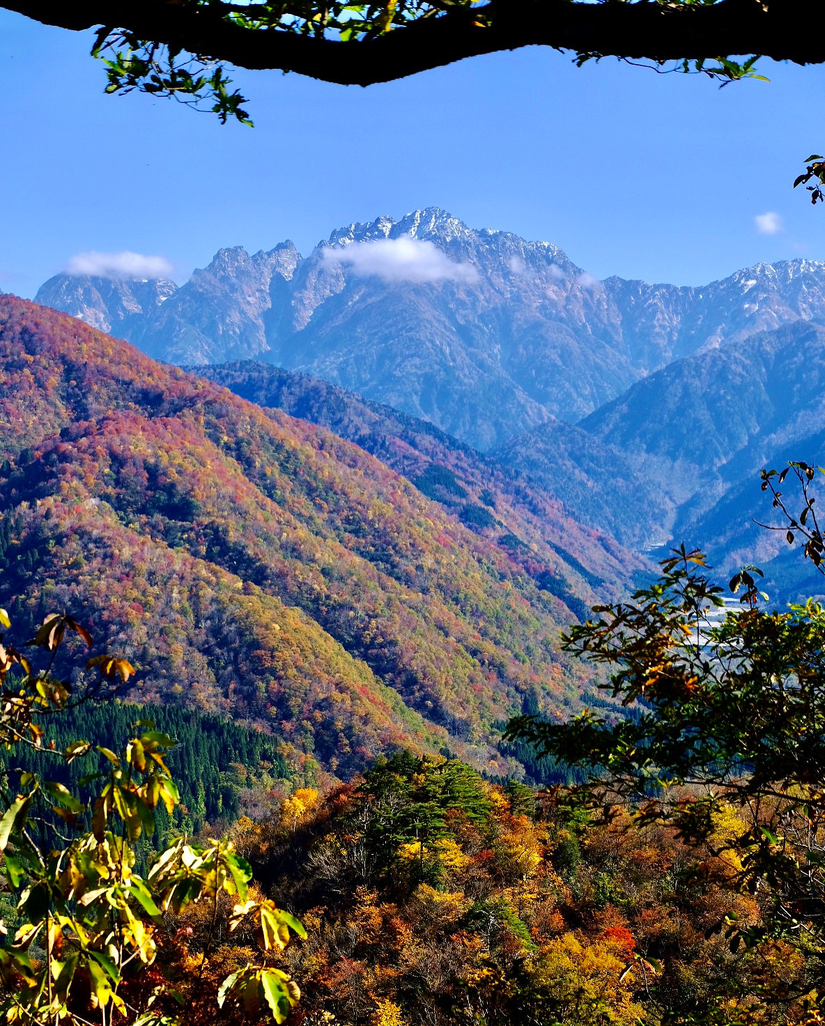 積雪の剱岳と麓の紅葉