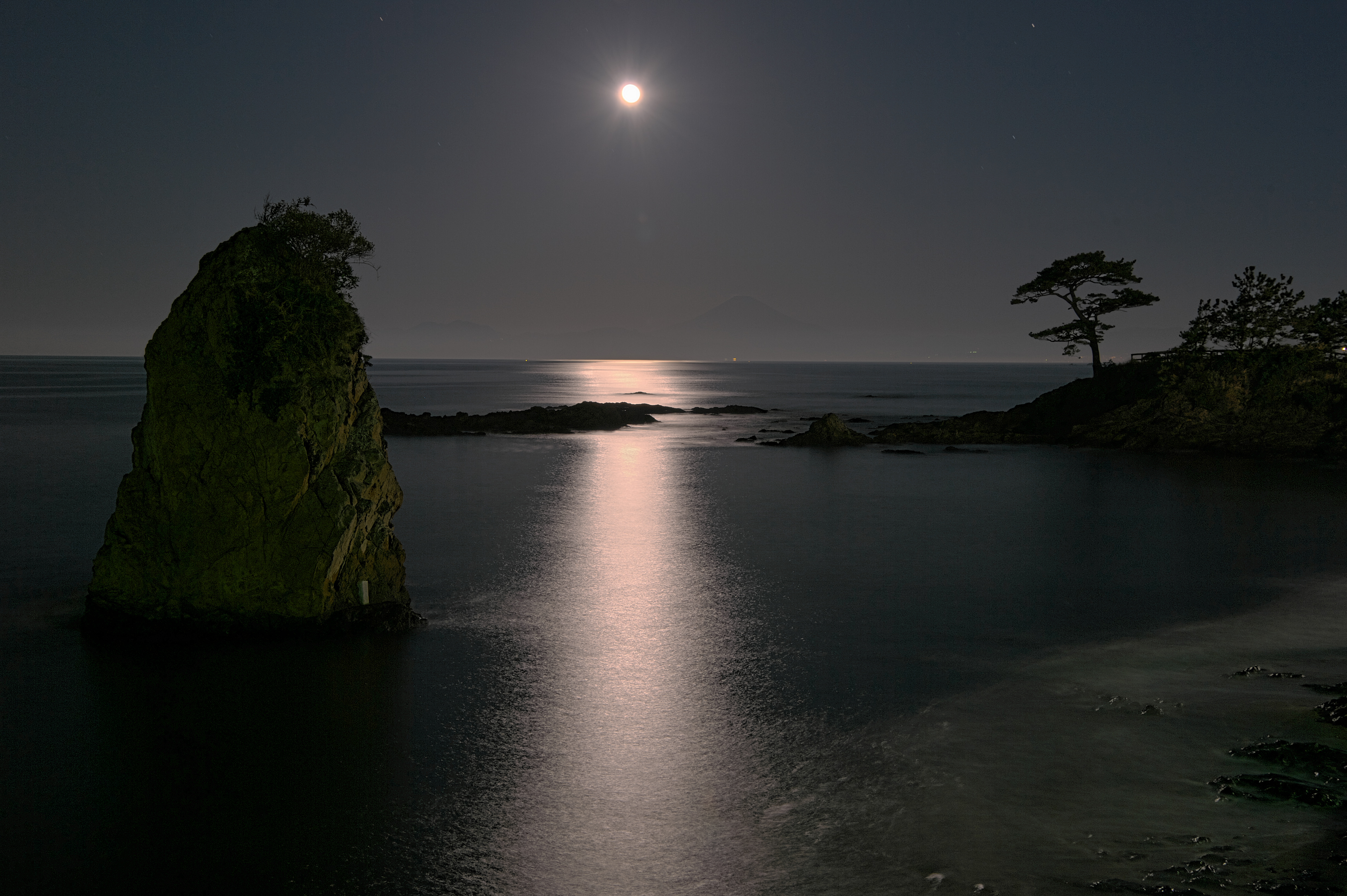 でも私はそれよりも少し外れた位置の方が好みだ。 月は案外速く動くので長秒での撮影はし難いが、広角にすれば少し長く撮れ、滑らかな水面ができる。 そのバランスが難しい。