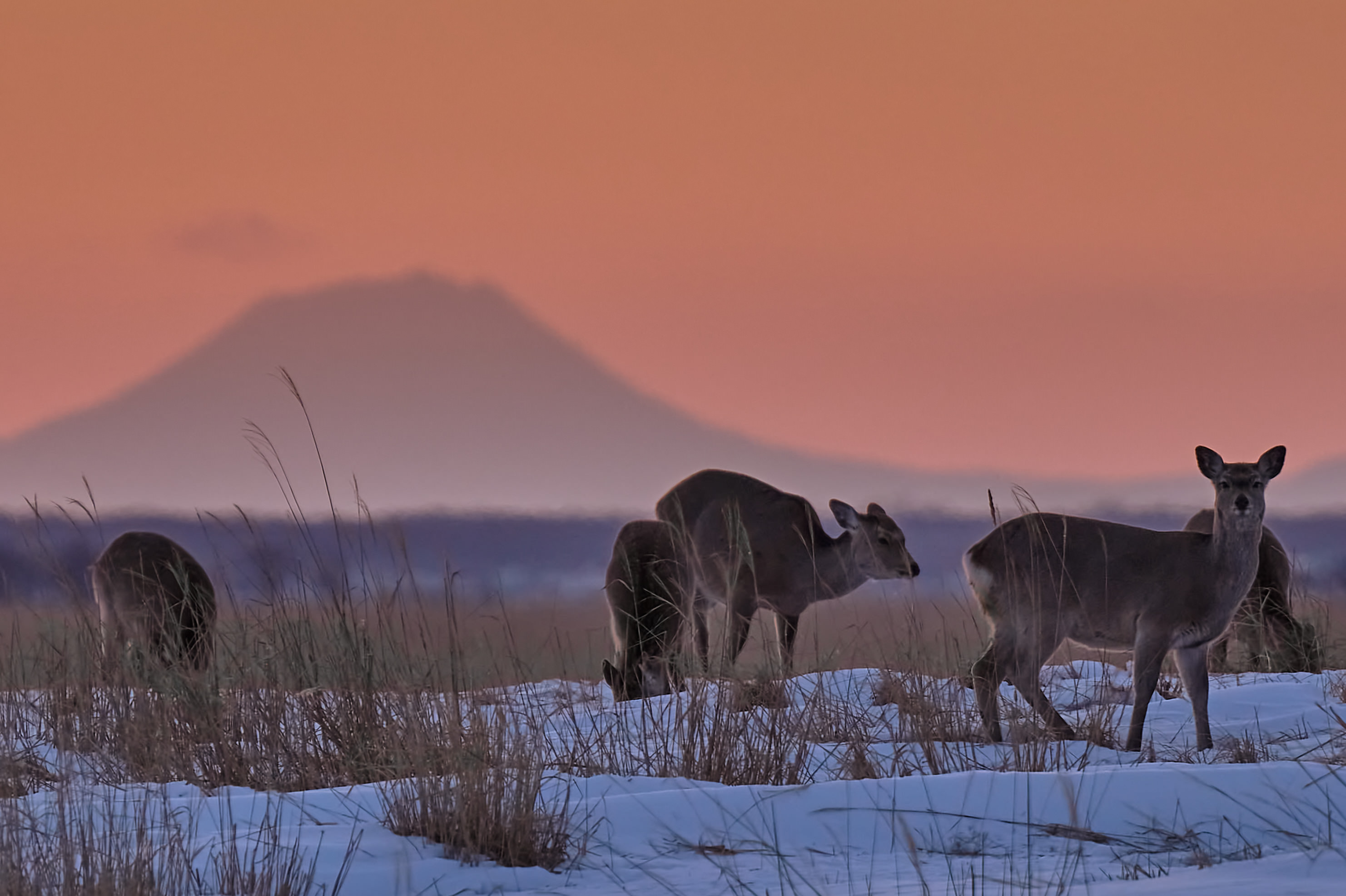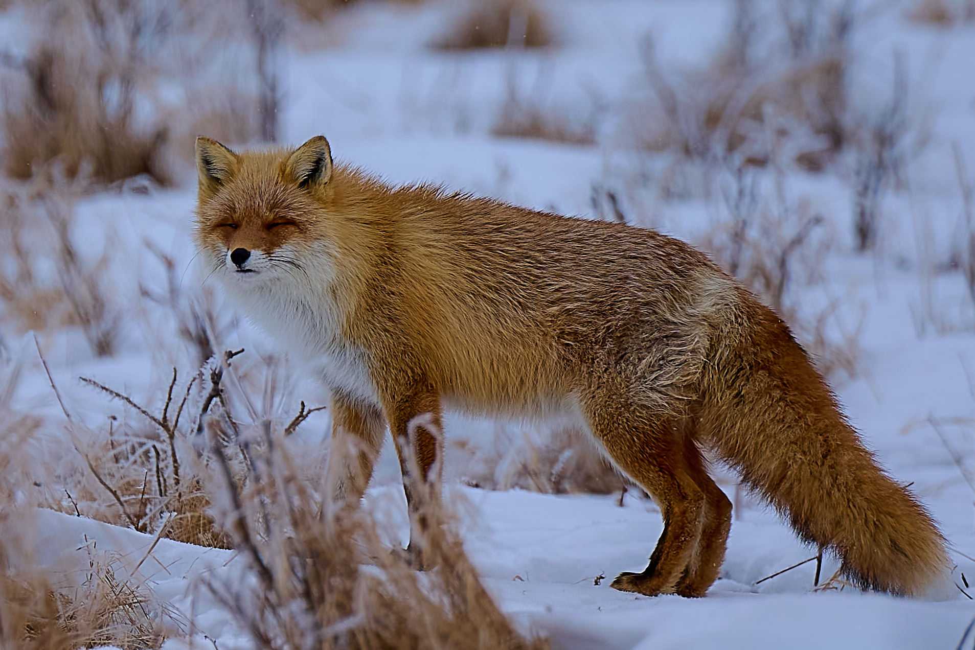 じっとこちらの様子を伺っていたキタキツネはパシャパシャ撮っている間に微笑んだ。