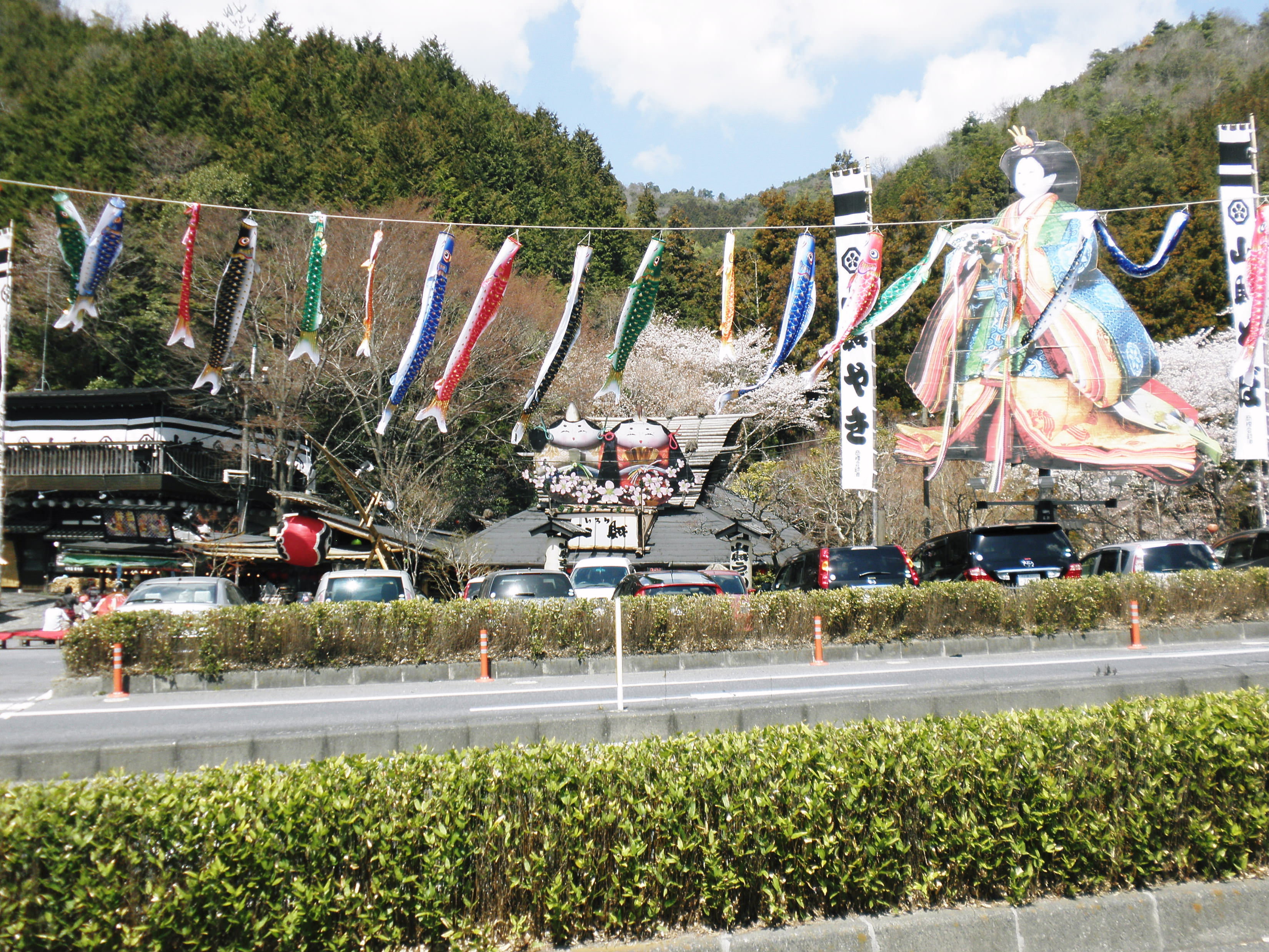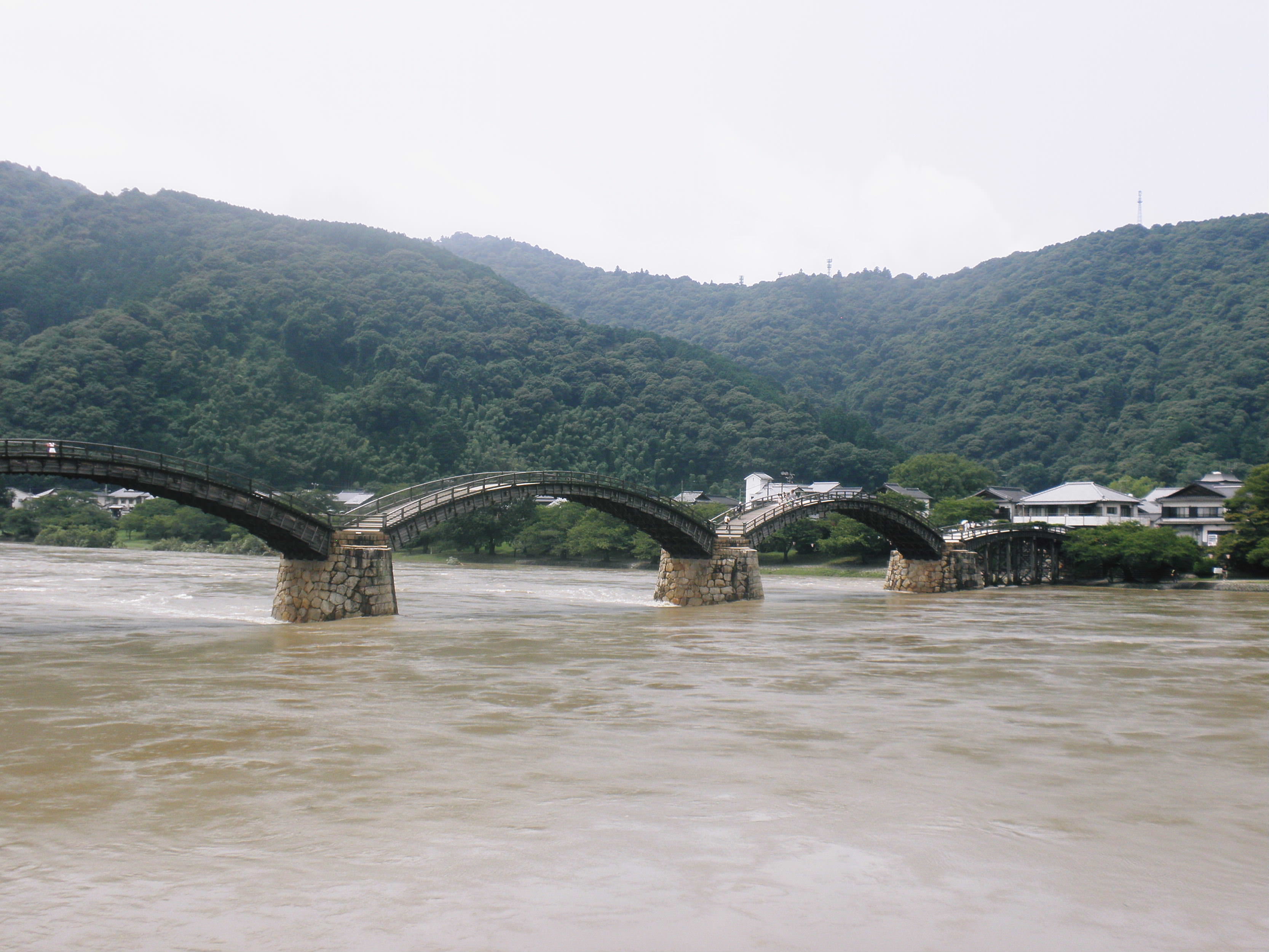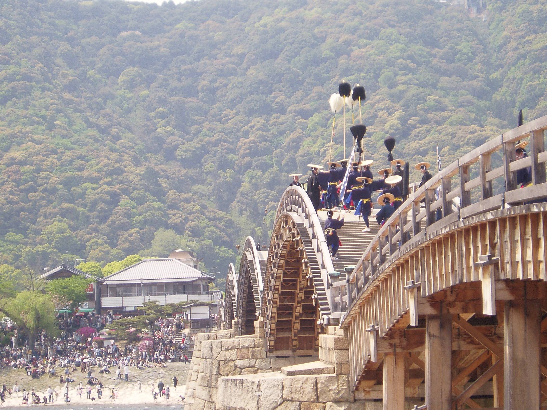 例年の4月29日に催される”錦帯橋まつり” 写真は「大名行列” 城山を背景にして、行列姿が好く映える。