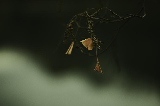 リョウブの実に絡まった三枚のイチョウ葉